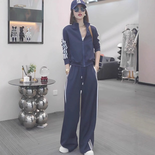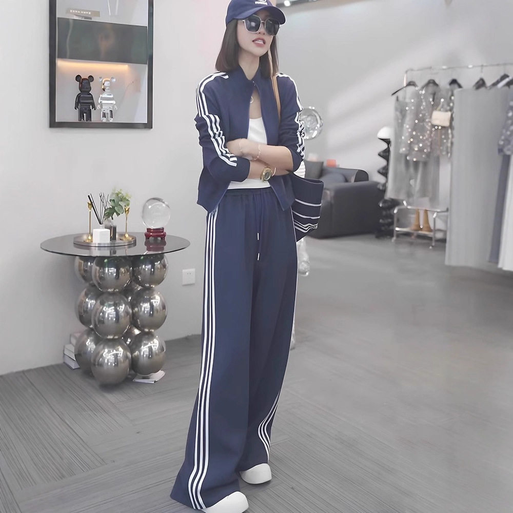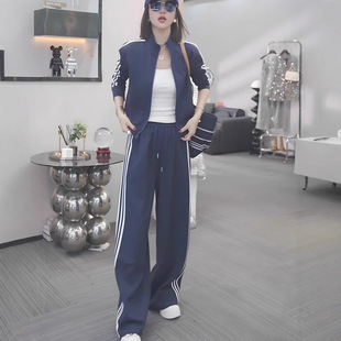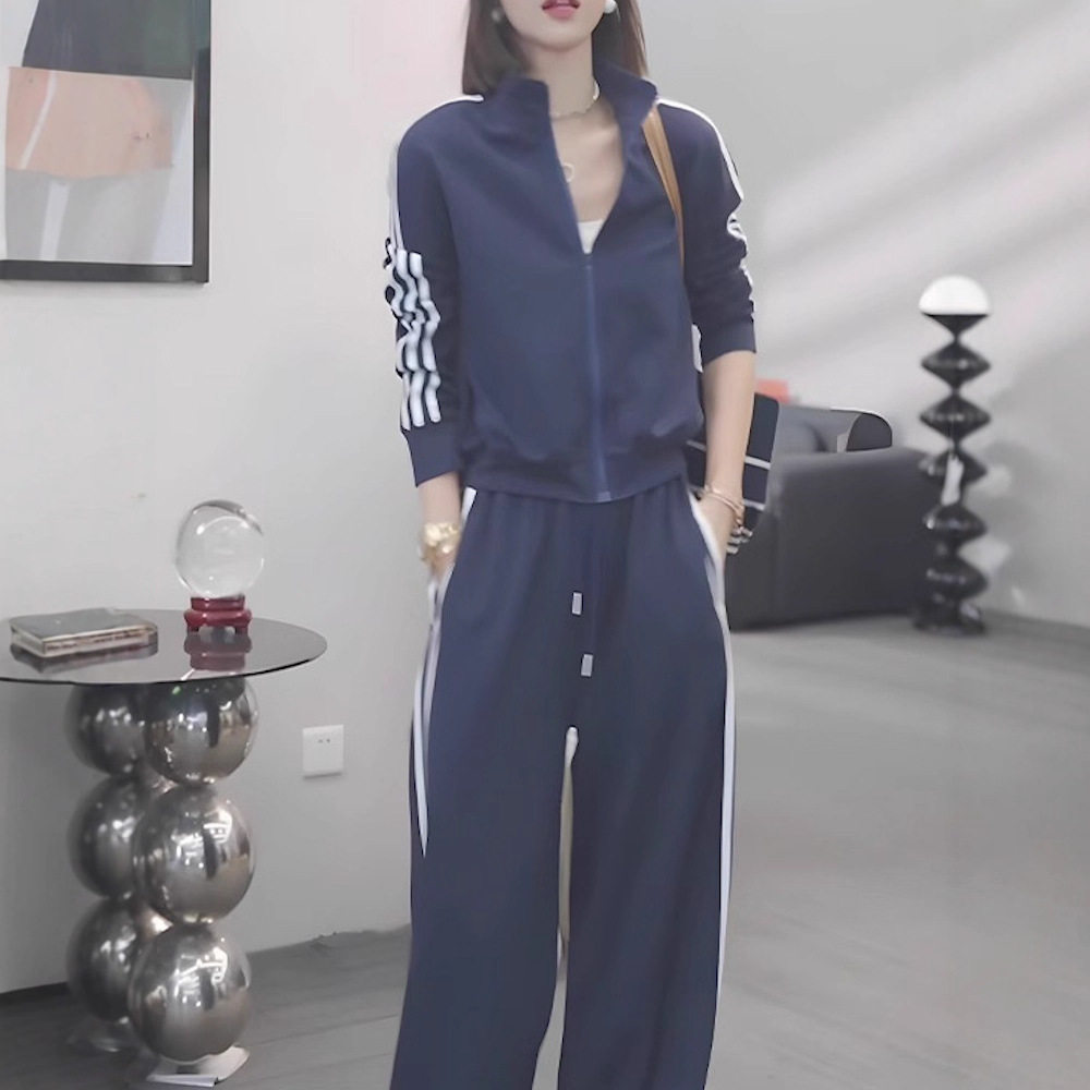 运动训练条纹拼接撞色立领外套高腰直筒休闲长裤 潮流两件套女 时尚