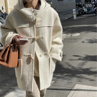 韩国theable牛角扣大衣羊绒连帽中长款 冬加厚学院风羊毛呢外套女