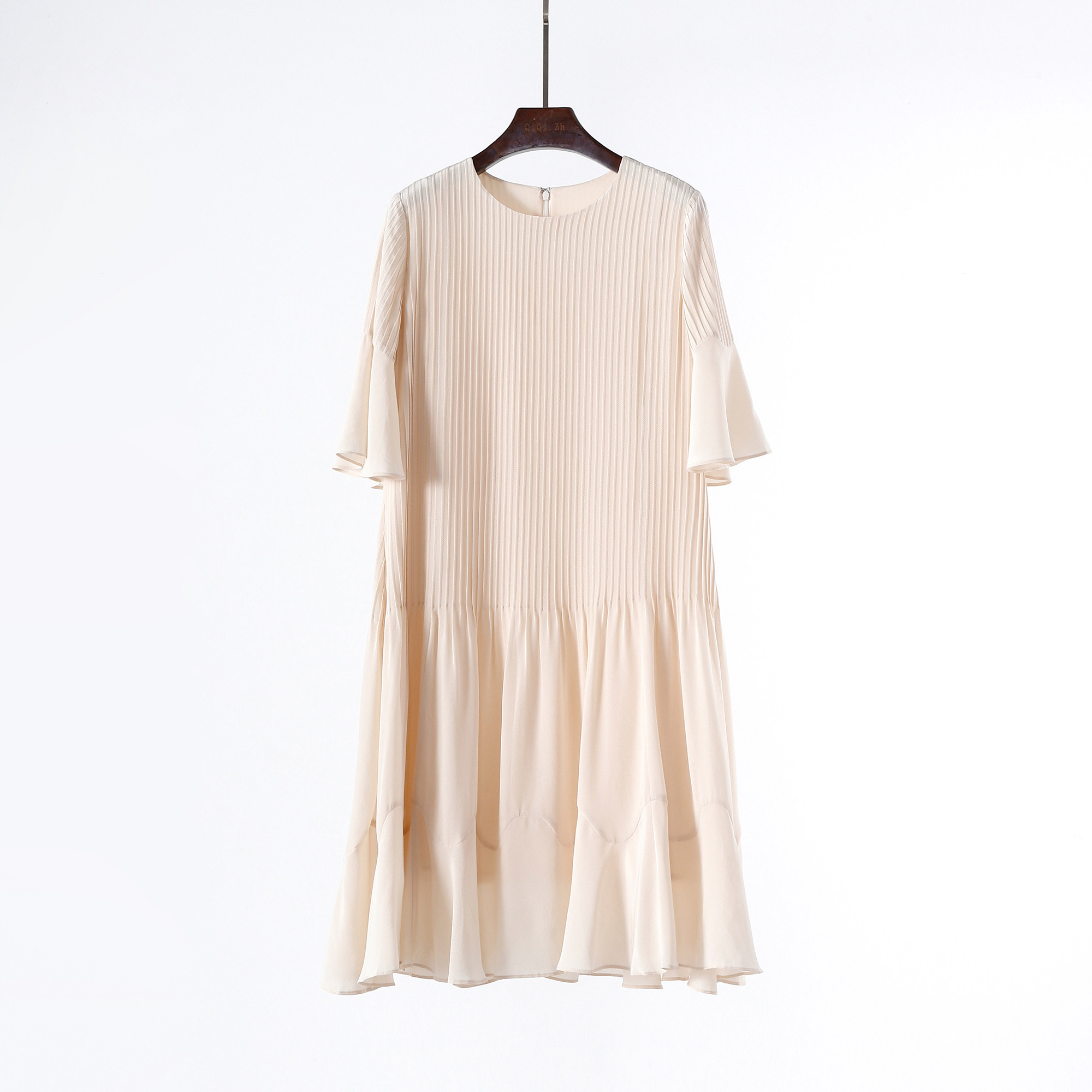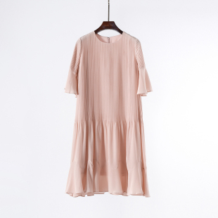 气质女士中长裙 连衣裙女喇叭袖 风琴褶 真丝桑蚕丝褶皱宽松短袖