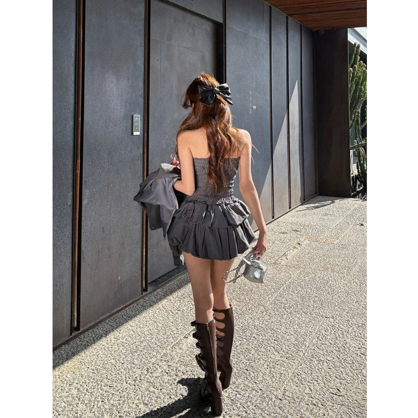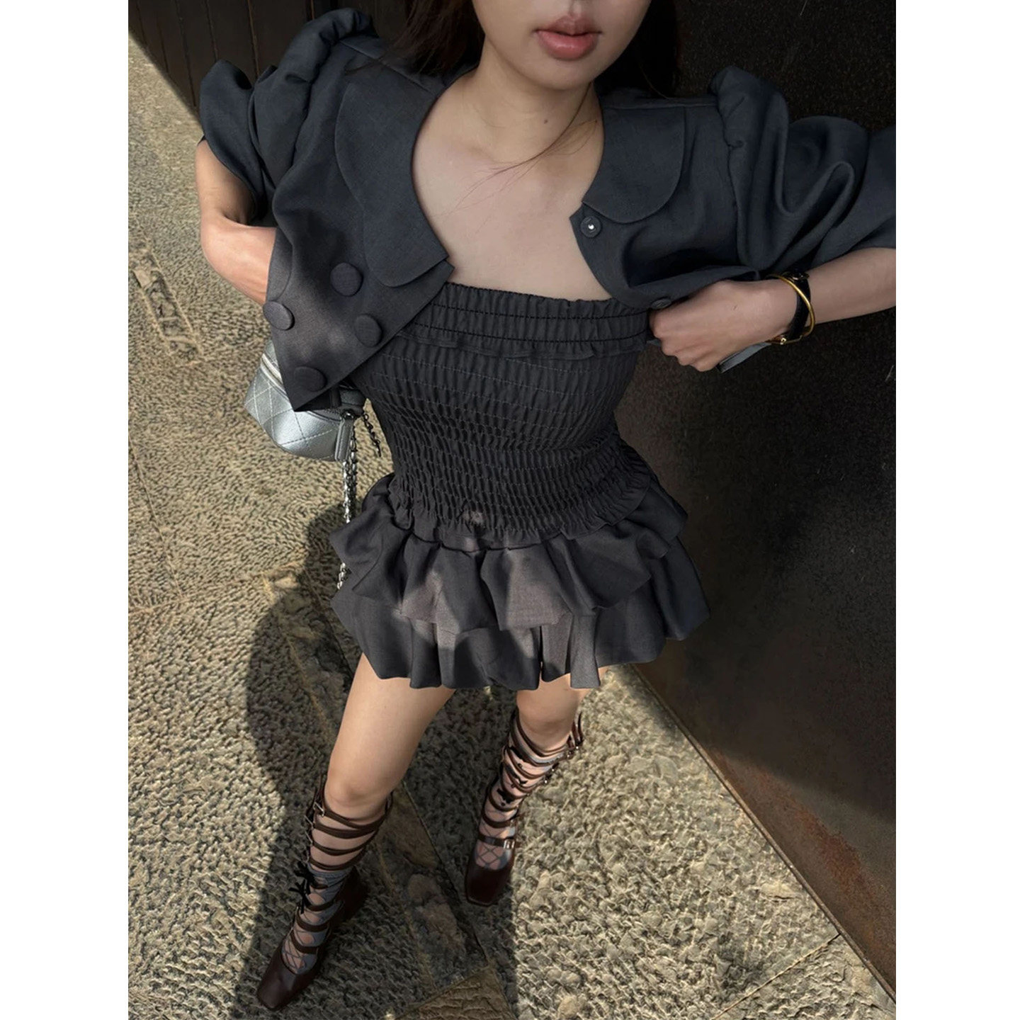抹胸花苞裙裤 坎肩上衣女26年夏季 三件套 微胖韩系辣妹灰色西装 XZY