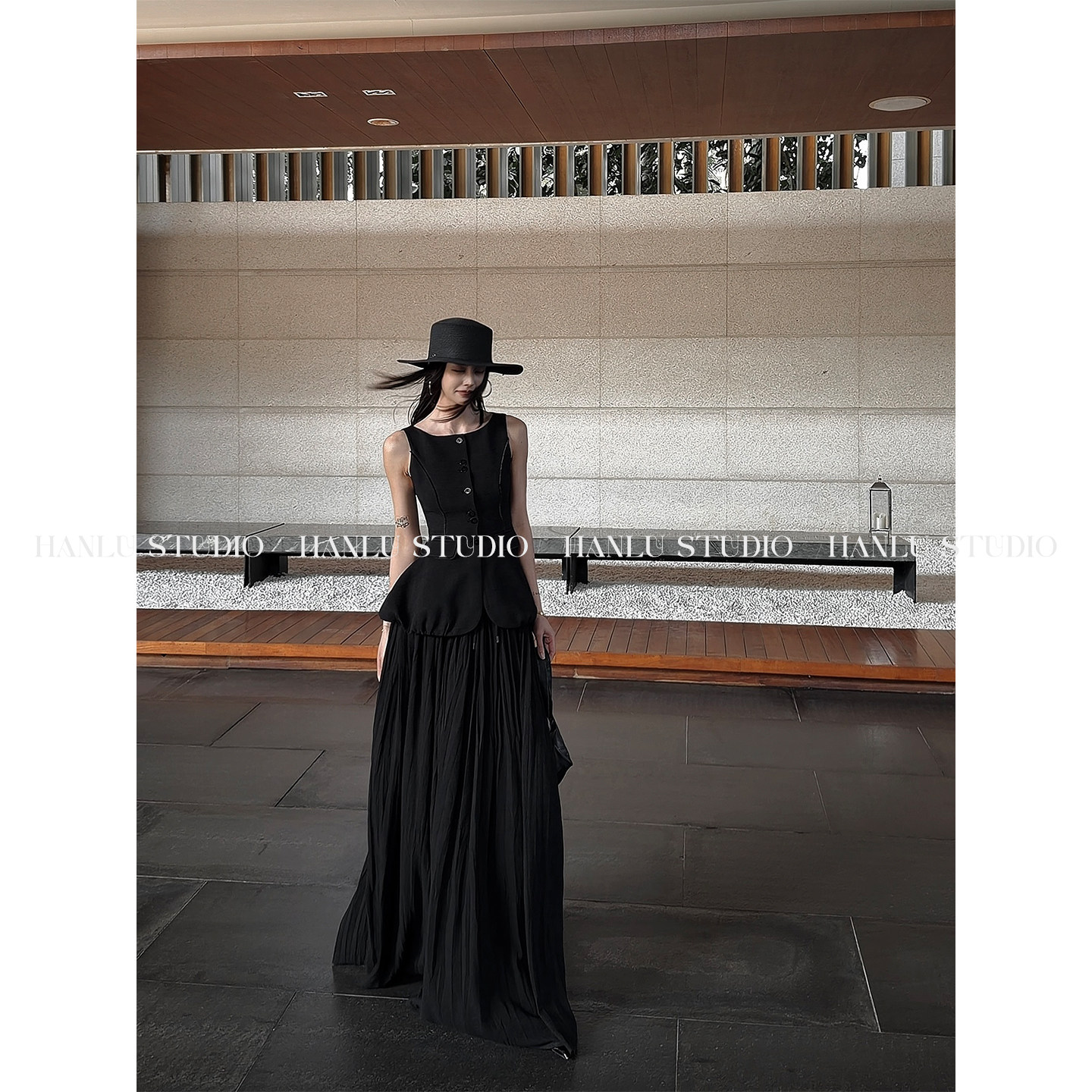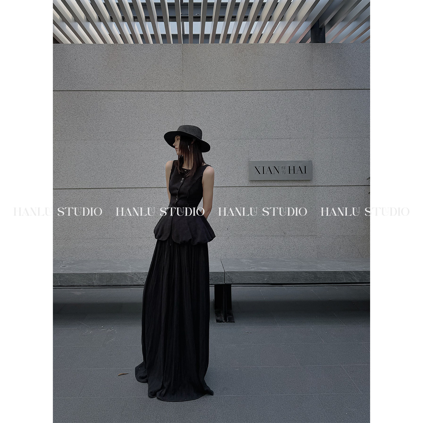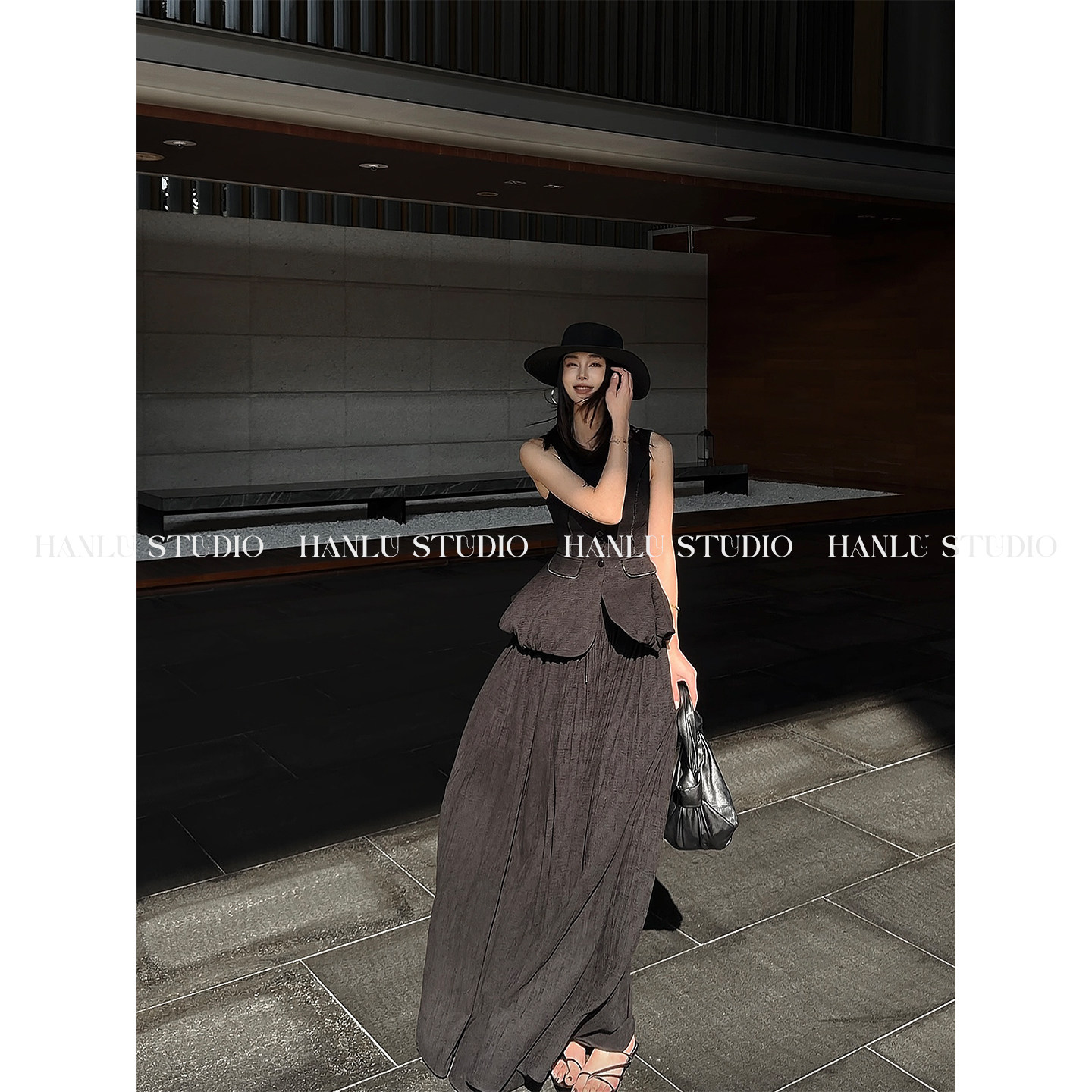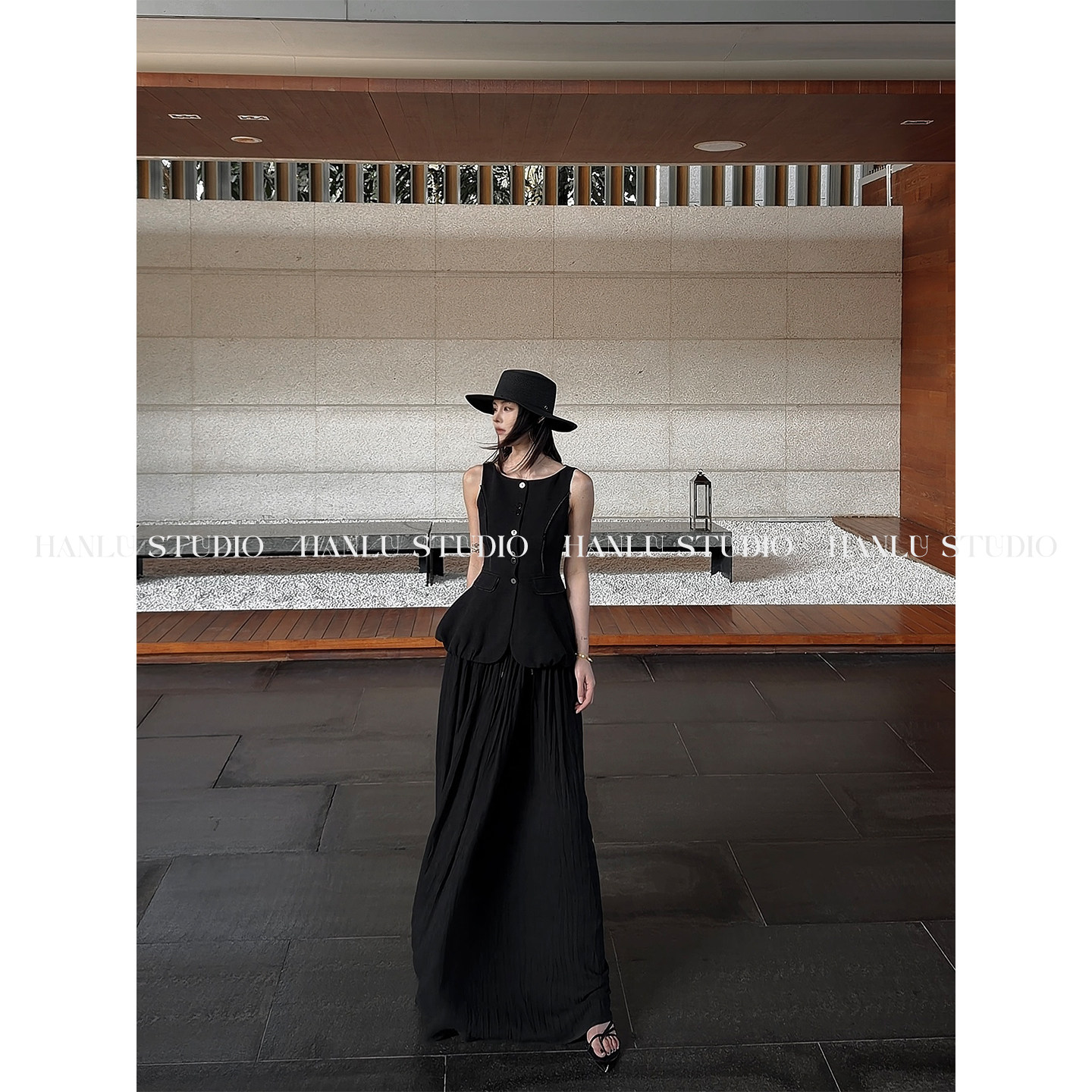 HANLU STUDIOss26立裁收腰显瘦拼接织带花苞伞摆黑色棉麻马甲上衣