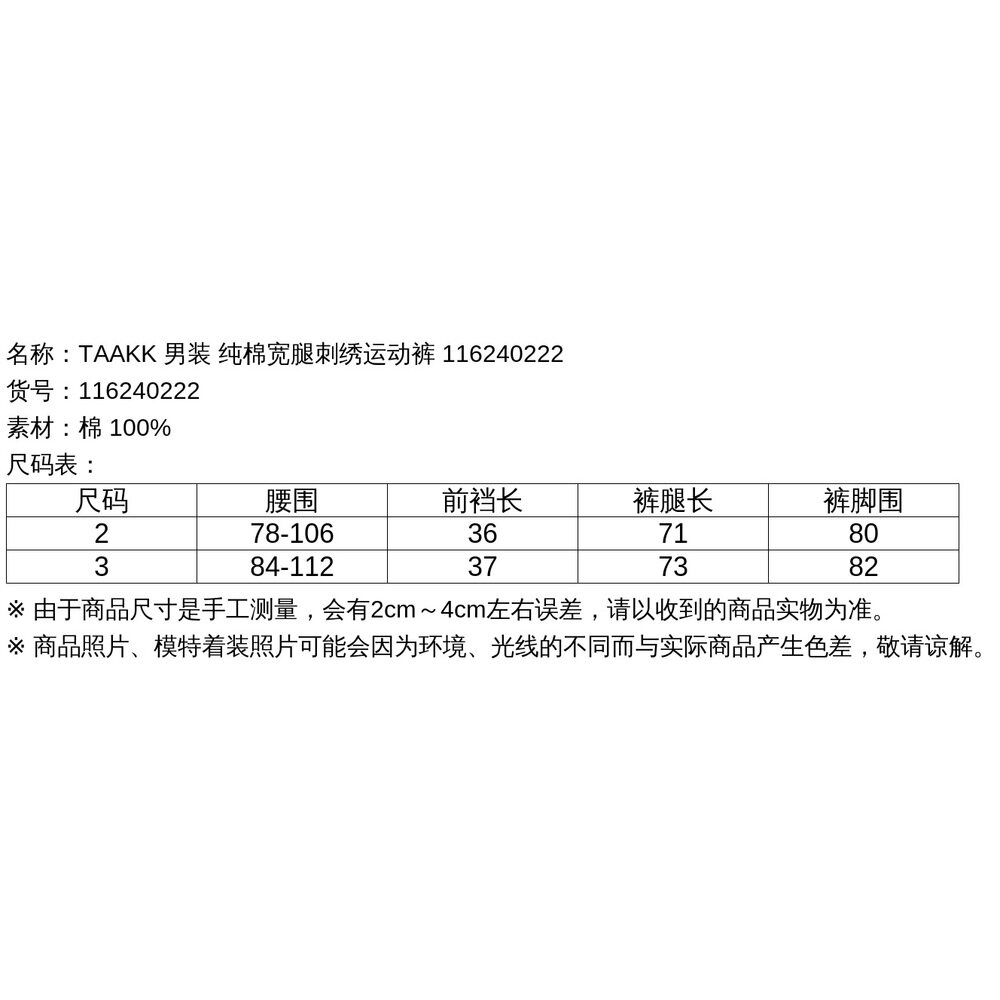 116240222休闲裤 1h可退 纯棉宽腿刺绣运动裤 男装 日本直邮TAAKK