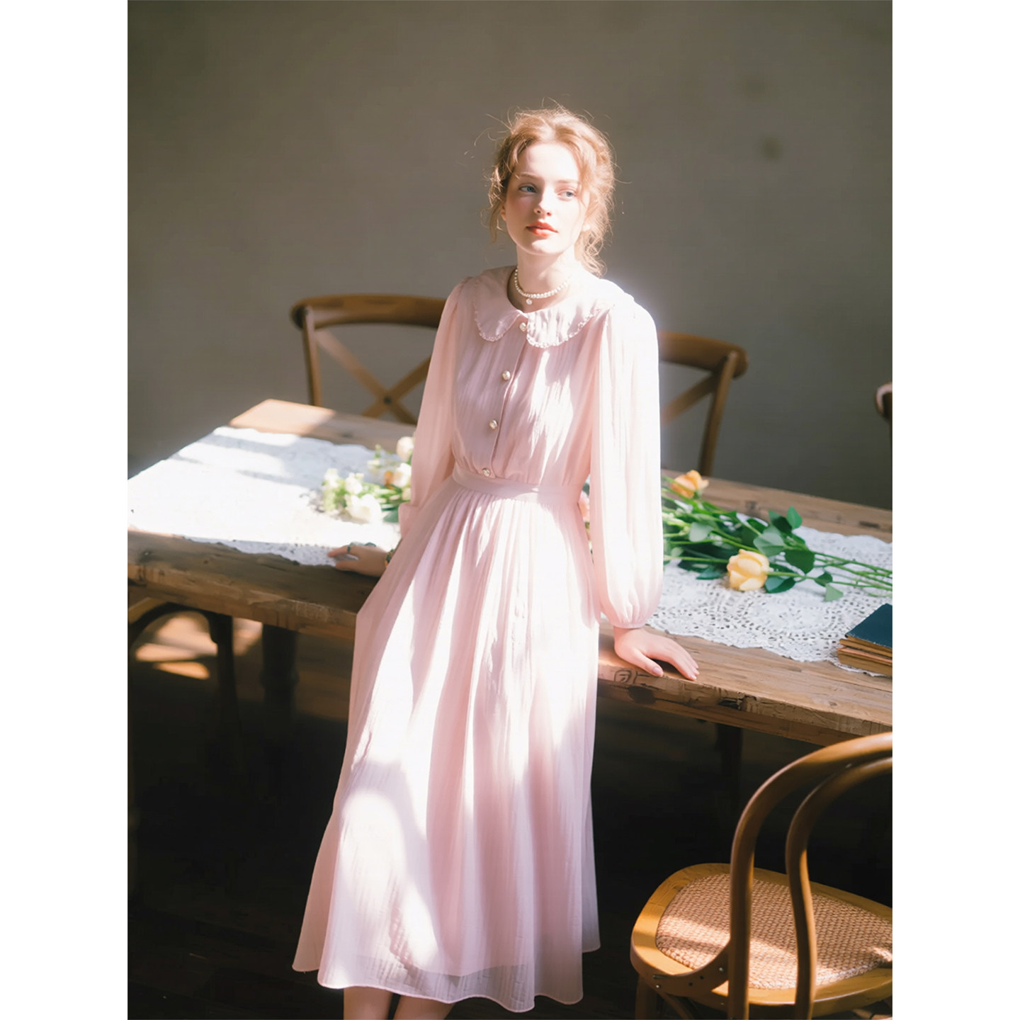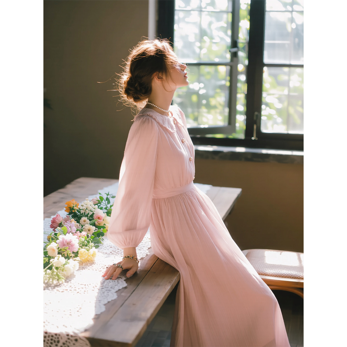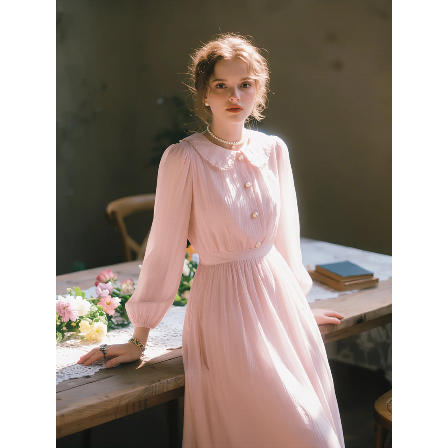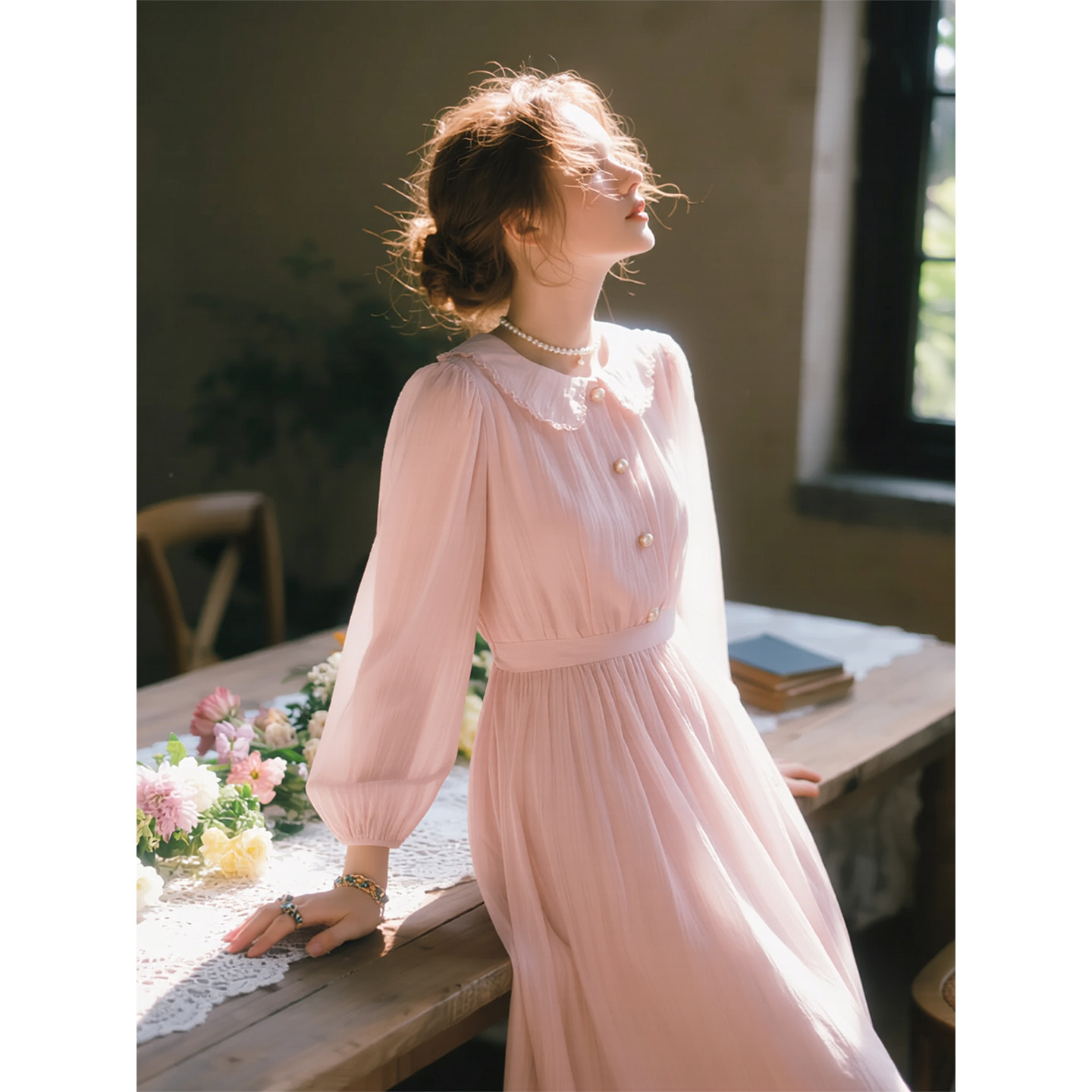 法式 新款 温柔风气质显瘦长裙 连衣裙女2026年春季 浅粉色娃娃领长袖