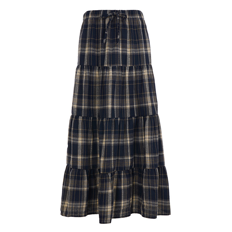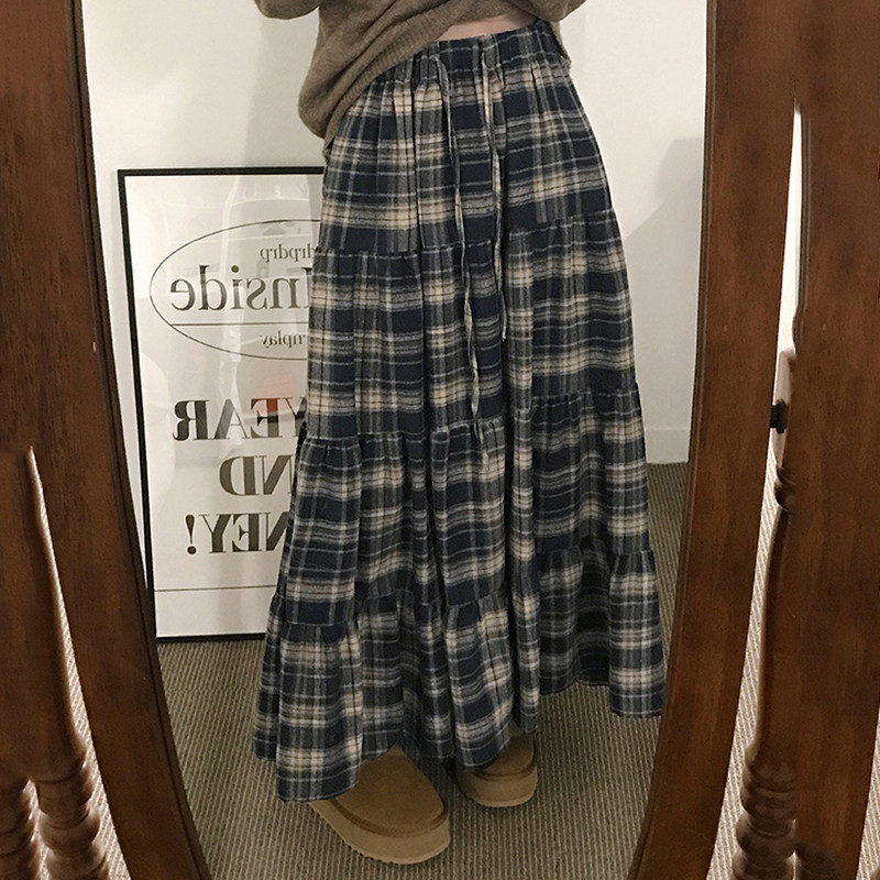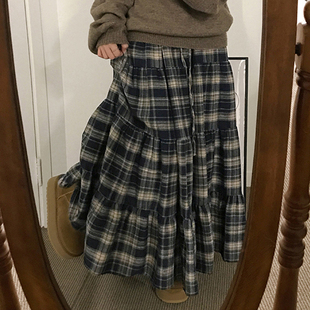 松紧腰显瘦A字长裙 慵懒感复古格纹半身裙女 ROCKMORE 文艺少女