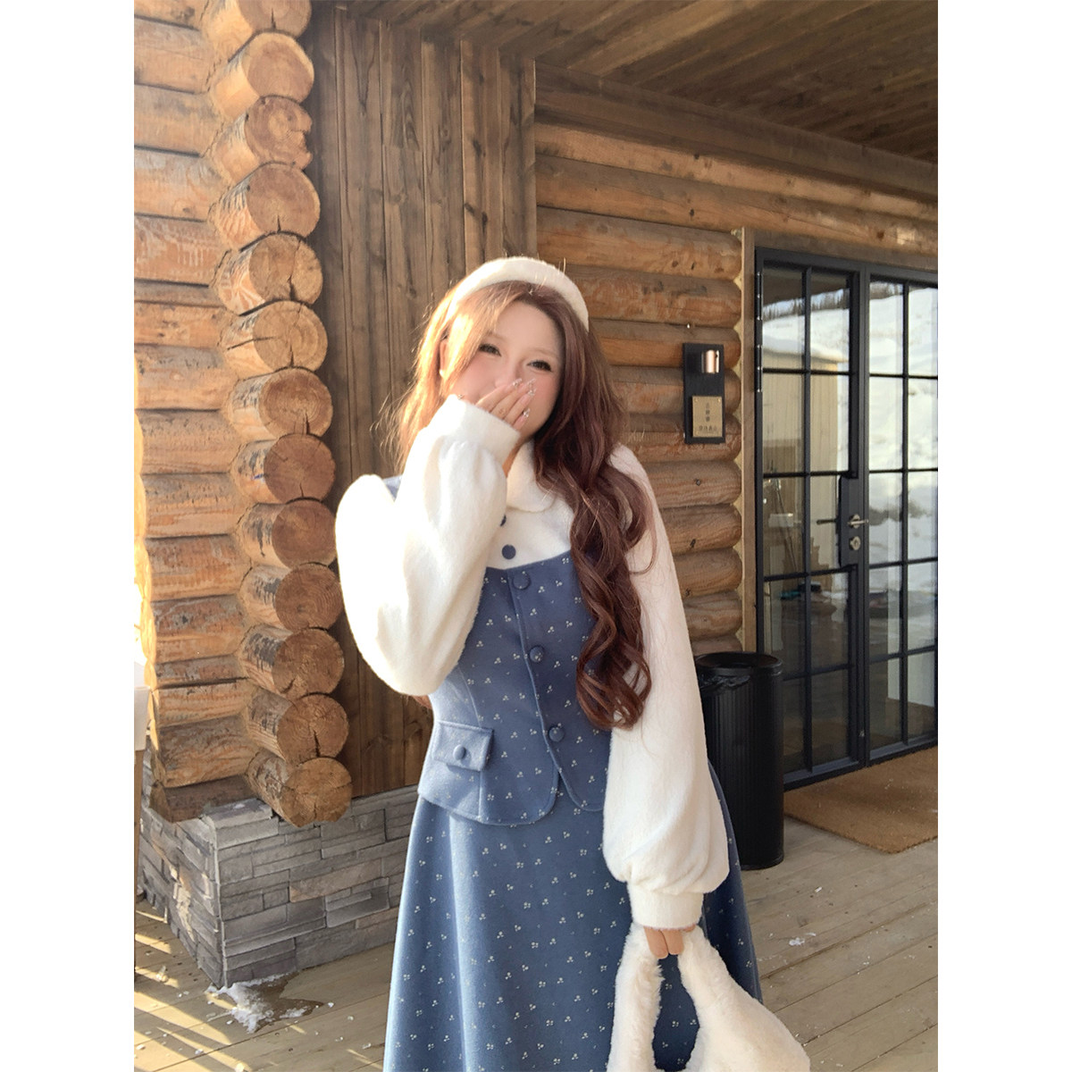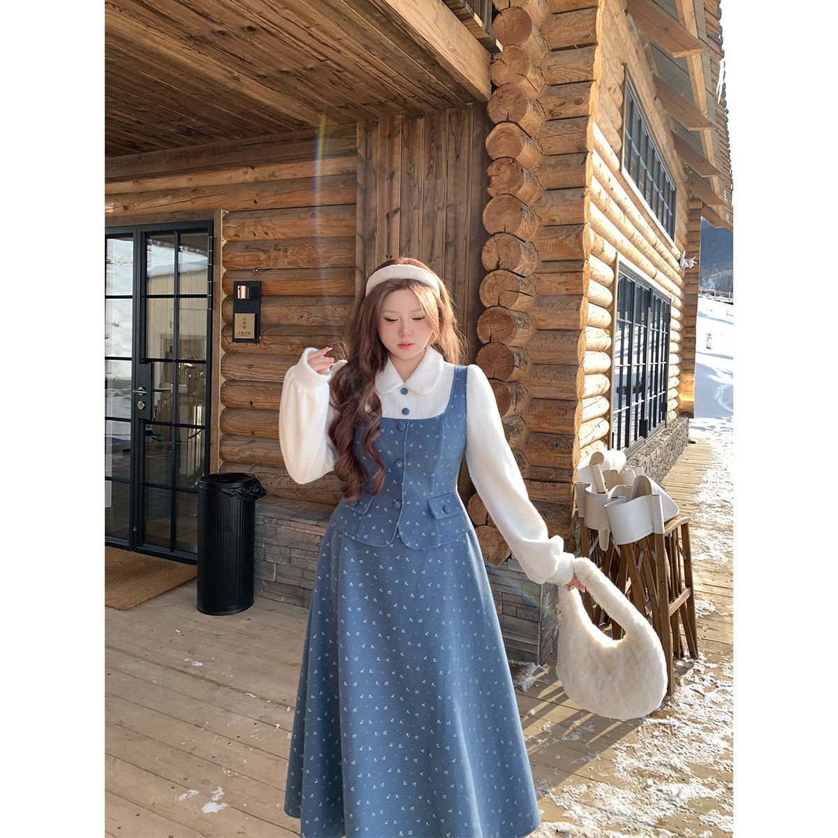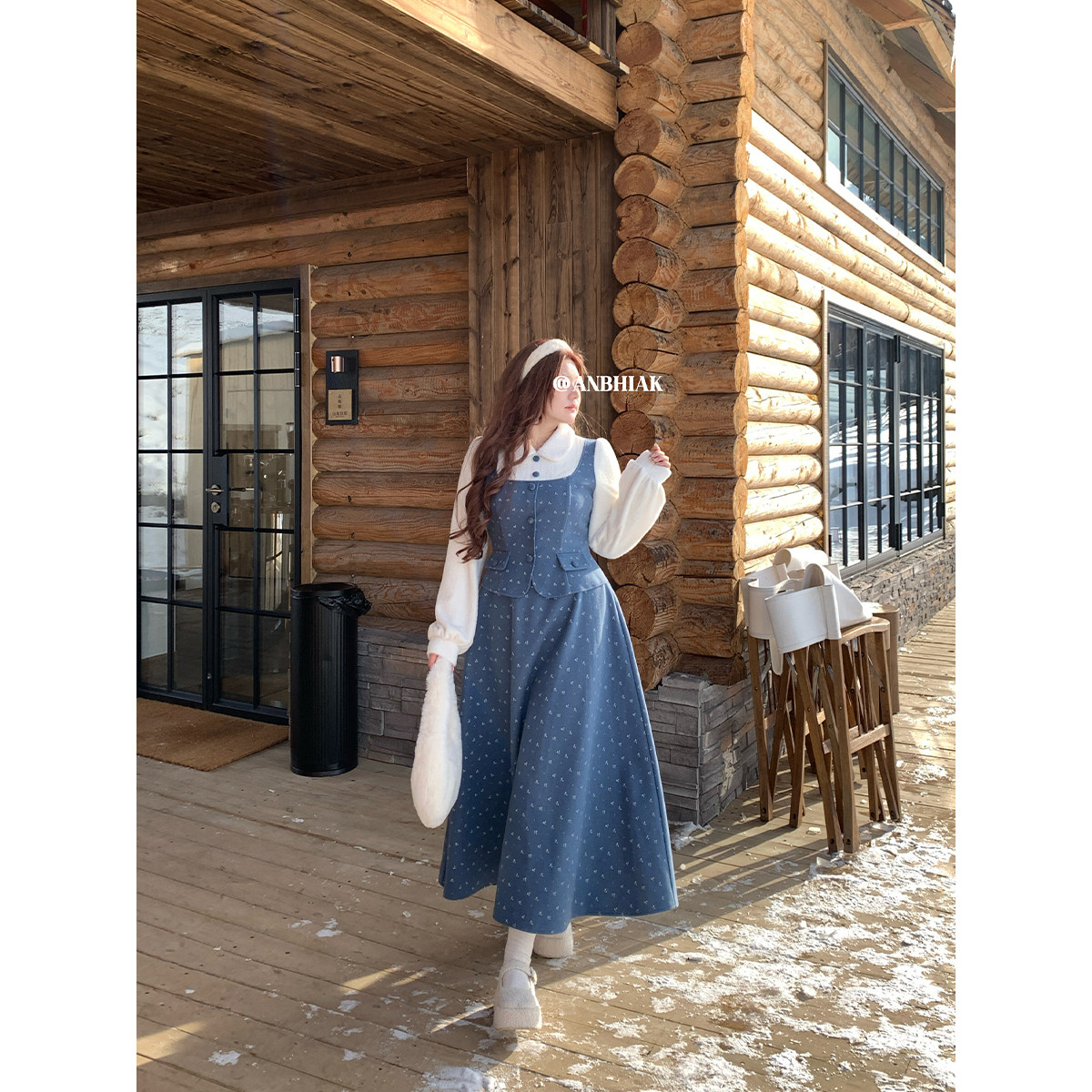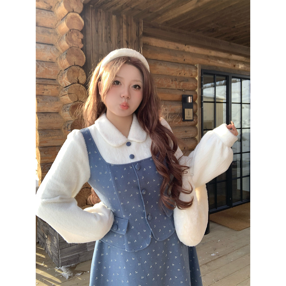 背带裙 灯笼袖 安妮不火 假两件毛绒针织拼接呢料连衣裙女微胖大码