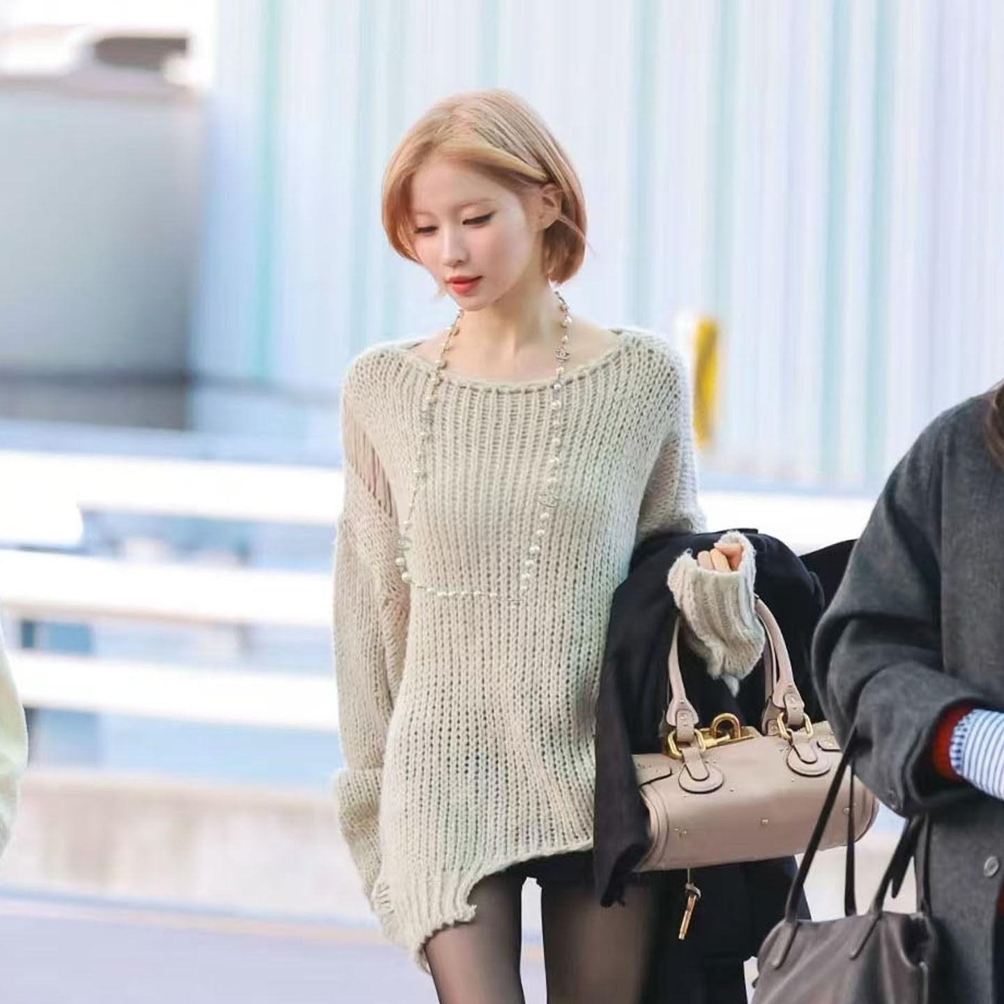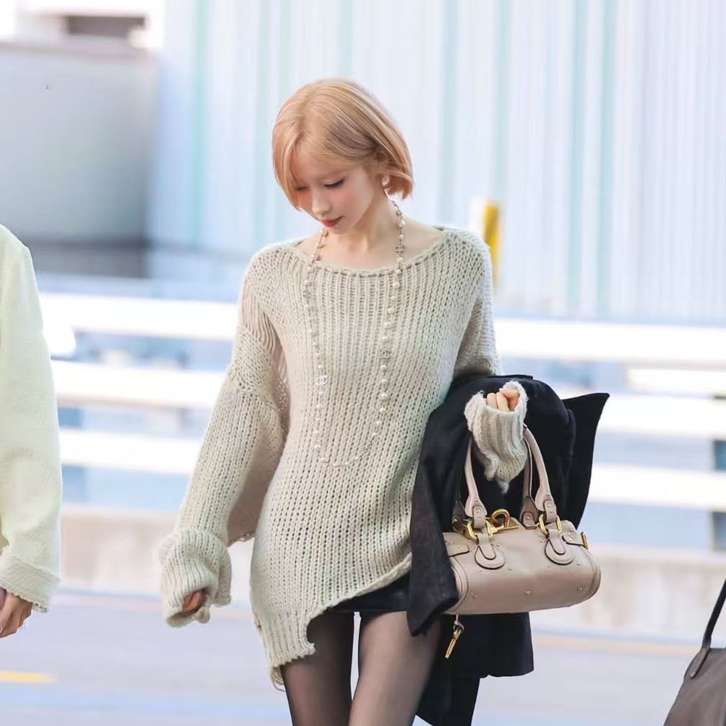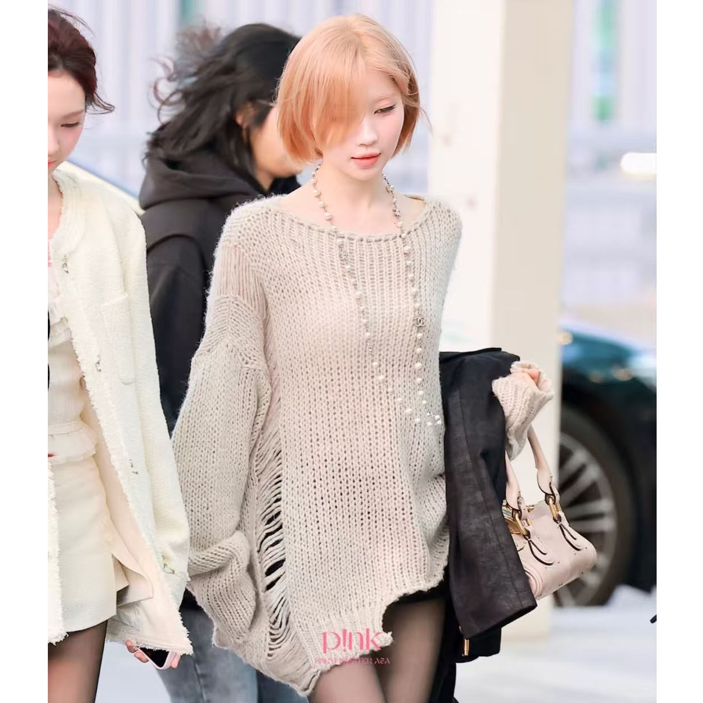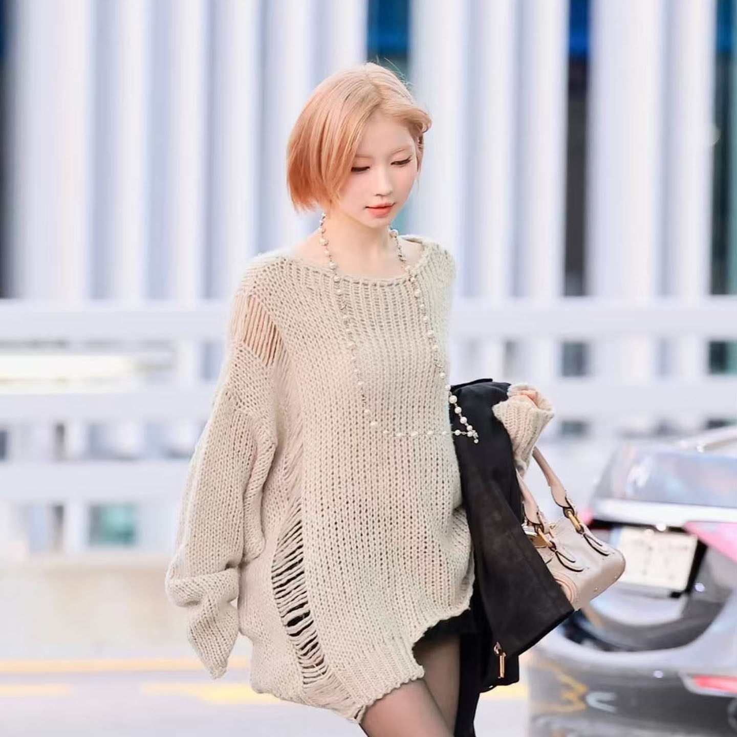 Asa明星同款 女2025秋冬韩系百搭宽松毛衣 杏色慵懒风镂空针织衫