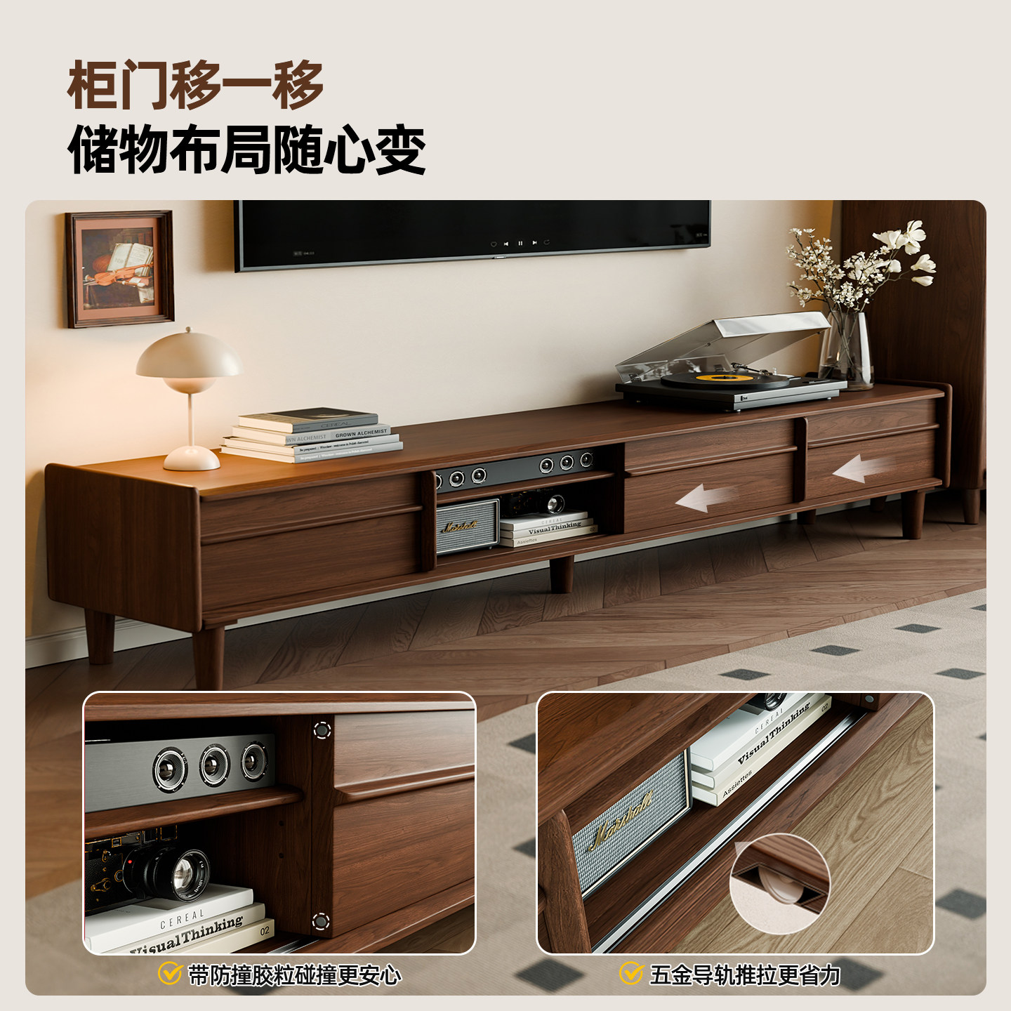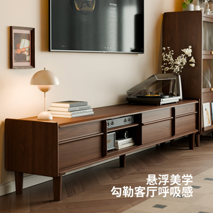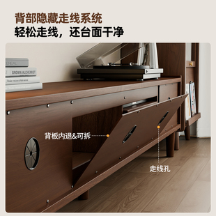 中古风实木落地电视柜胡桃色储物柜客厅家用黑色岩板地柜茶几组合