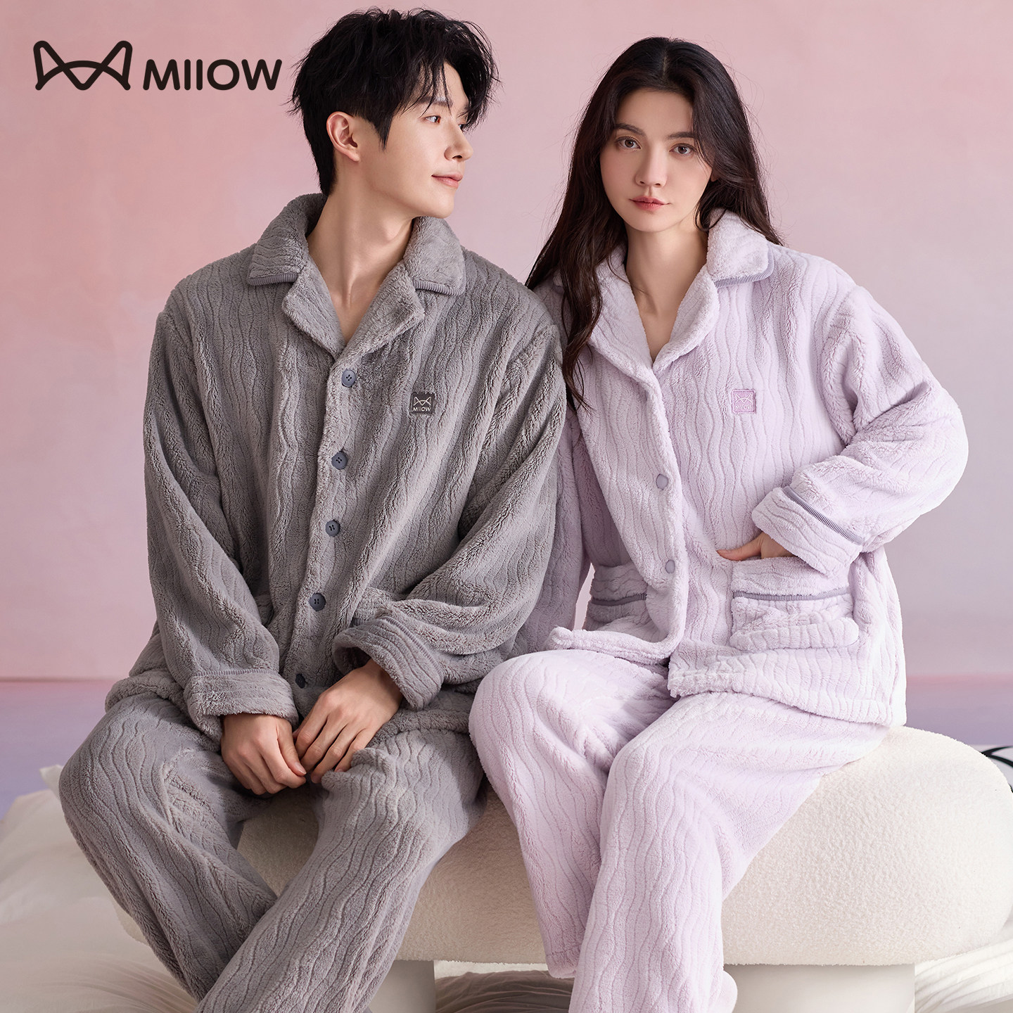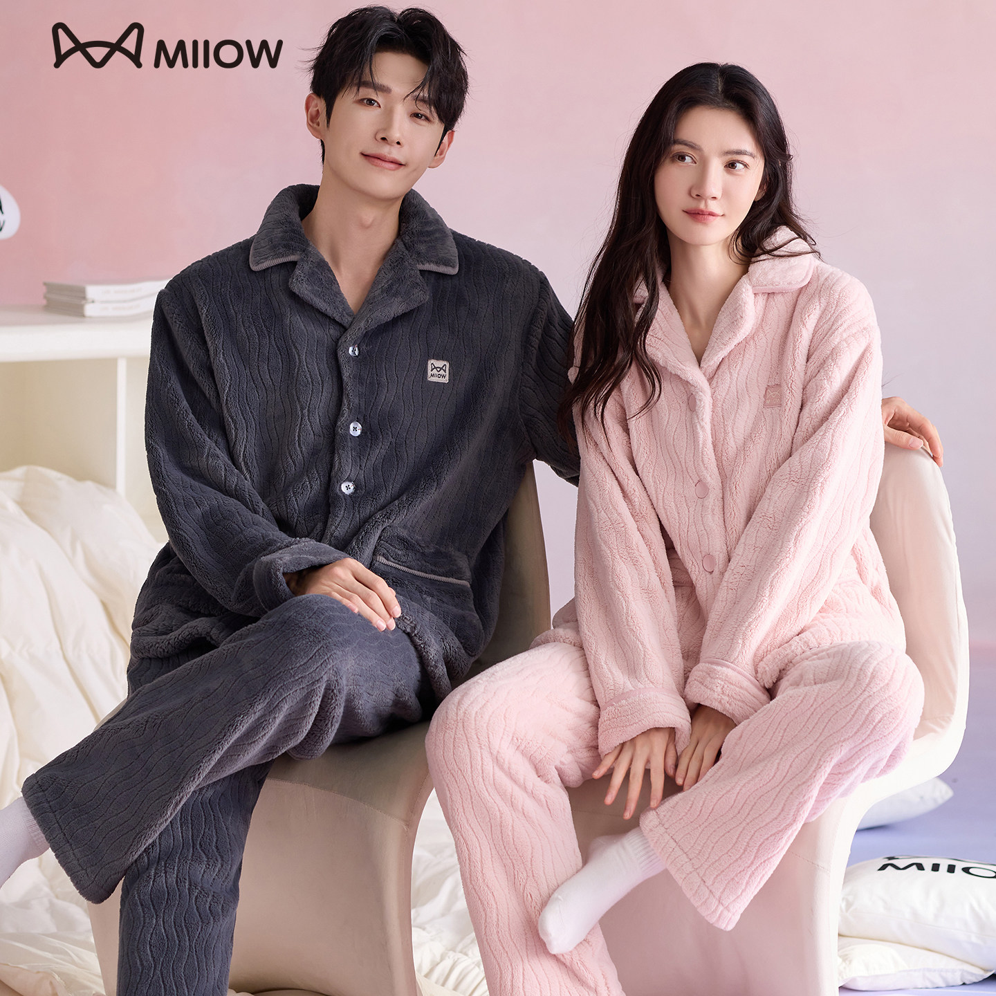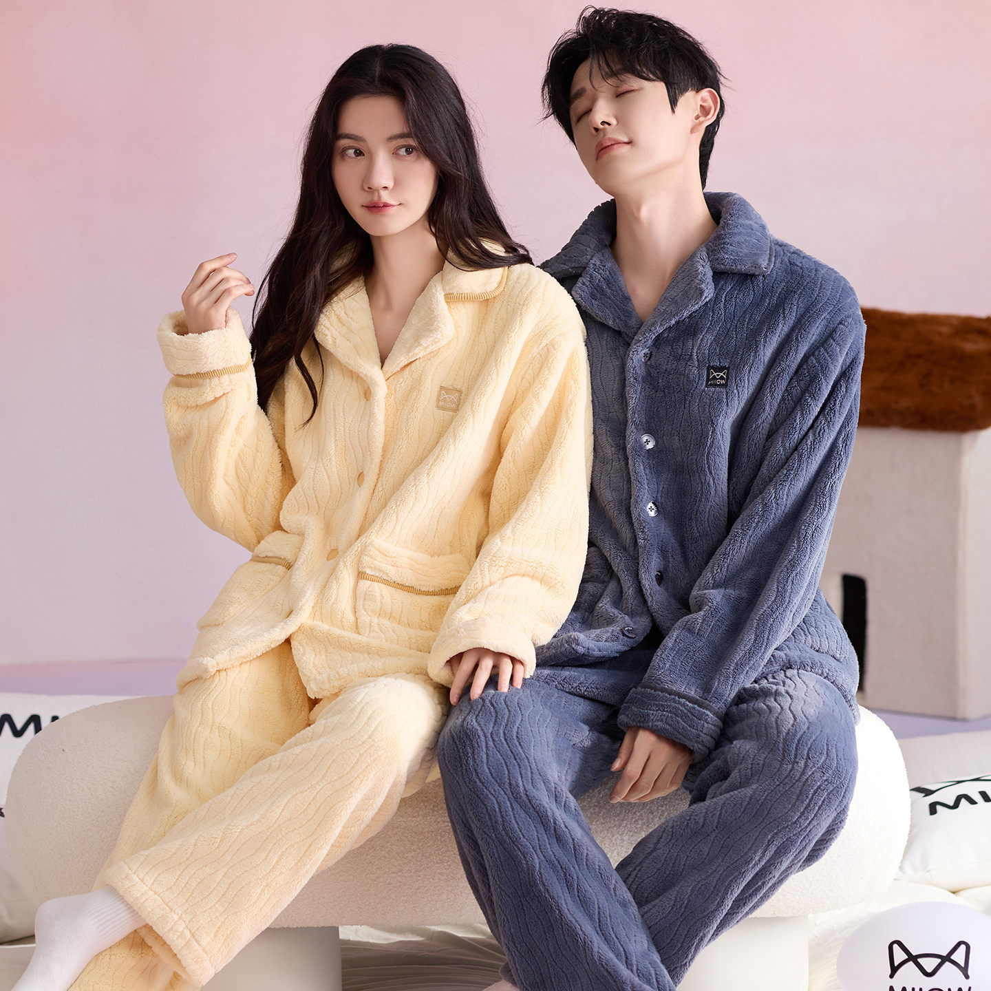 加厚保暖法兰绒家居服睡衣套装 长裤 冬季 带口袋长袖 翻领开衫 情侣款