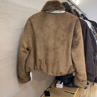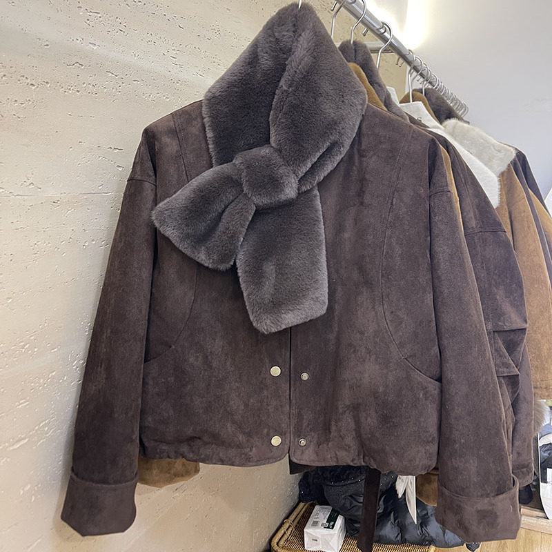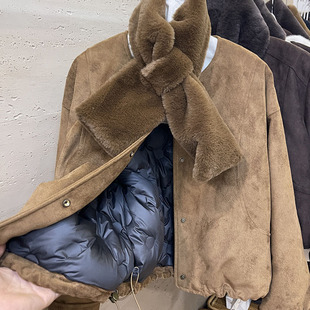 复古简约围脖风麂皮绒短外套女时尚 百搭宽松休闲羽绒内胆白鸭绒