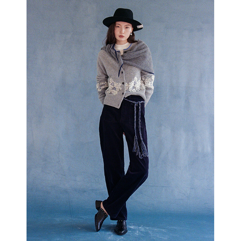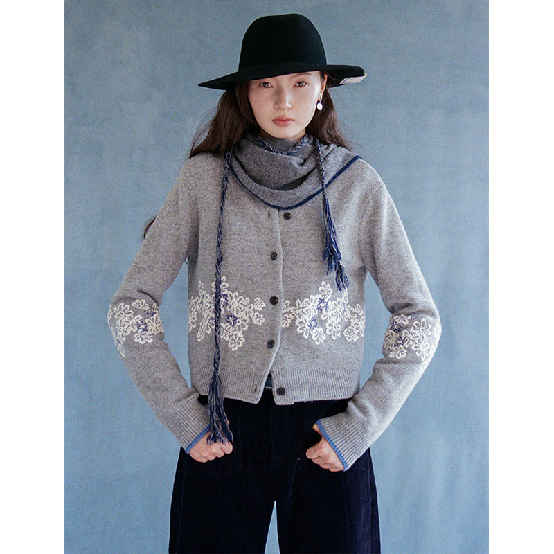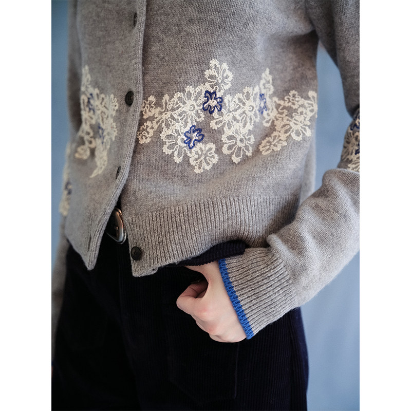 开衫 Even 复古灰调重工精致刺绣纹撞色边毛衫 100%羊毛 Vintage