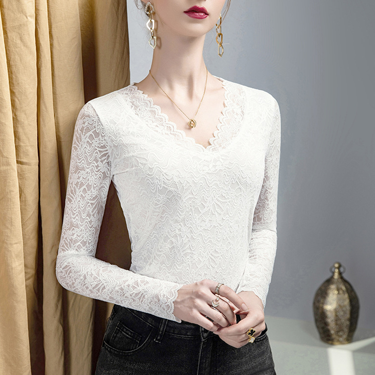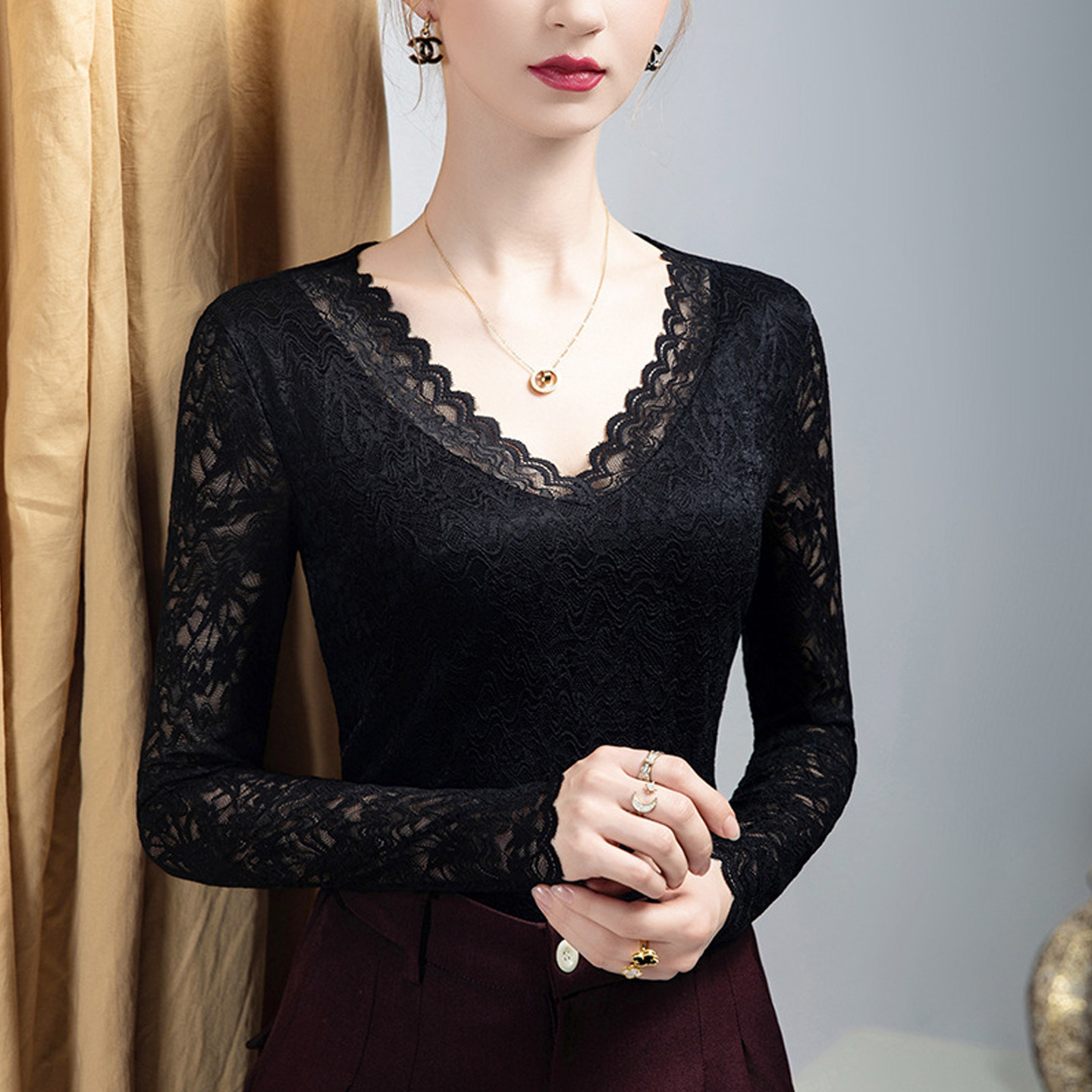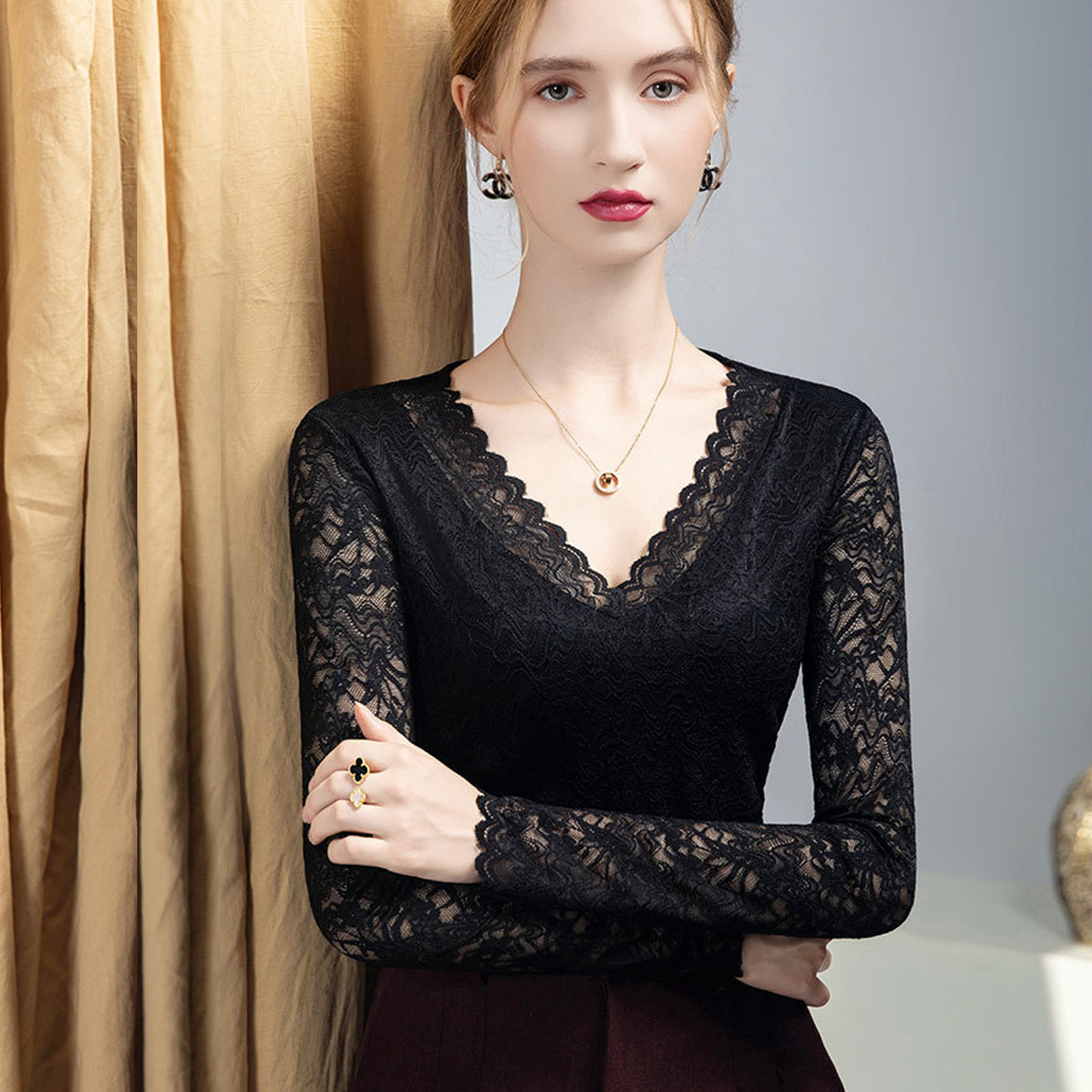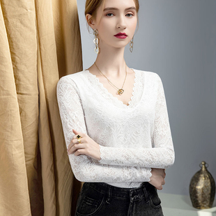 秋装 t恤洋气网纱打底衫 气质v领蕾丝上衣叠穿内搭黑色长袖 2025新款