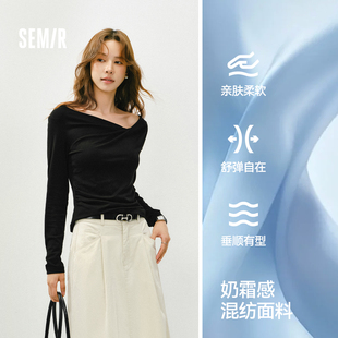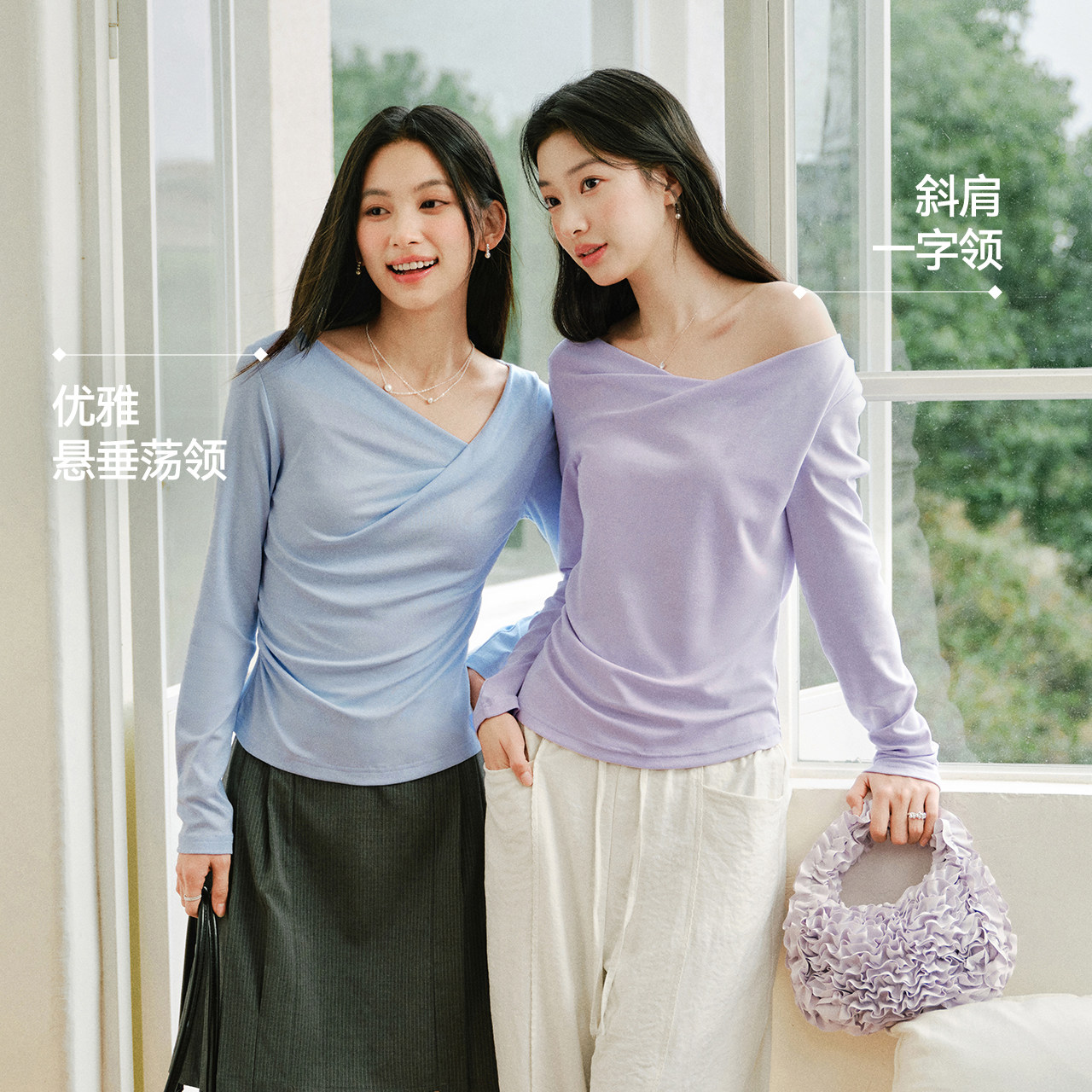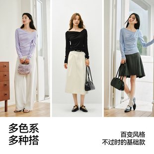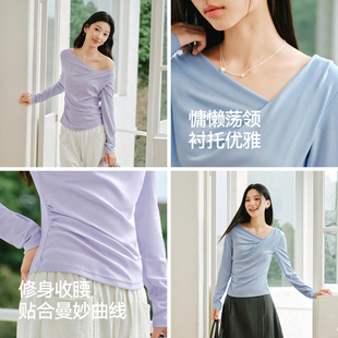 不对称荡领斜肩露肩紧身纯色2026新款 短款 上衣 T恤女春季 森马长袖