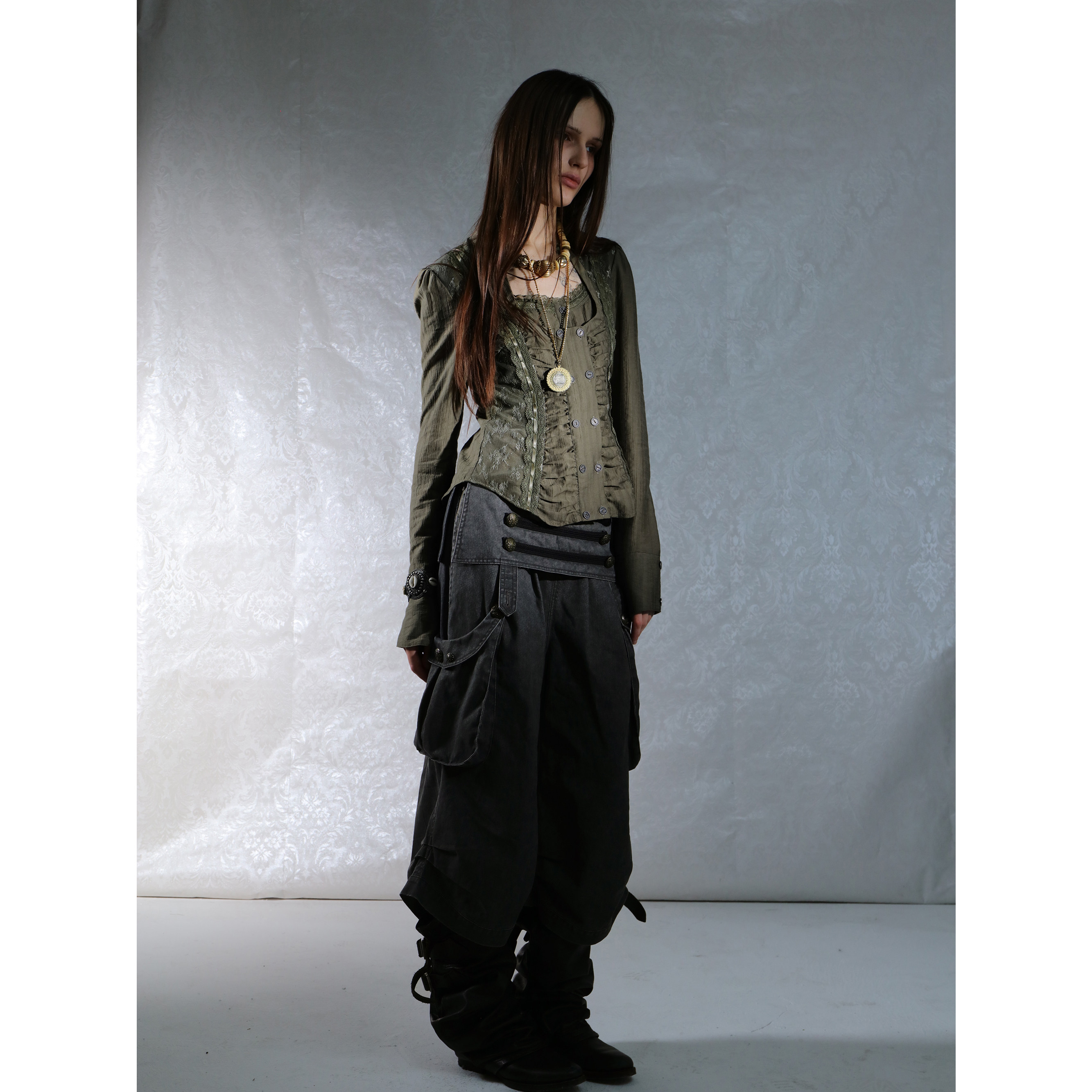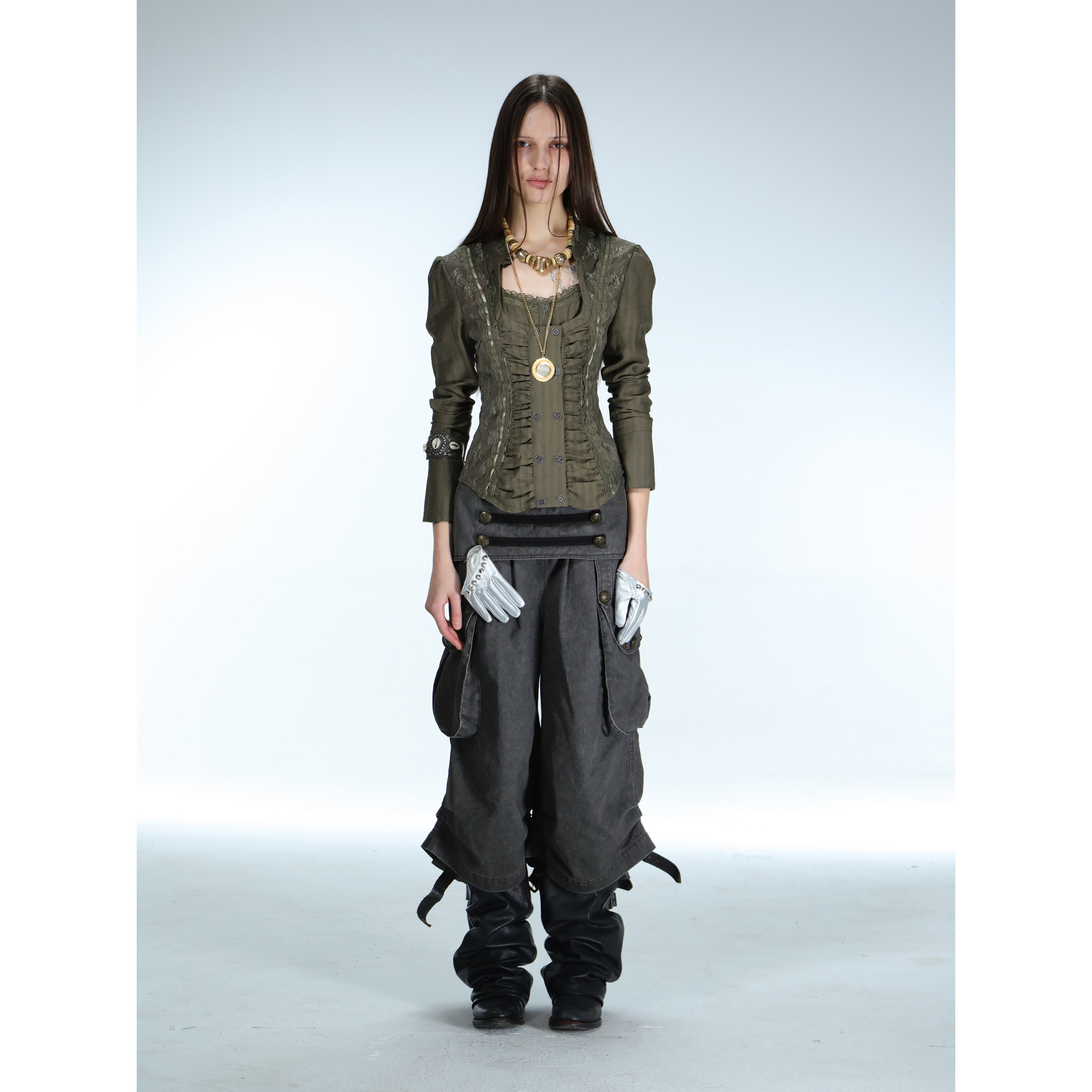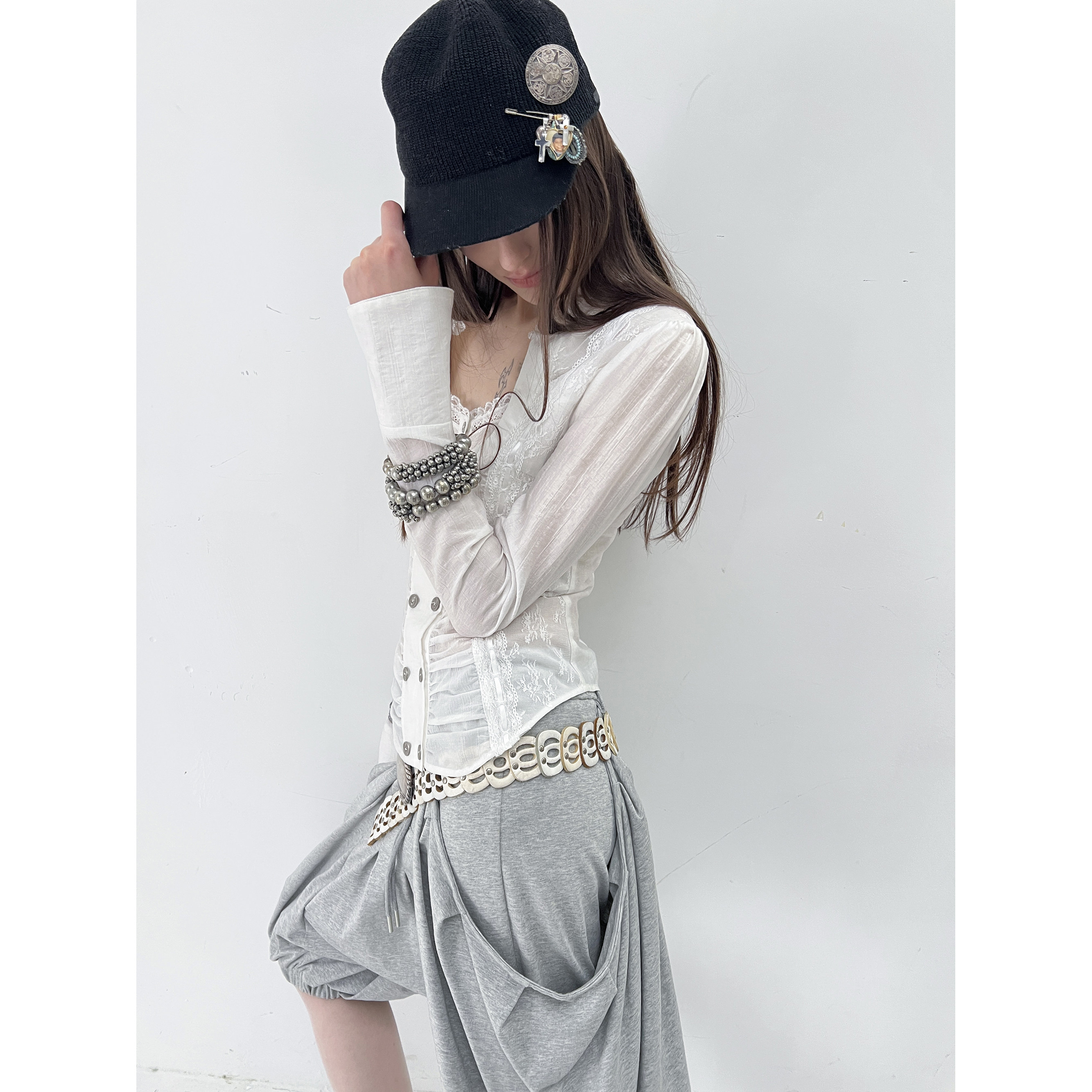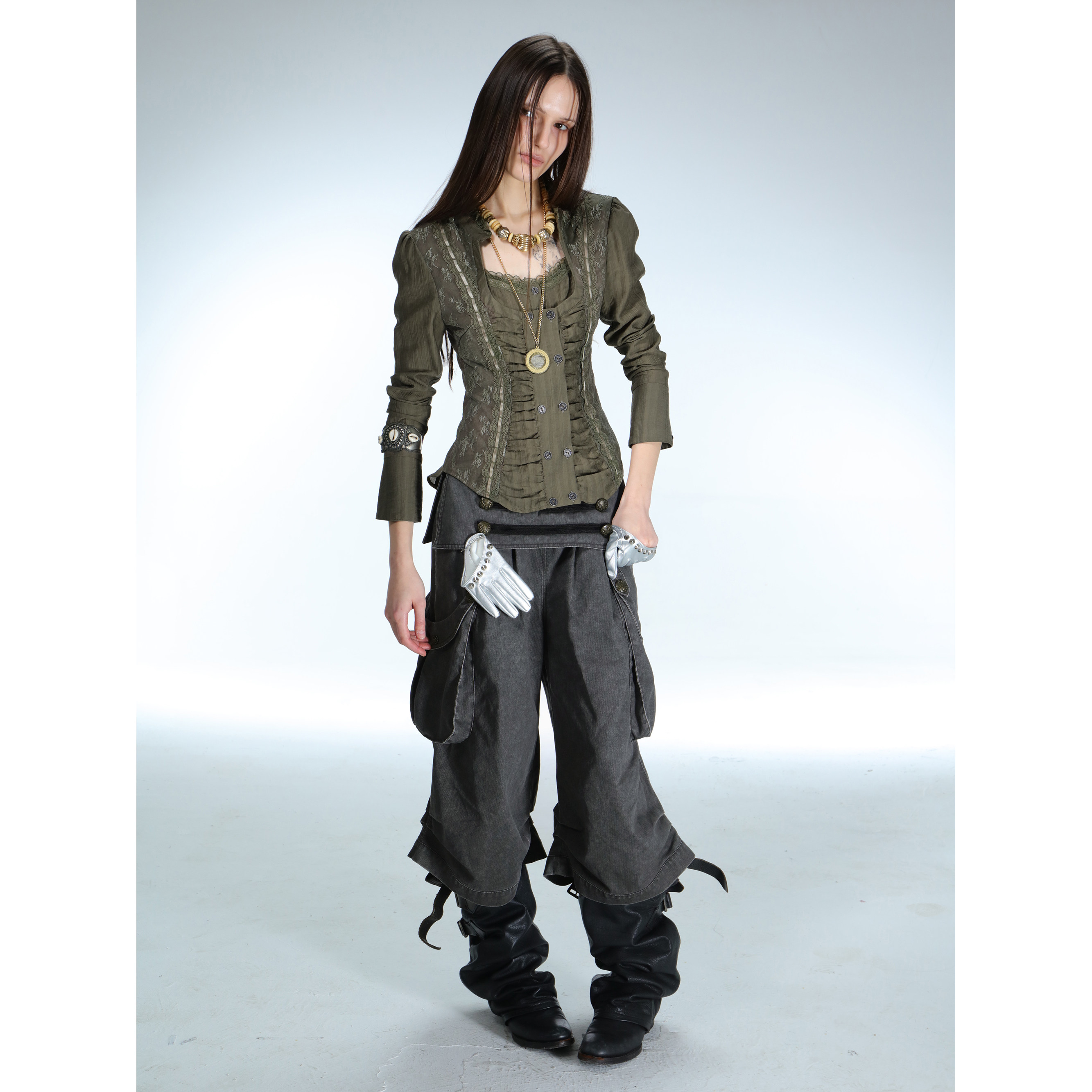 DoublePunch春夏原创复古宫廷蕾丝拼接方领修身 显腰显瘦衬衣