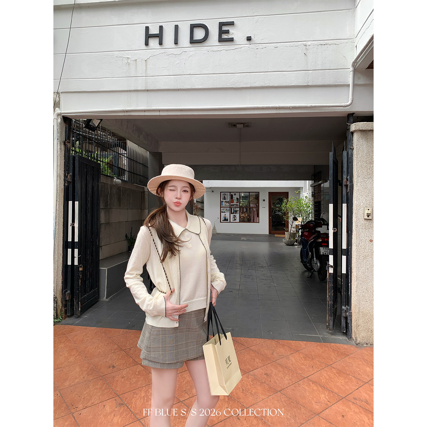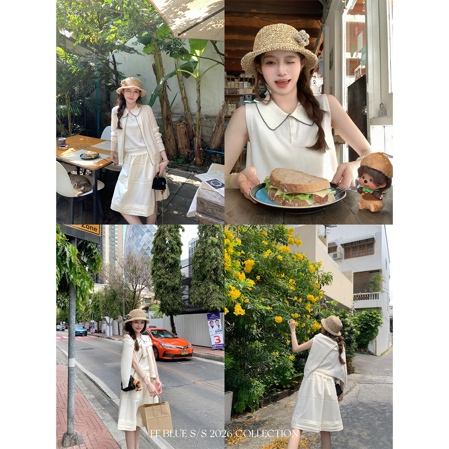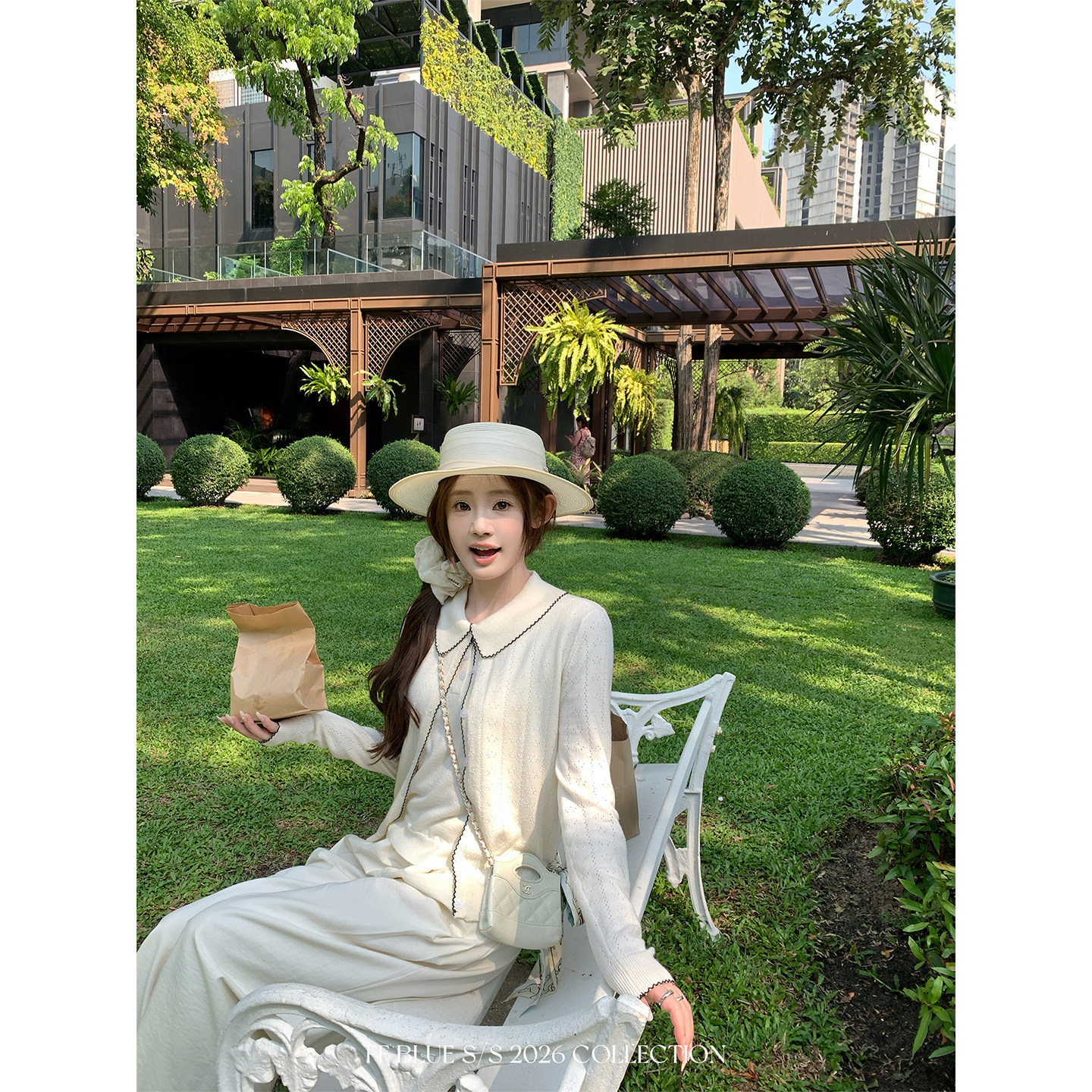 描边马甲钩花羊毛针织开衫 气质套装 白雾风铃 镂空半身裙 BLUE