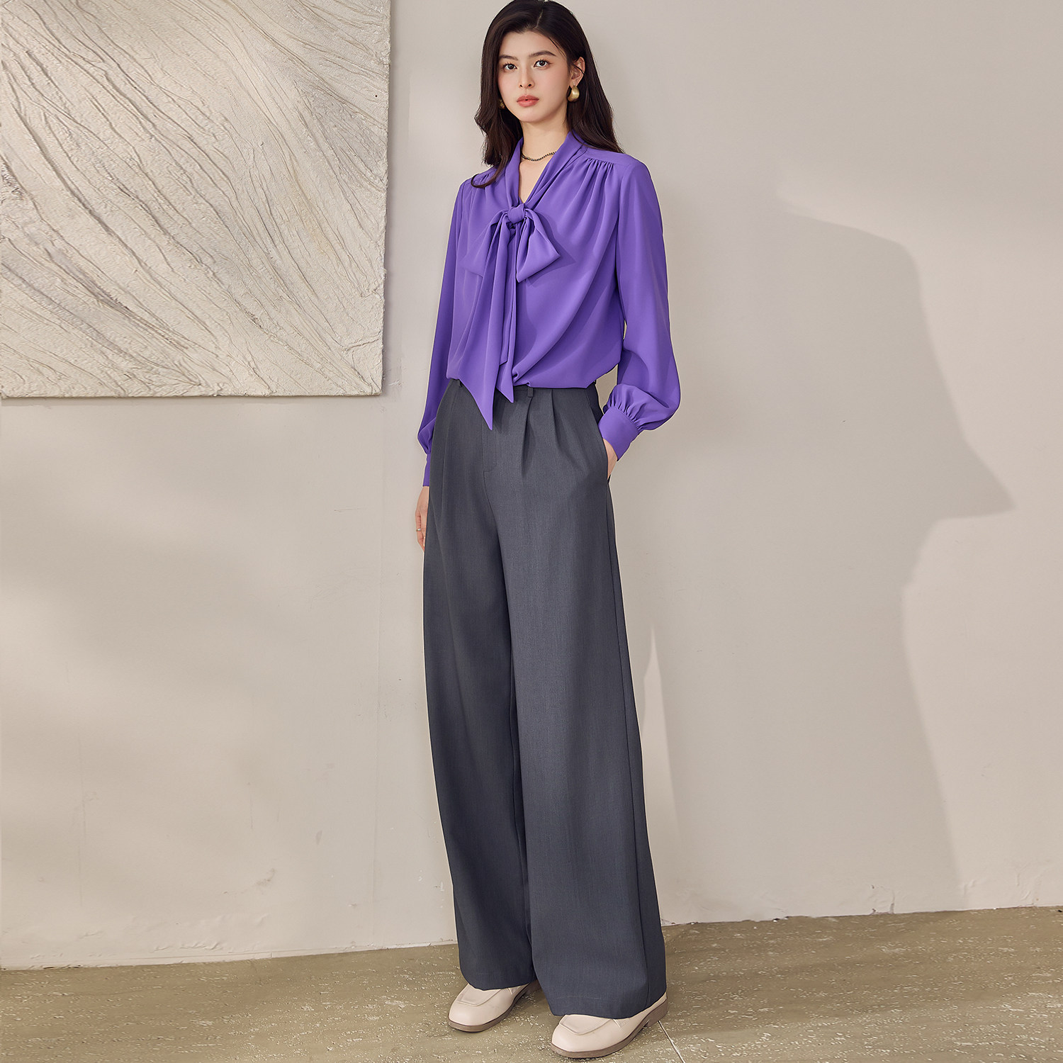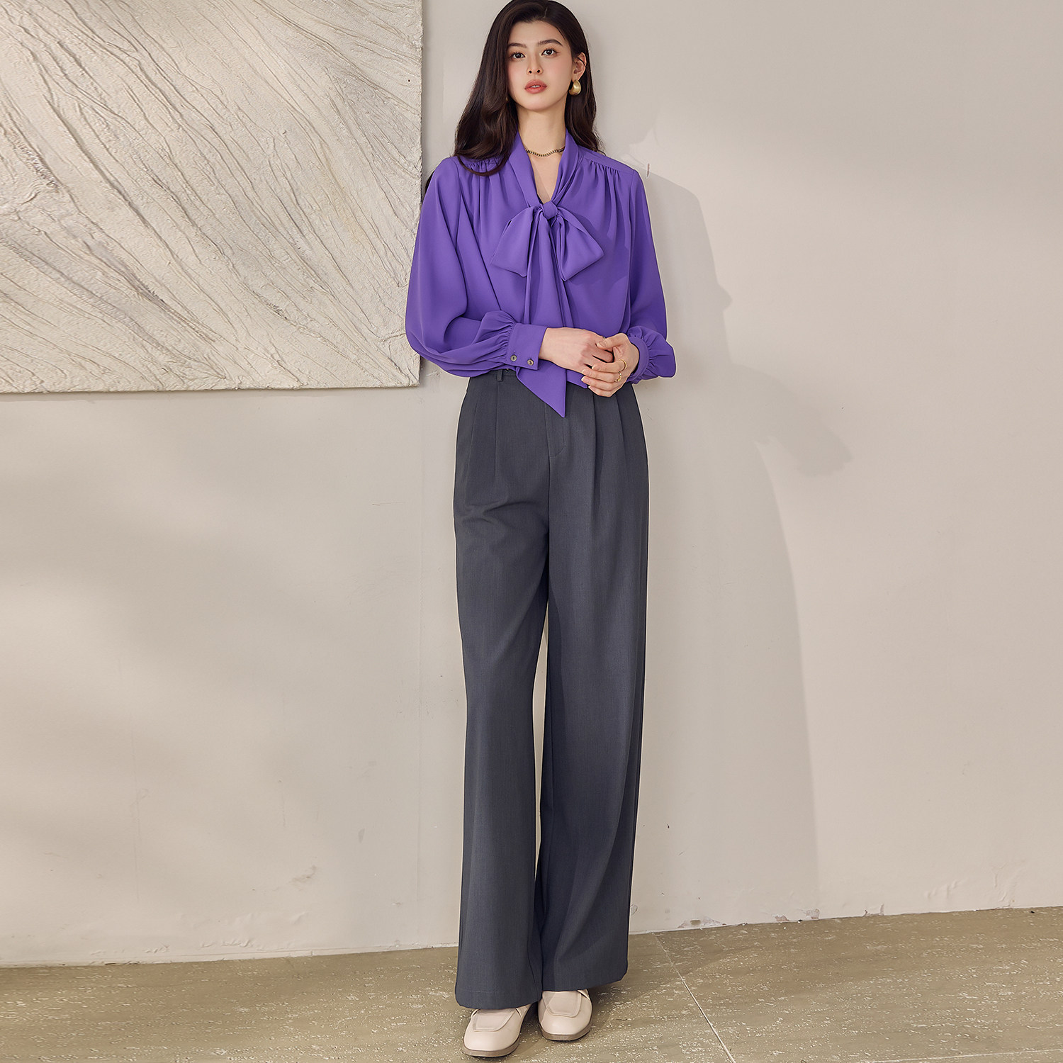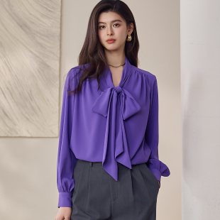 罗衣优雅通勤OL风飘带雪纺衬衫 紫色垂坠感百搭衬衣13447 女春法式