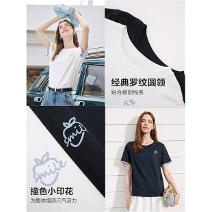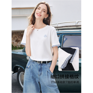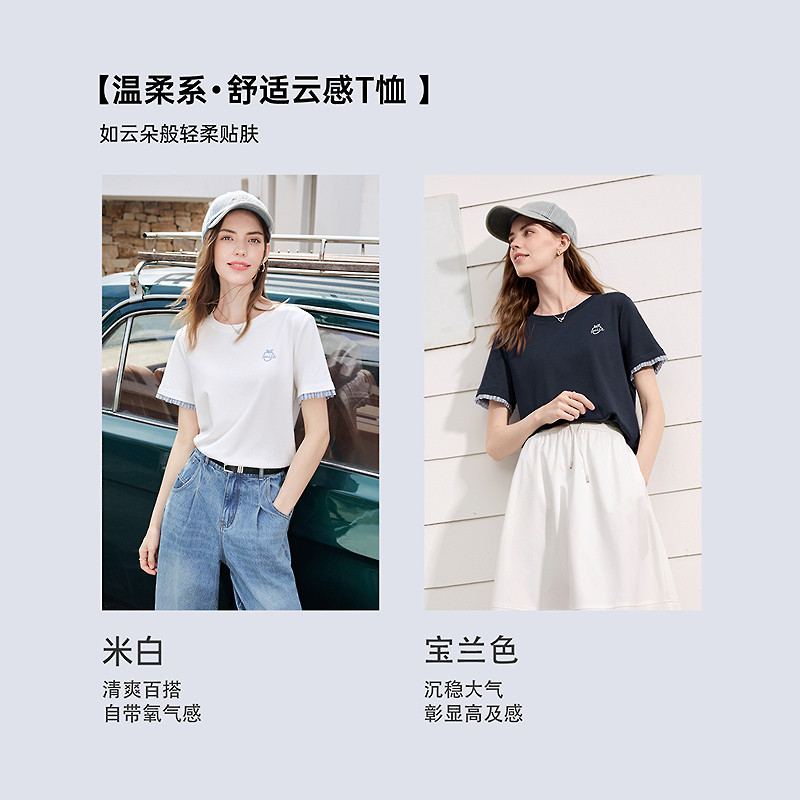 百搭小衫 新款 上衣 圆领T恤女2026年春季 betu百图撞色木耳边短袖