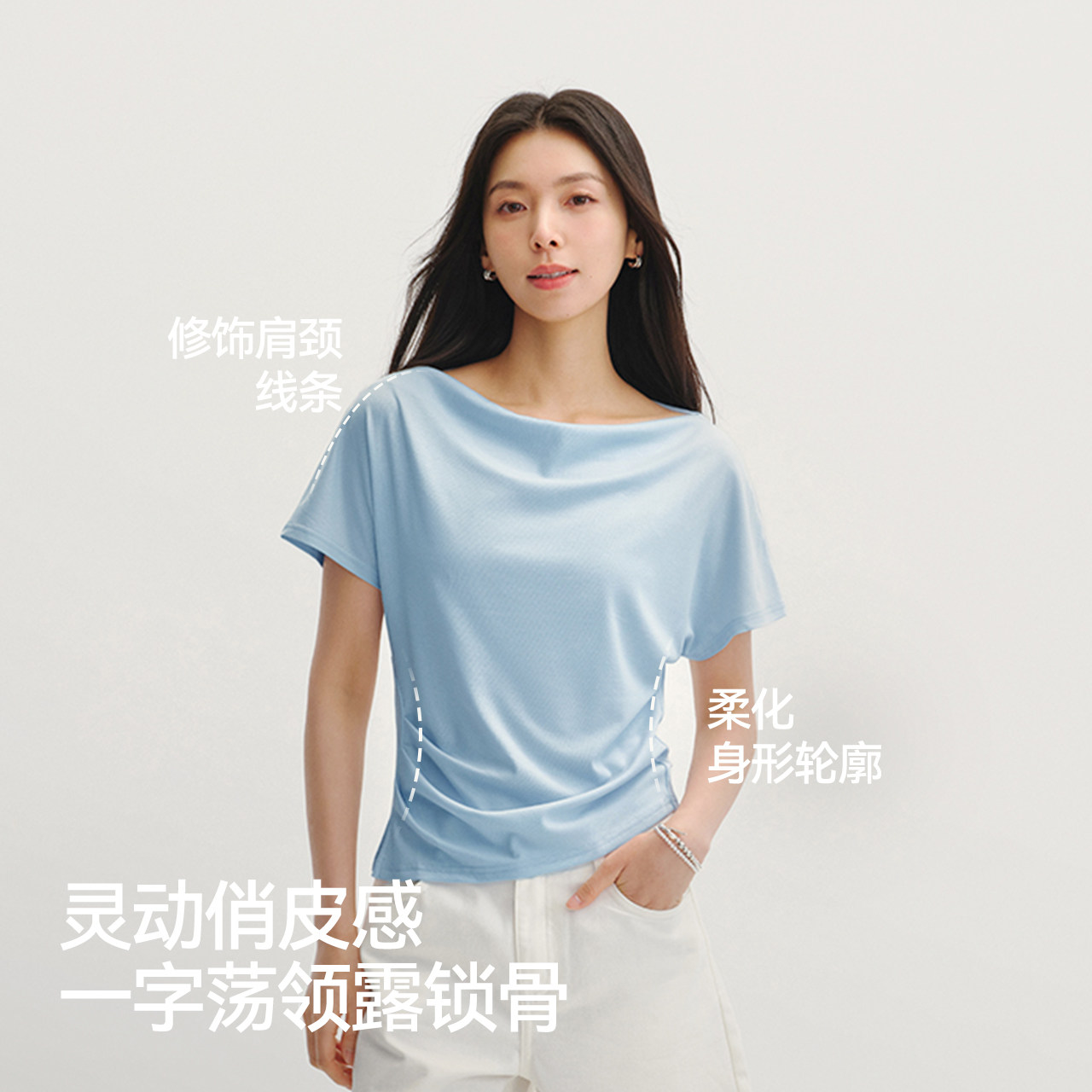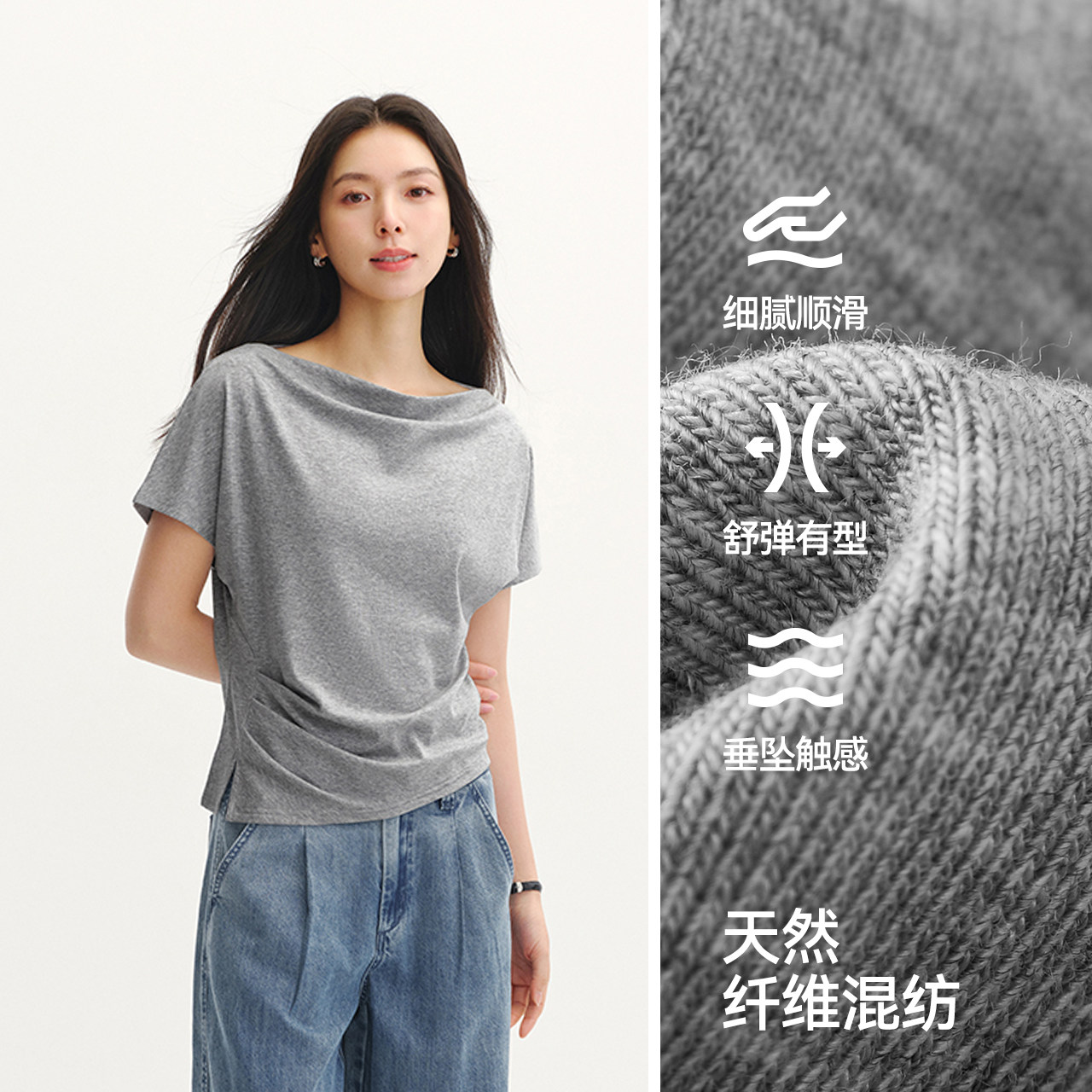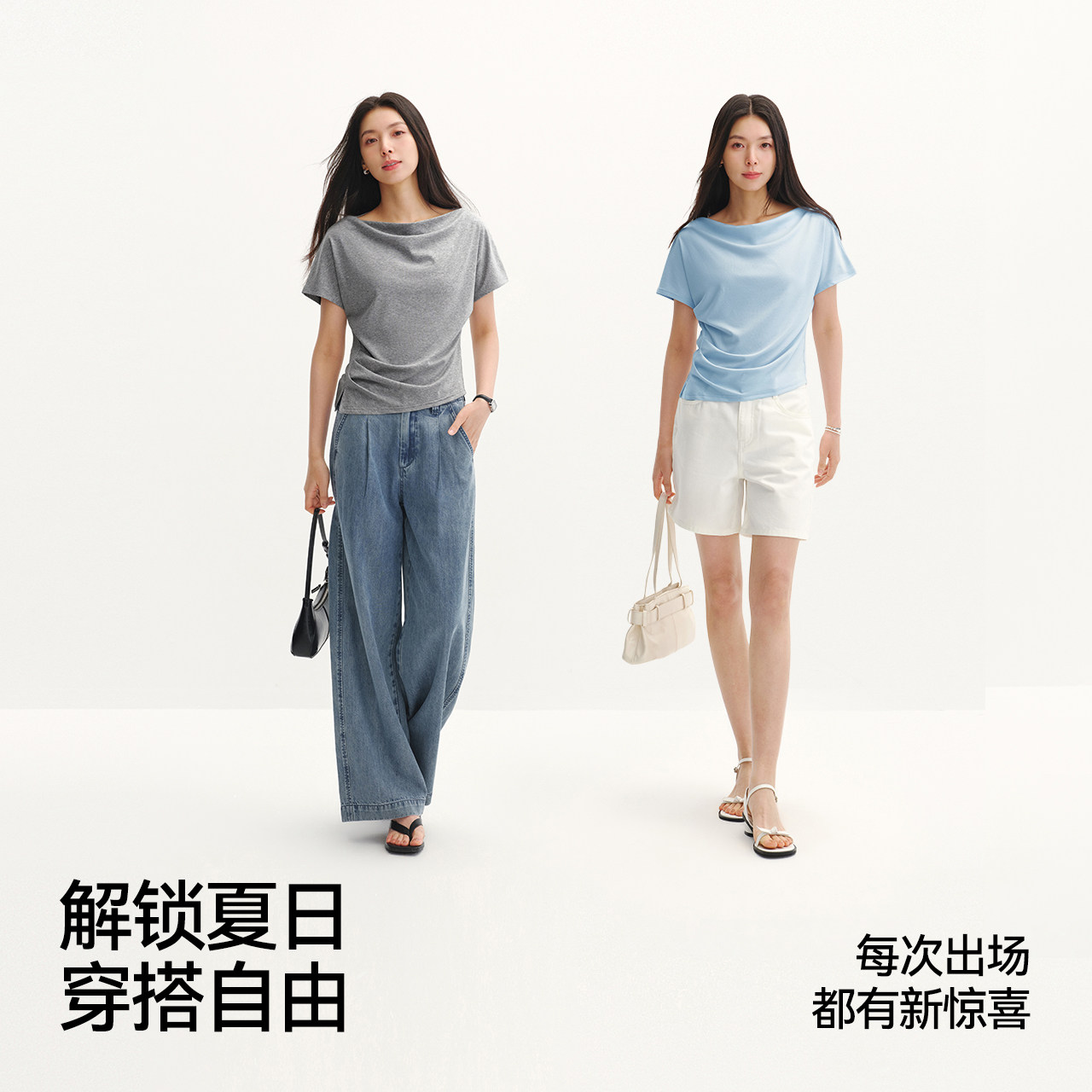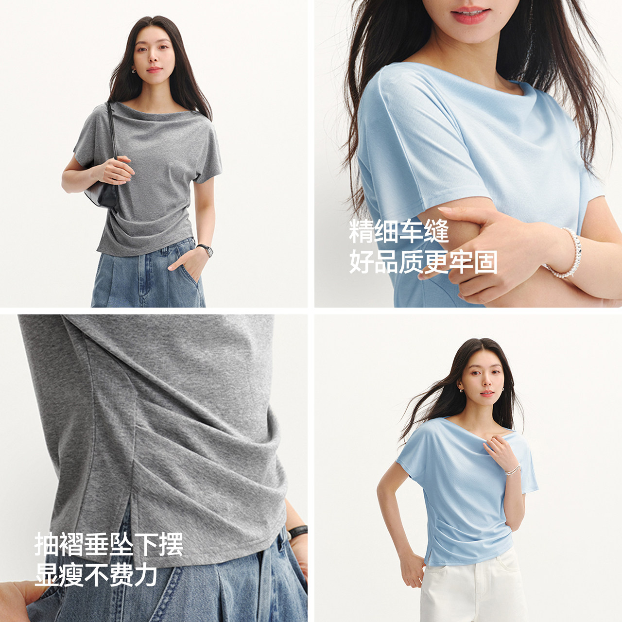 森马T恤女夏季 2026新款 短款 斜肩开叉短袖 上衣 荡领褶皱修身 陈都灵