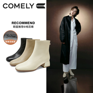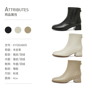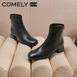 时尚 康莉羊皮粗跟短靴女25冬新款 百搭洋气黑色靴子加绒 明星同款