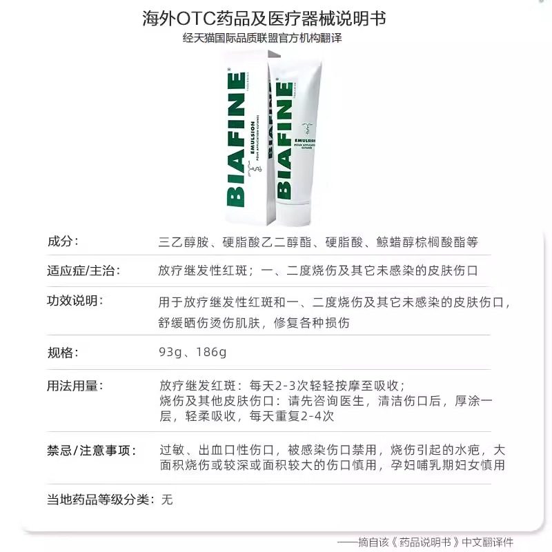 法国进口Biafine比亚芬放疗乳膏186g三乙醇胺烧伤烫伤皮肤防护剂