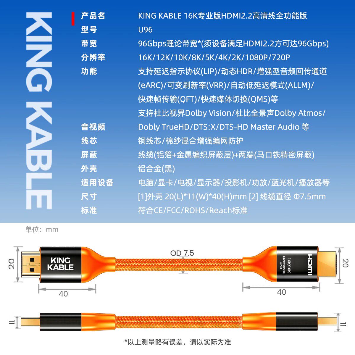 KingKable发烧级HDMI2.2线16K 4K480高刷CE认证电视显卡线 8K240