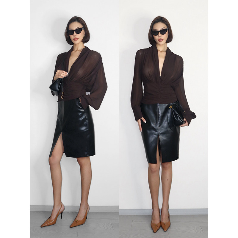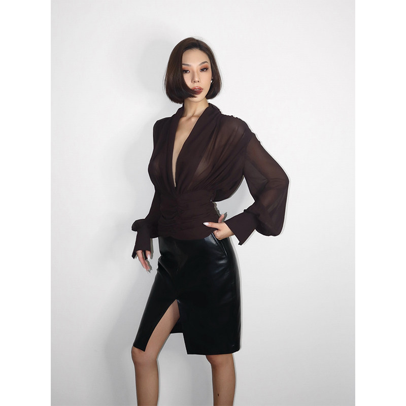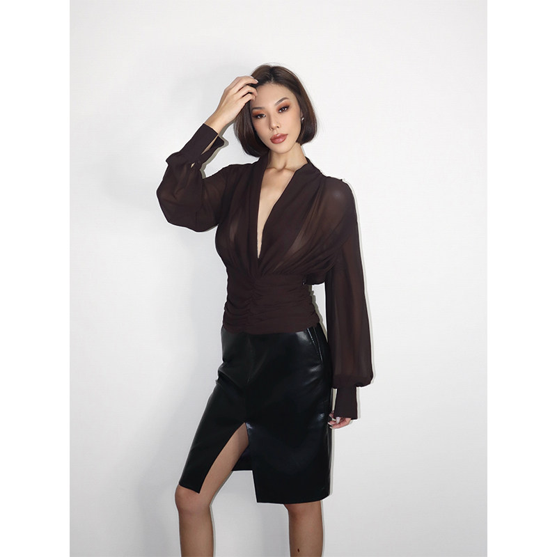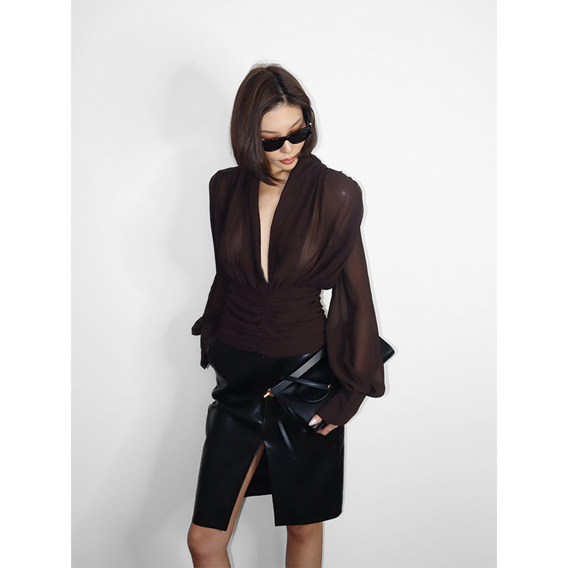 VanessaLab 咖色透视衬衣高级感上衣 小众深V领网纱褶皱收腰长袖