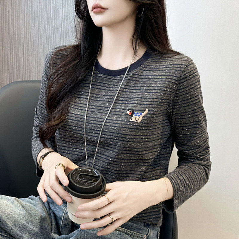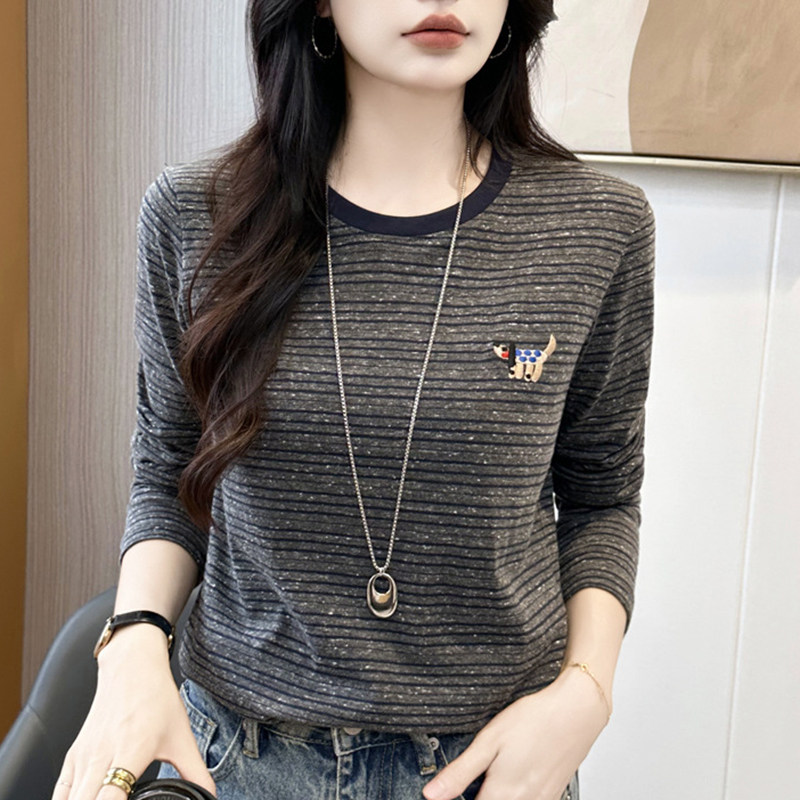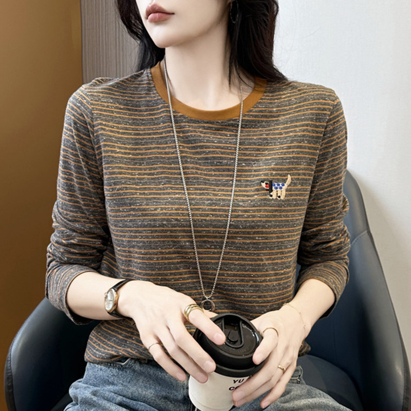 宽高级感显瘦上衣 百搭打底衫 撞色圆领刺绣条纹长袖 t恤女春秋新款