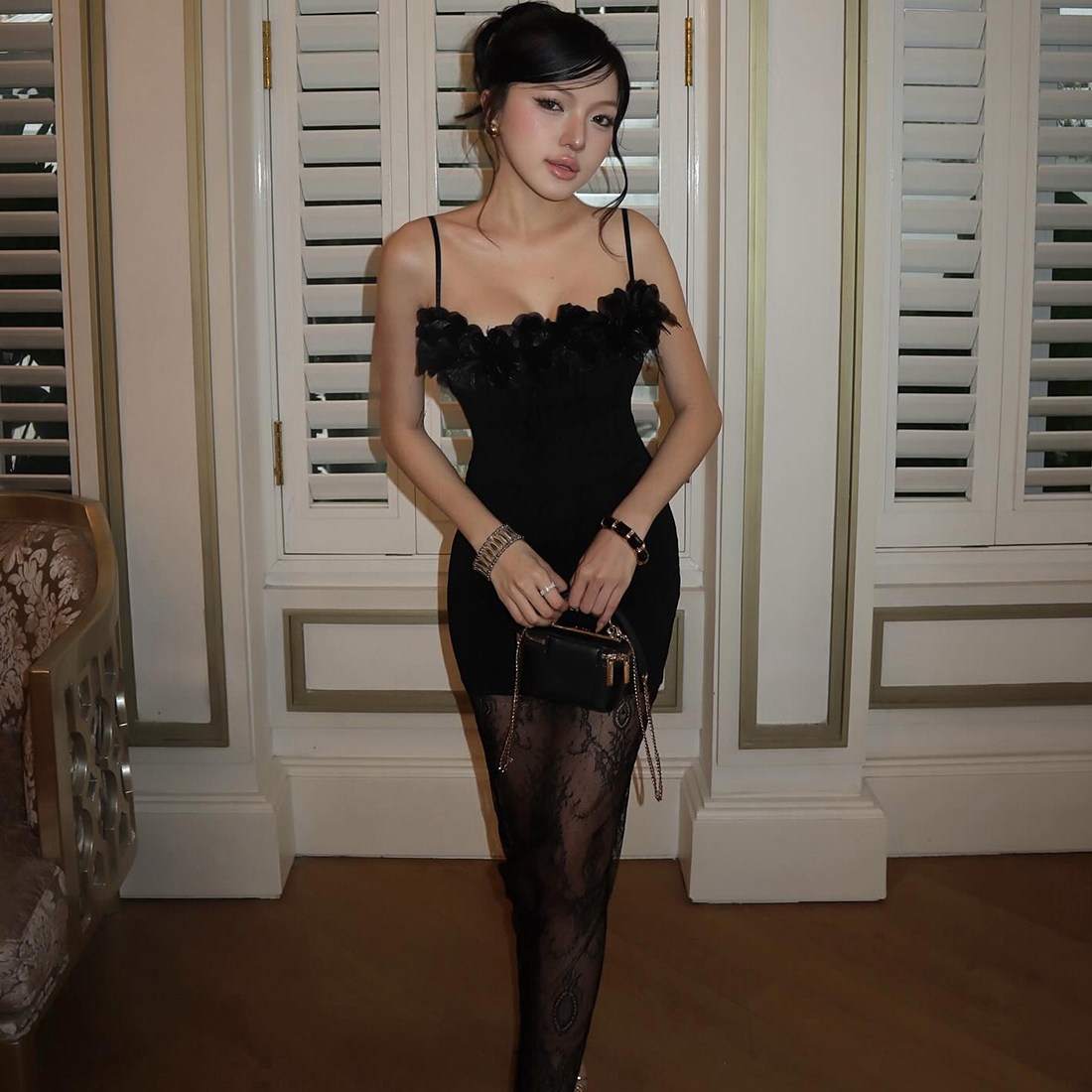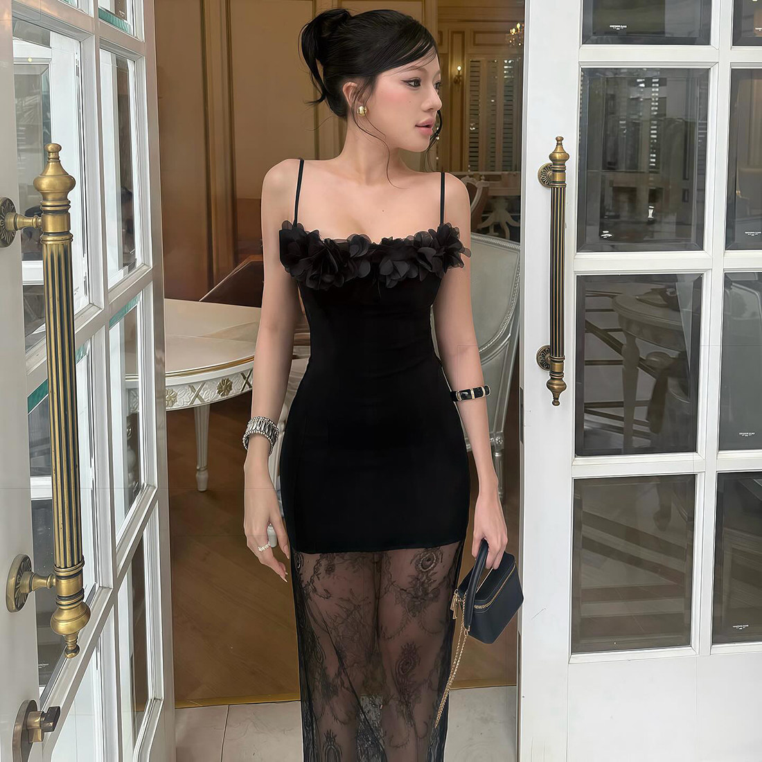 SylCue 钓系姐姐辣妹风黑色蕾丝性感透视吊带连衣裙收腰百搭长裙