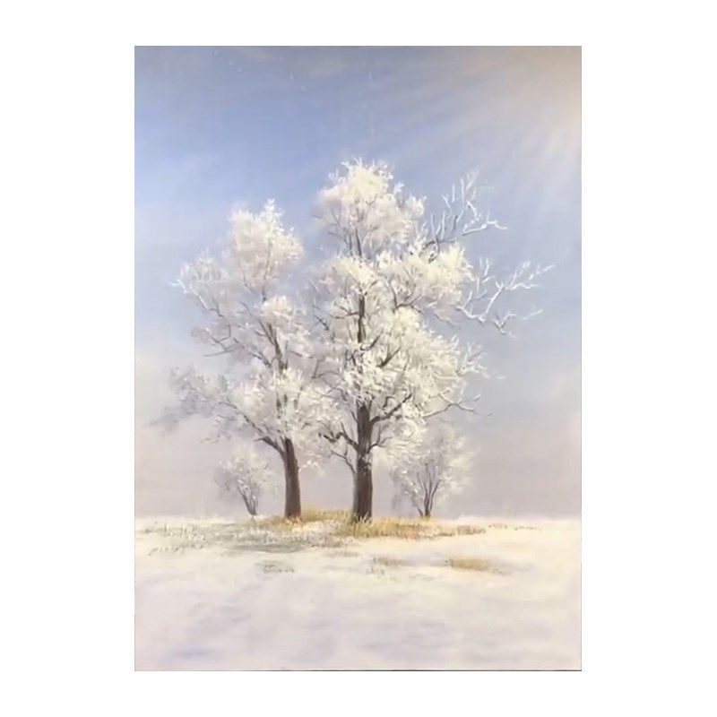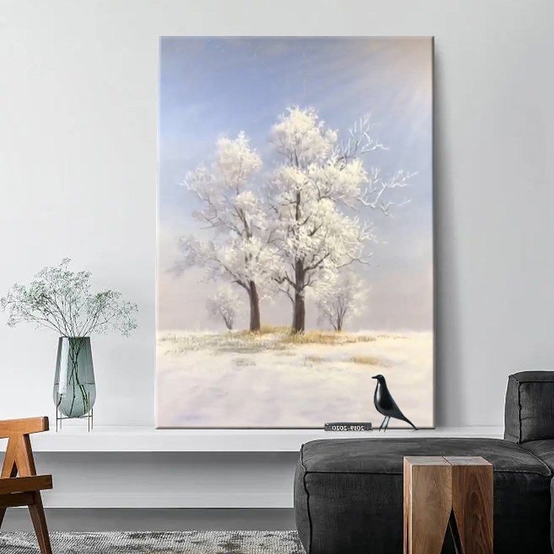 冰天雪地白杨树手绘油画雪景日出纯白色装 饰画客厅挂画玄关肌理画