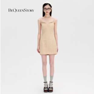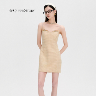 包臀吊带连衣裙短款 BeQueenStory26早春新款 棕假两件毛呢钻边修身