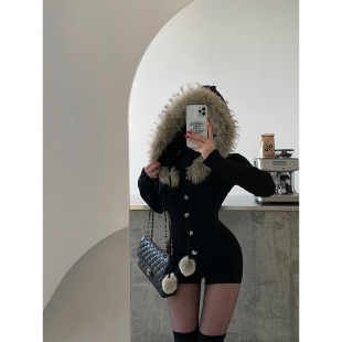 YoungGirlDay纯欲辣妹性感毛领连帽抽绳单排扣长袖 针织连体衣短裤