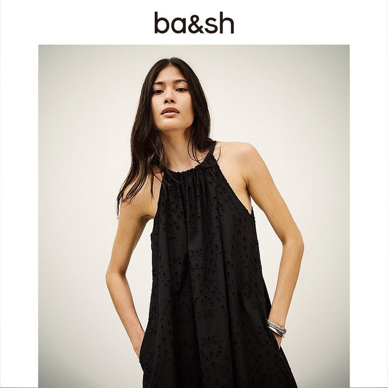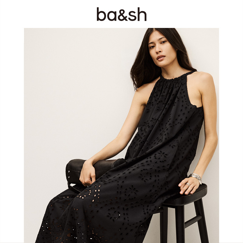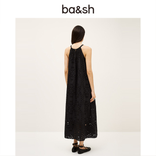 bash春季 宽松度假风刺绣镂空连衣裙挂脖吊带黑色长裙1H25BONI 法式