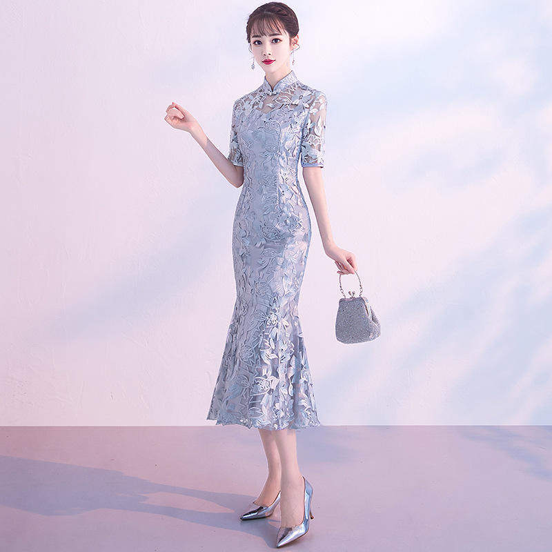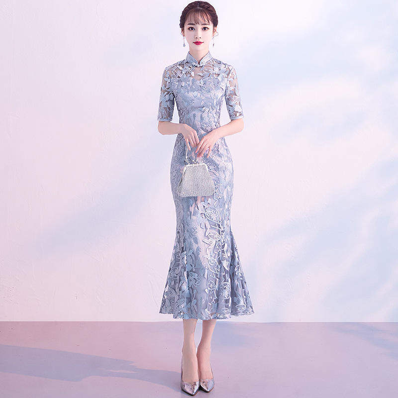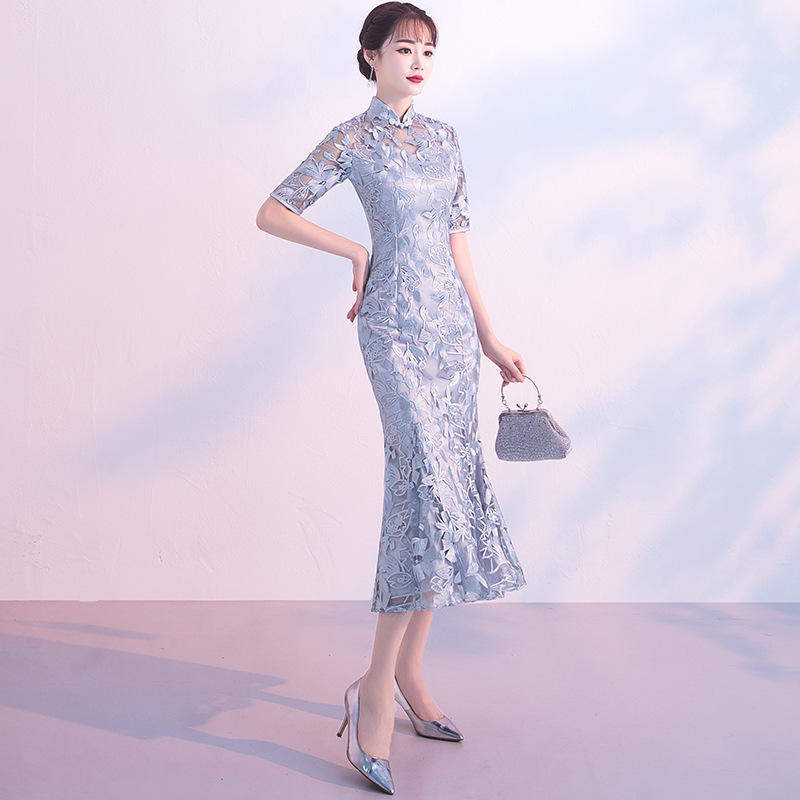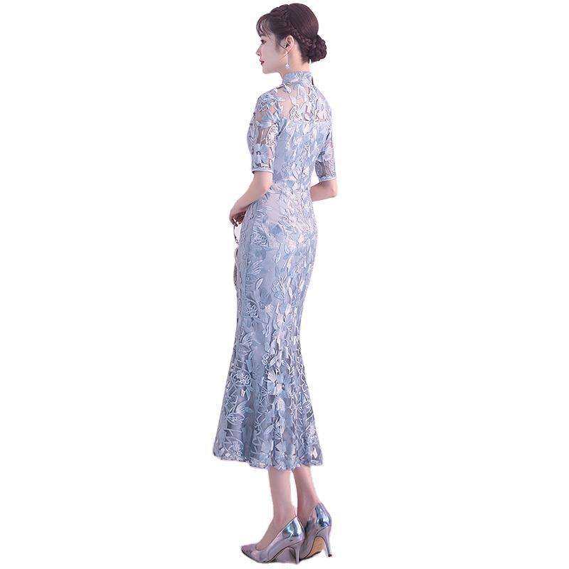 连衣裙女技师服显白性感开叉裙 复古典舞蹈旗袍网纱长袖 秋季 新中式