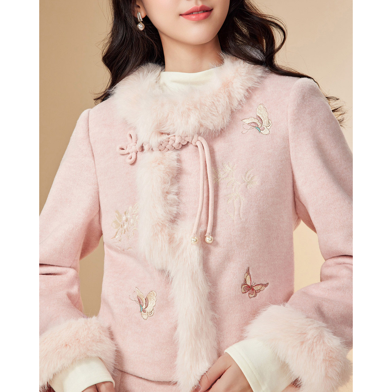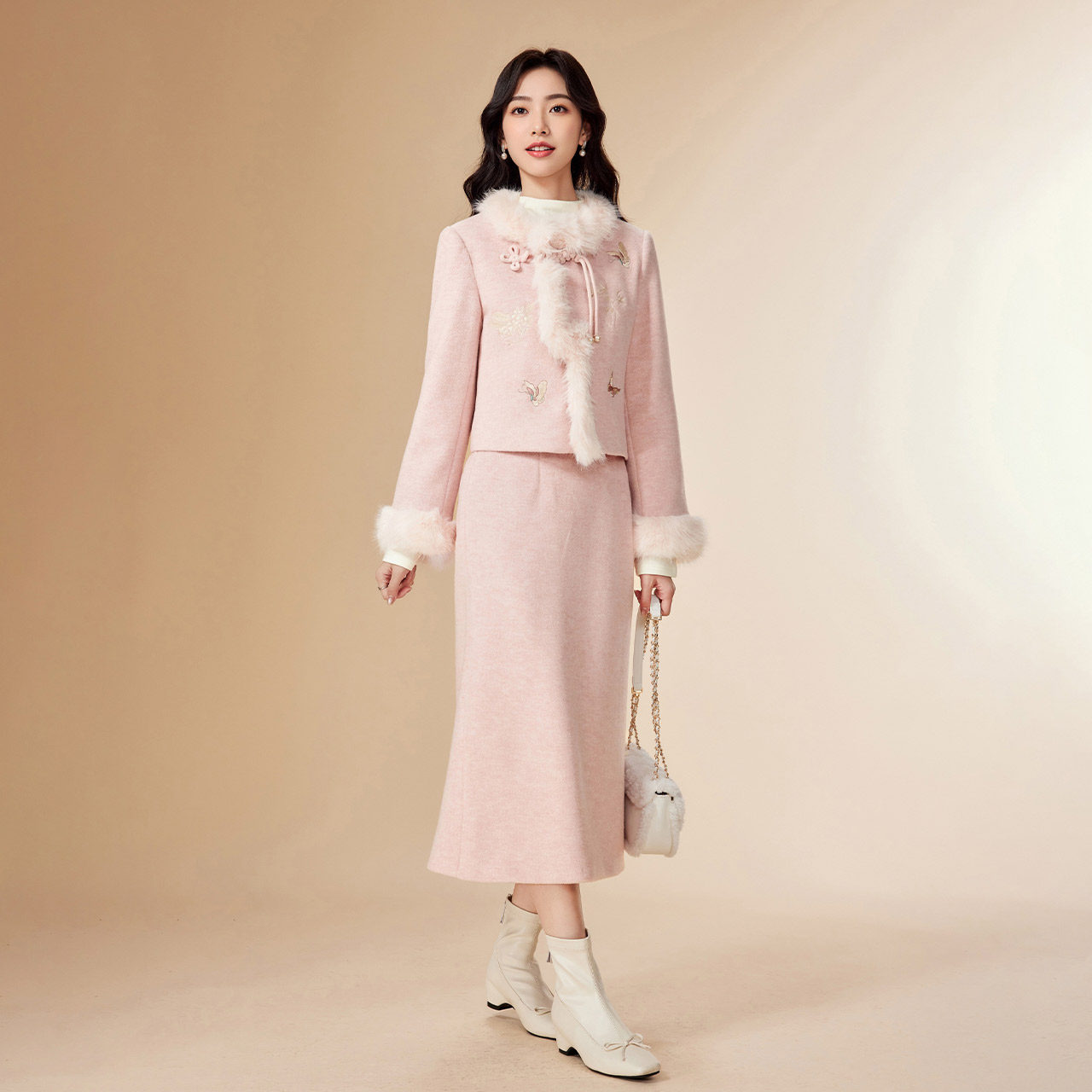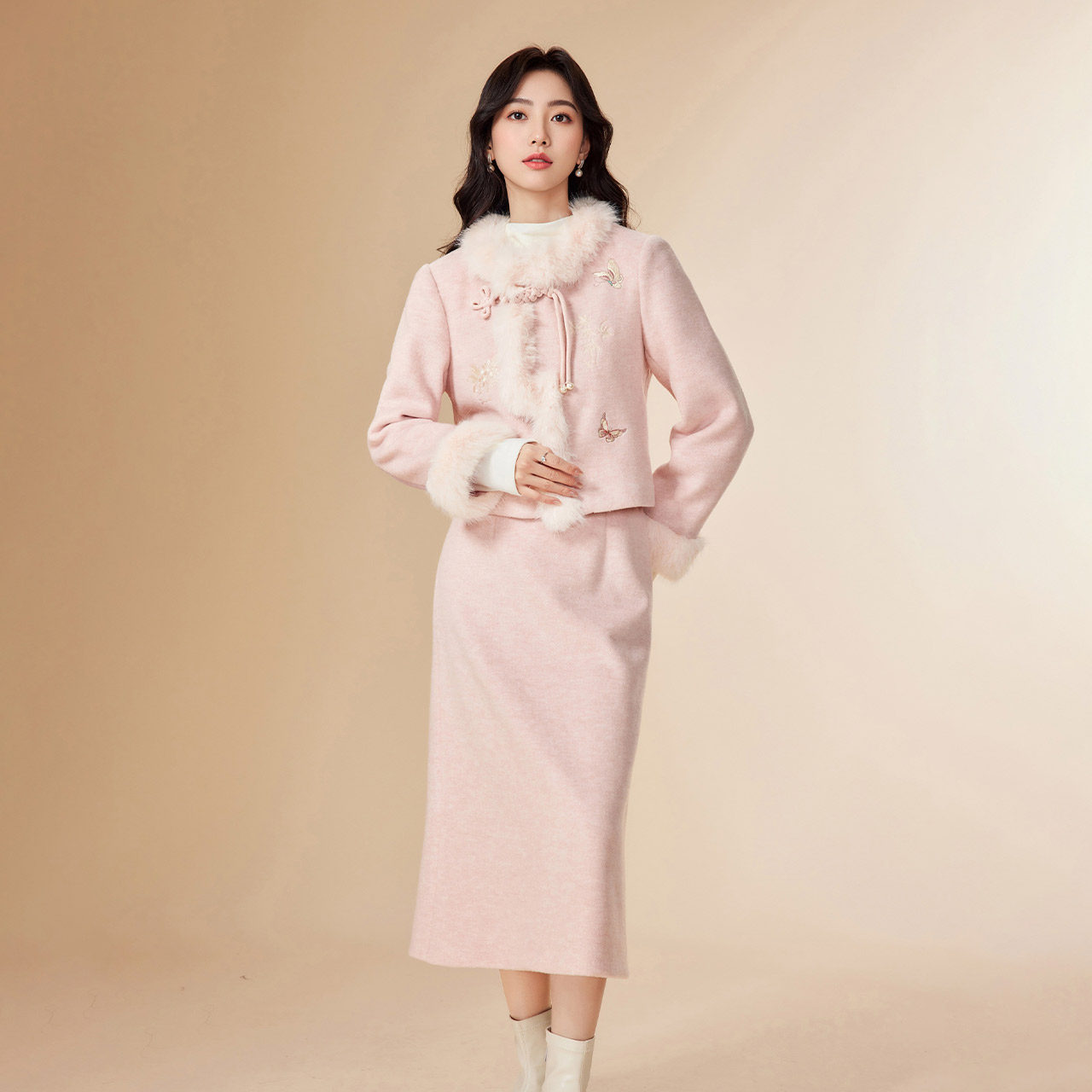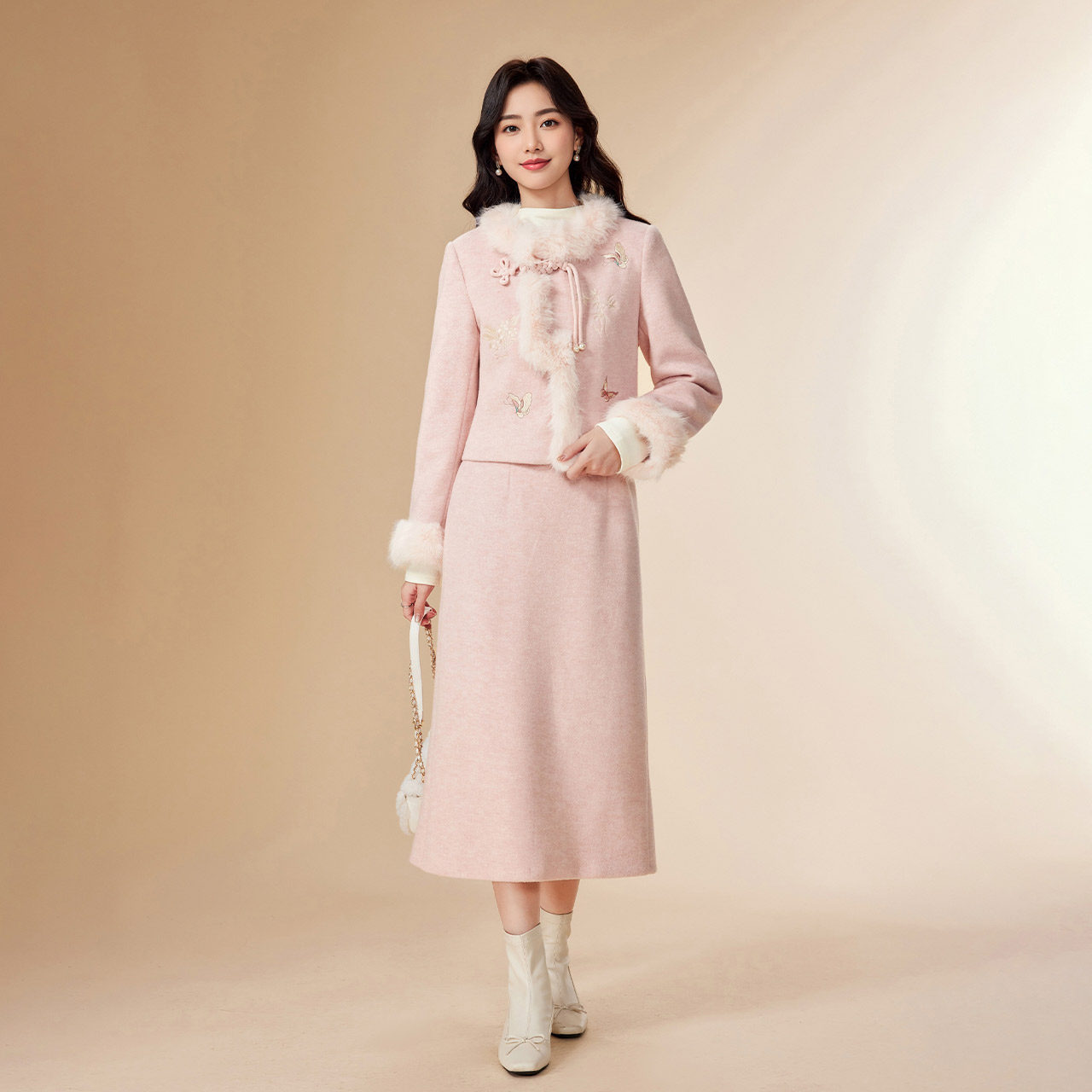上下套长裙温柔风毛绒领刺绣名媛千金套装 新款 爱依服2025冬季 IEF