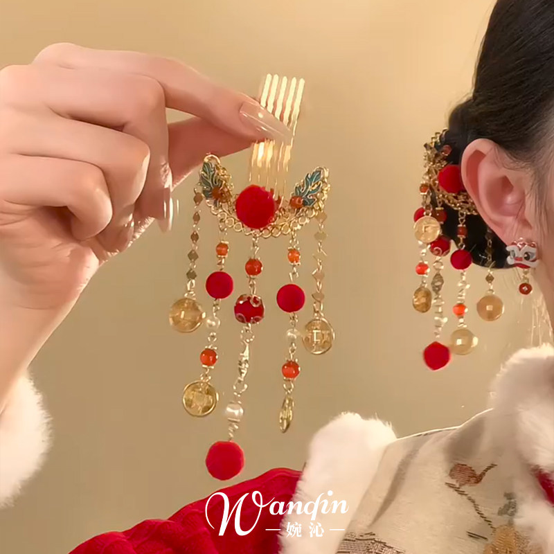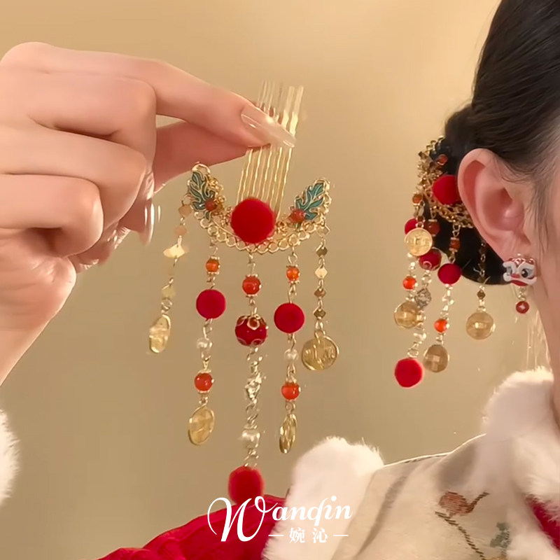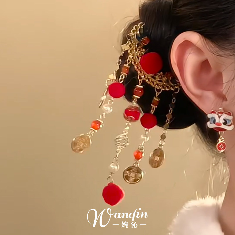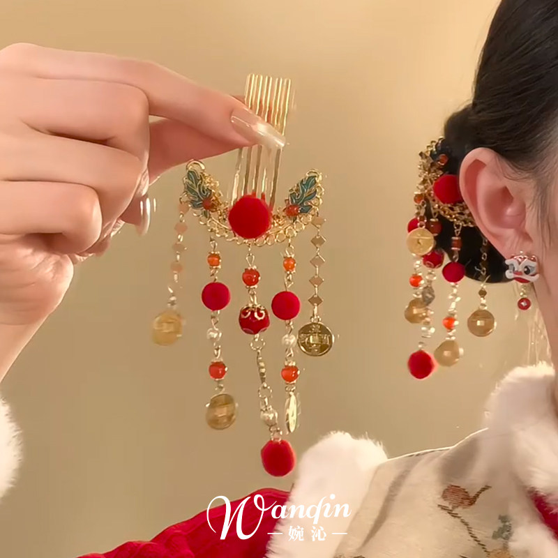 新年发饰女童过年发夹2025龙年头饰儿童古风流苏假发红色女孩夹子