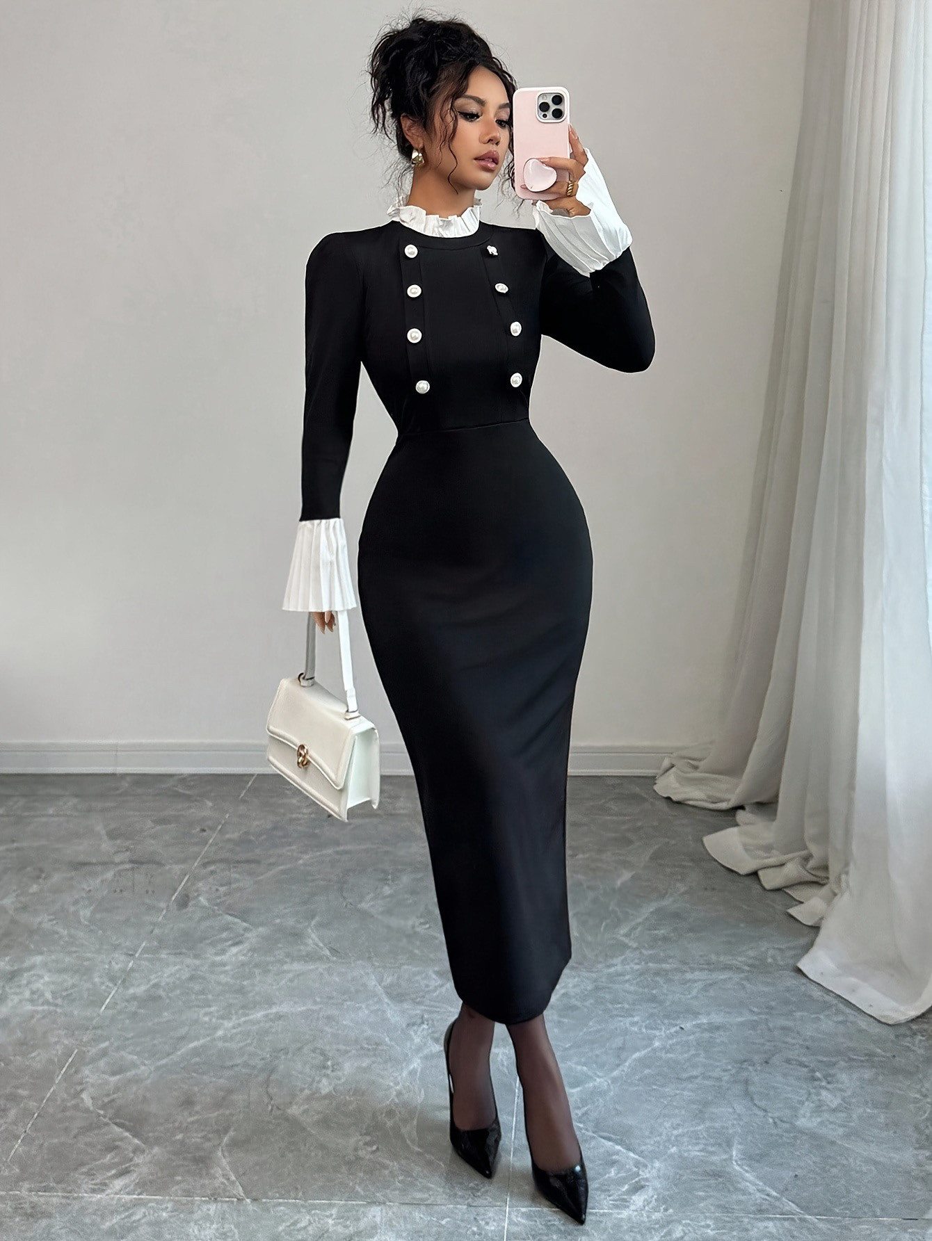 SourceWithU 2色贵气感漂亮小裙摆风琴褶连衣裙V领背心裙 A市千金