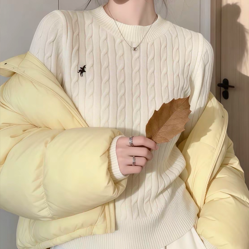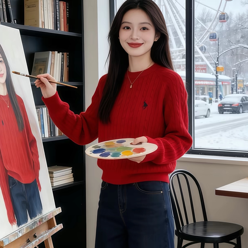 显瘦上衣 女内搭针织修身 红色毛衣冬厚2026新款 小马绣花圆领打底衫