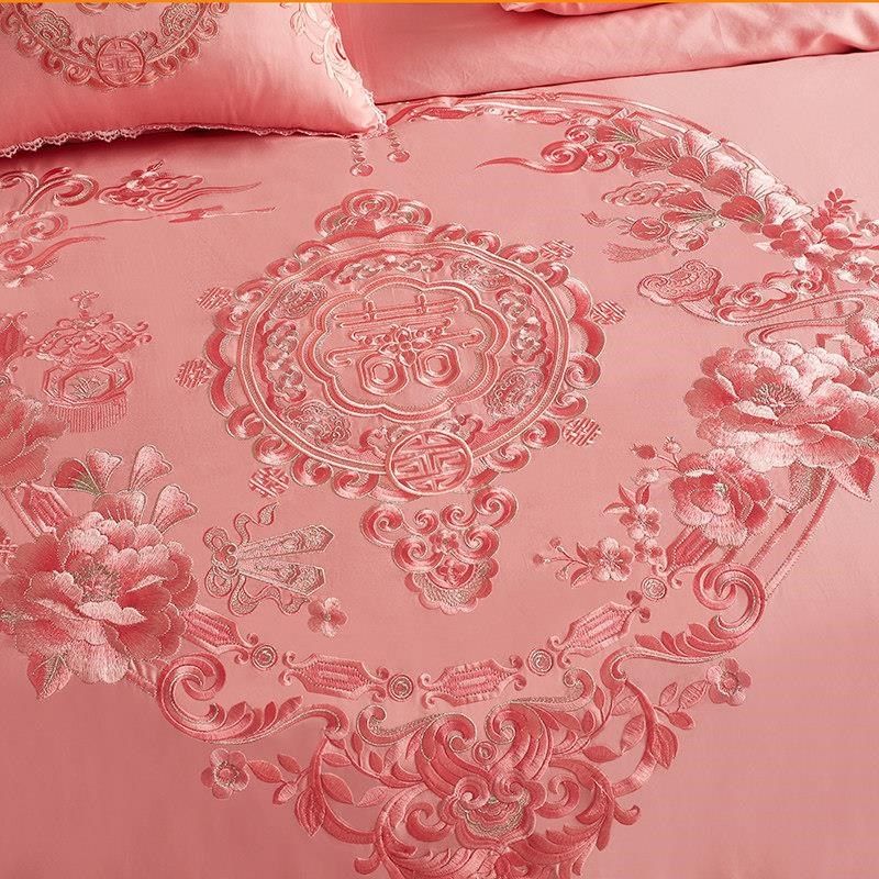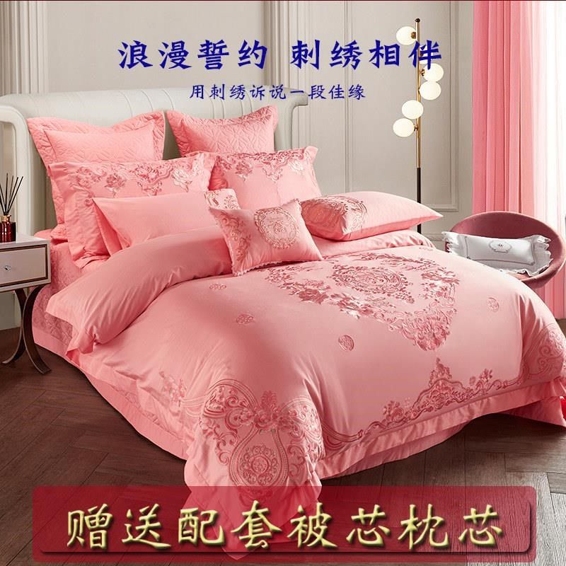 新款 140支全棉婚庆四件套刺绣纯棉结婚粉色被套床单新婚六十床上