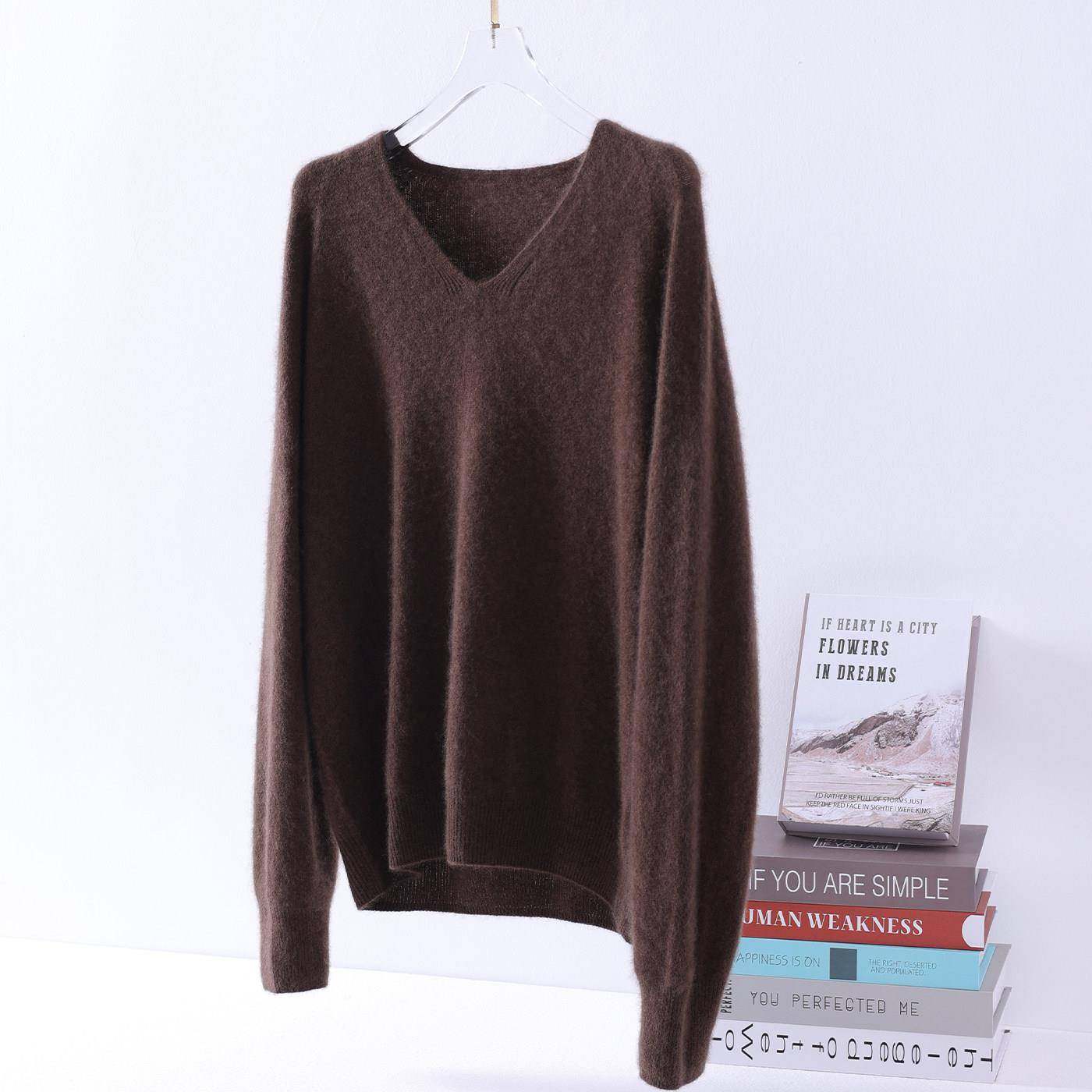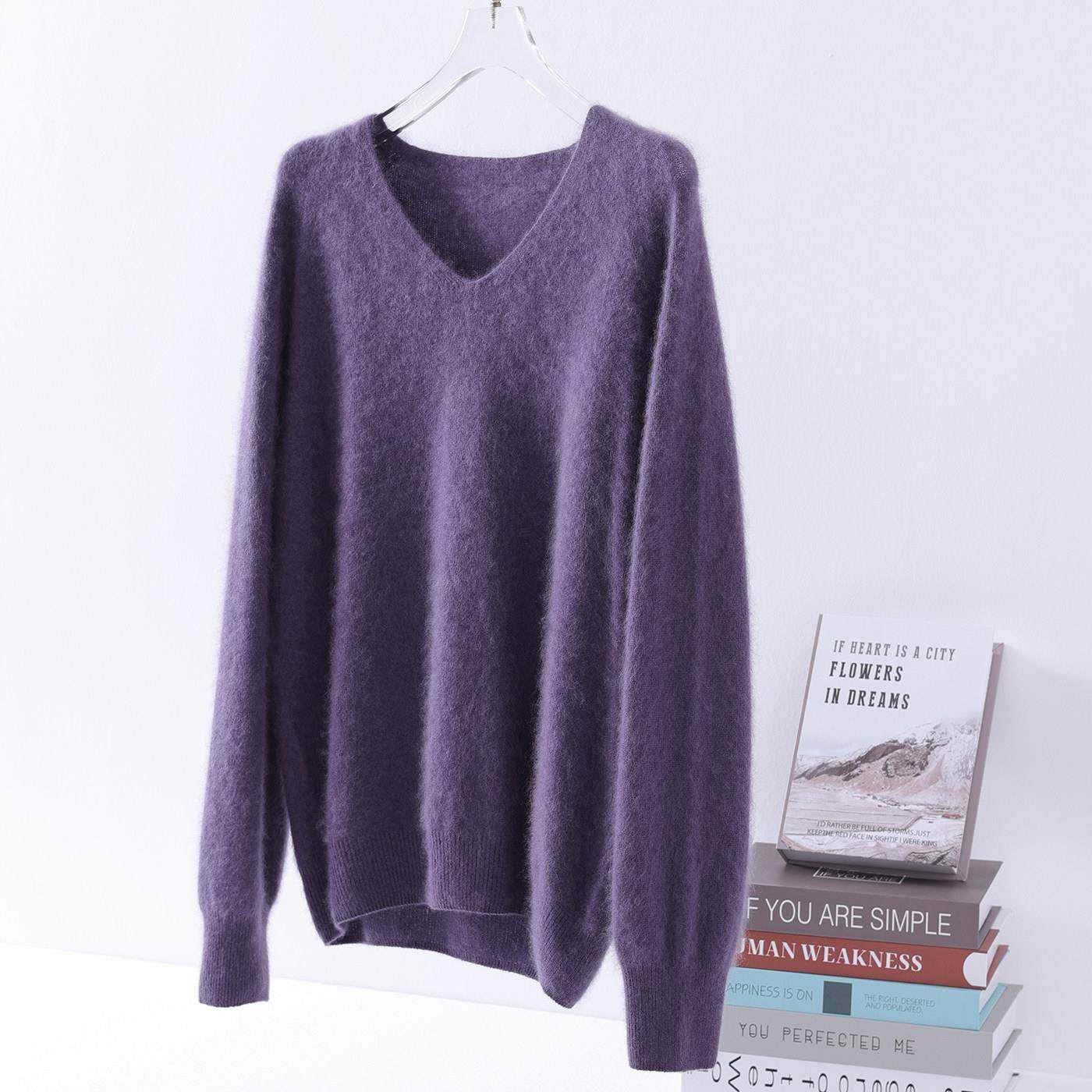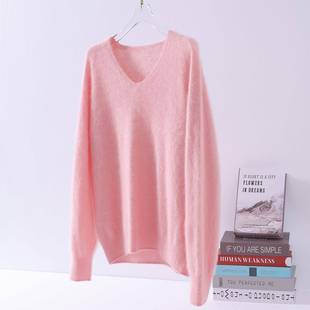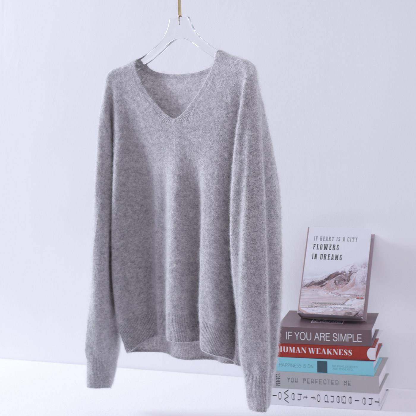 套头毛衣 V领保暖打底衫 高奢无缝一体拉绒羊绒羊毛衫 女蓝色秋冬季