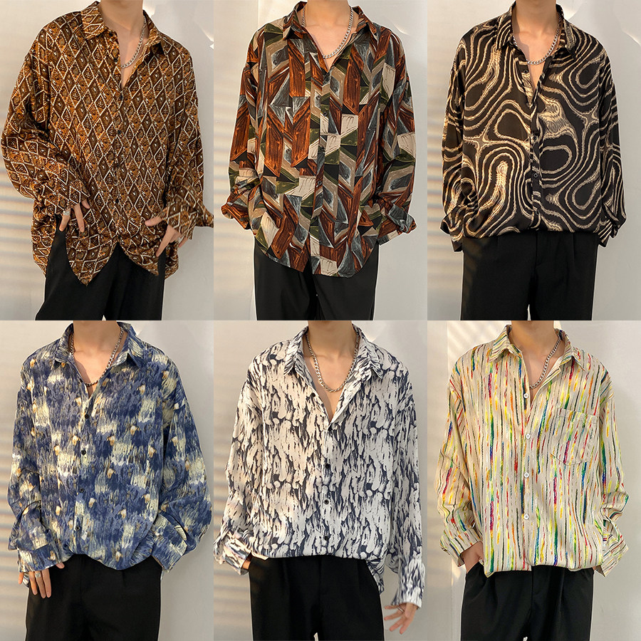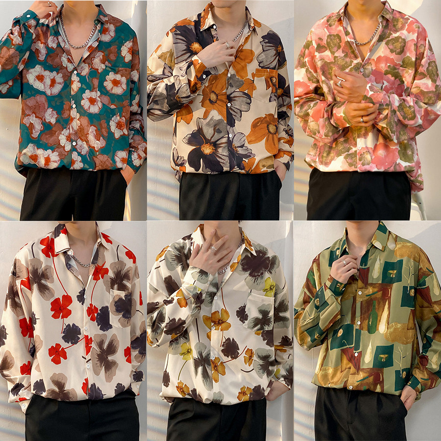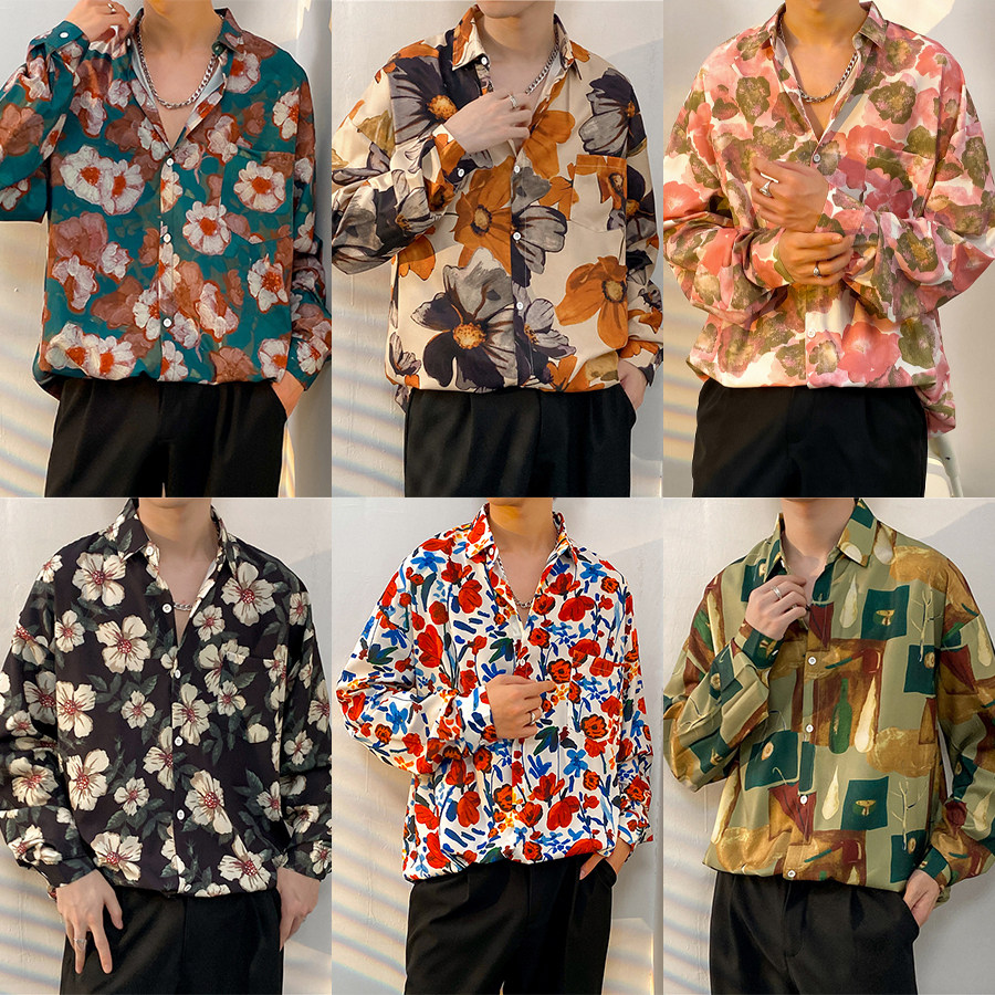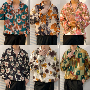 港风古着花衬衫 帅气宽松vintage痞帅衬衣ins外套男 80年代复古长袖