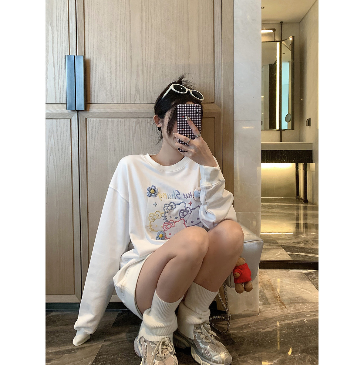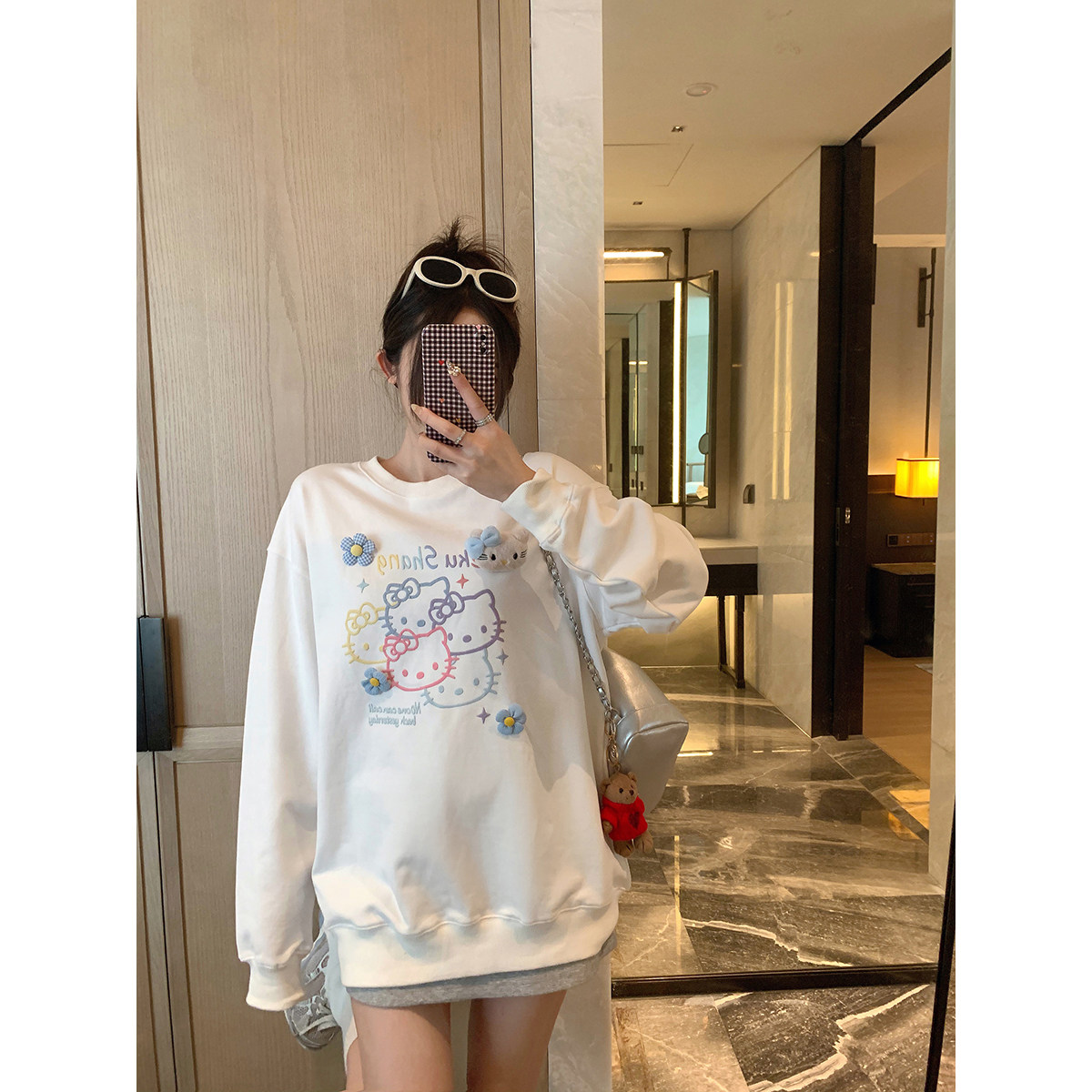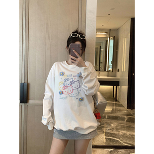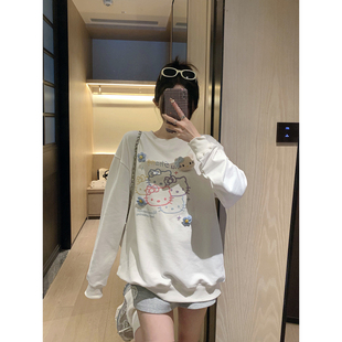 庄大泥 k猫印花圆领卫衣女宽松休闲百搭上衣 棉雪白2025秋冬新款