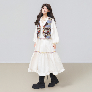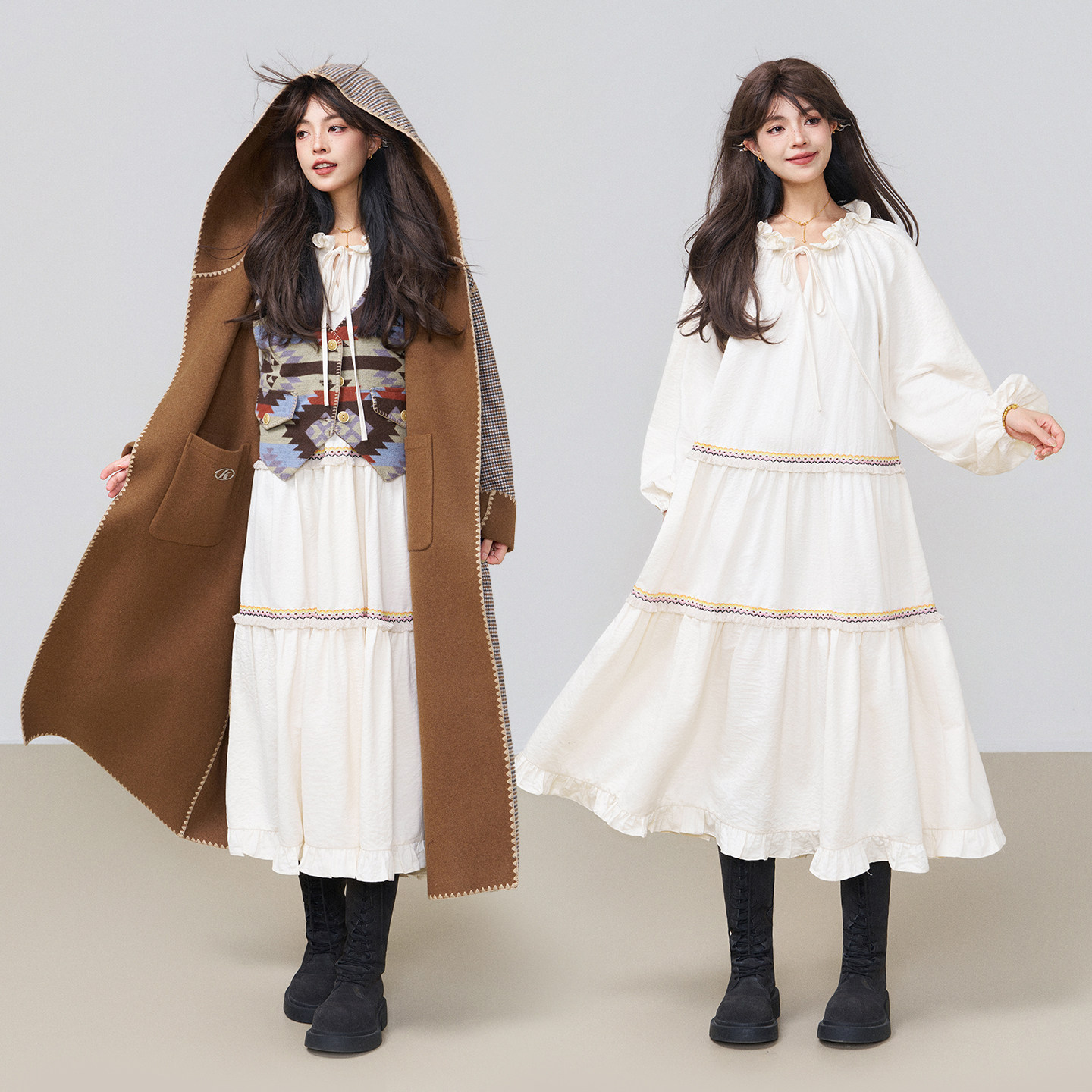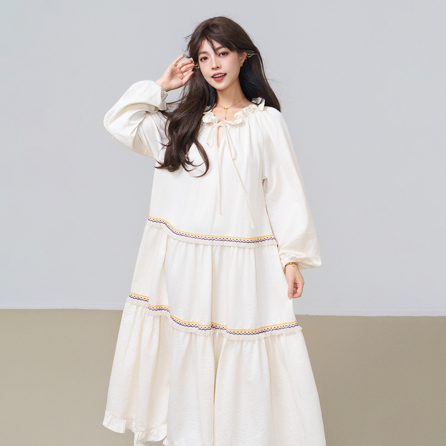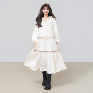 波西米亚风拼接灯笼袖 提花织带白色连衣裙春季 A字长裙 法式 KEIKO
