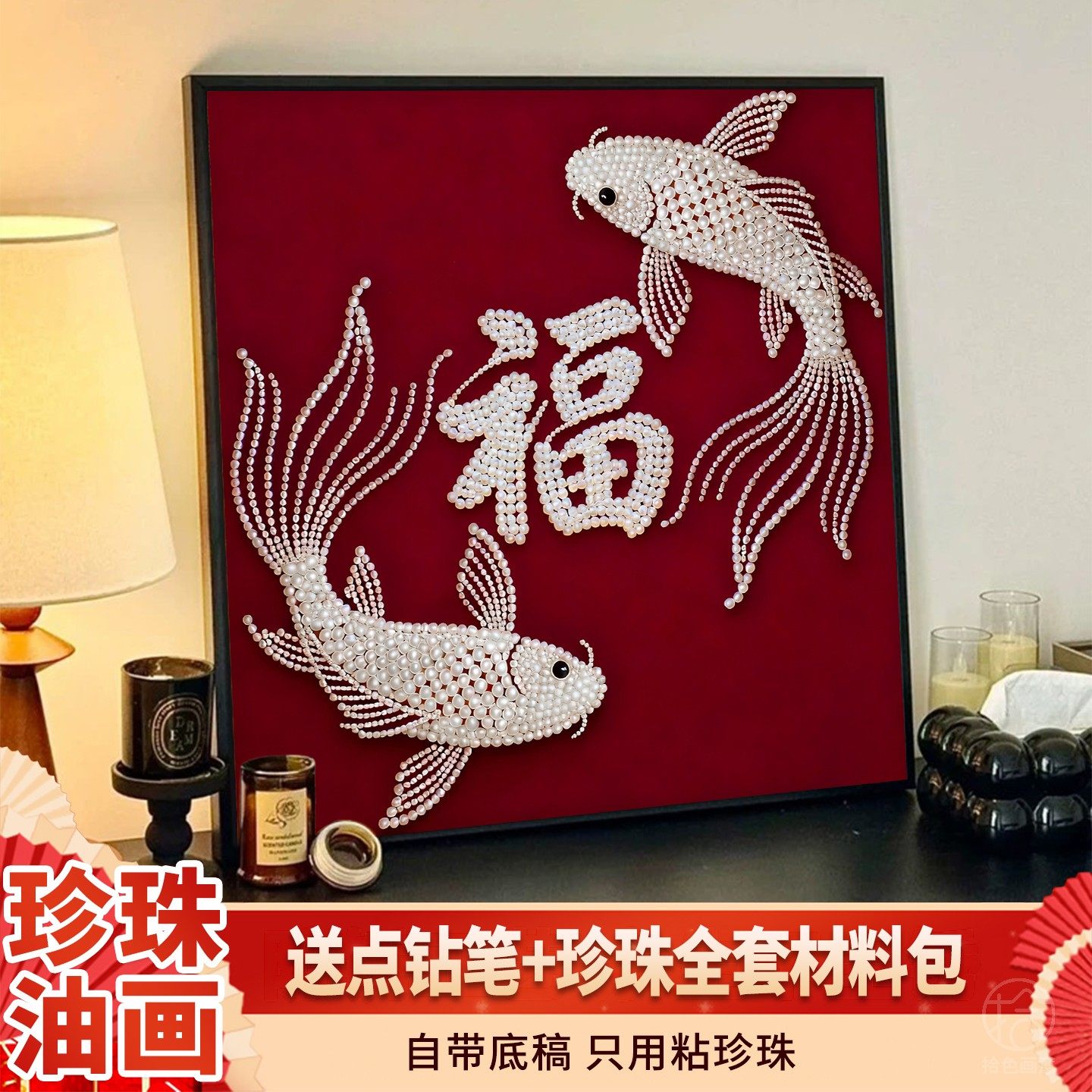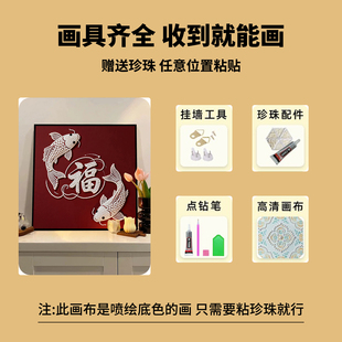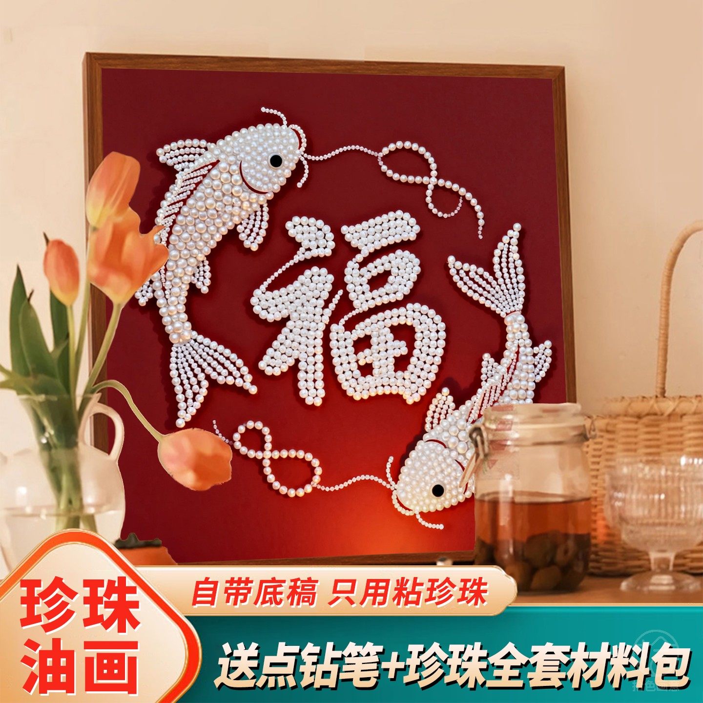 中国风年年有鱼福字珍珠画diy材料包手工活动新年数字油画装 饰画