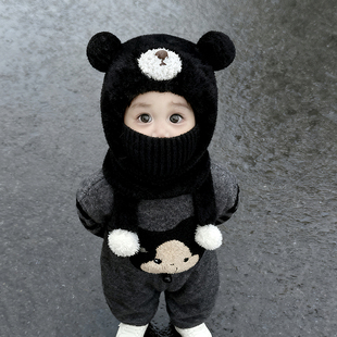 一捏会叫宝宝帽子围脖口罩一体护耳帽秋冬保暖男女儿童套头小熊帽