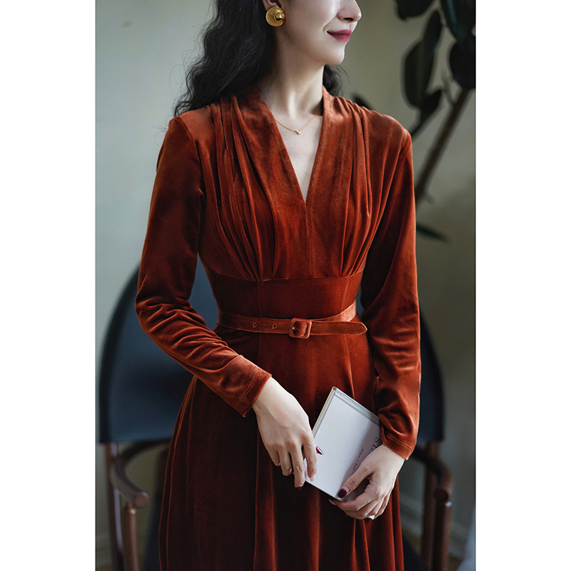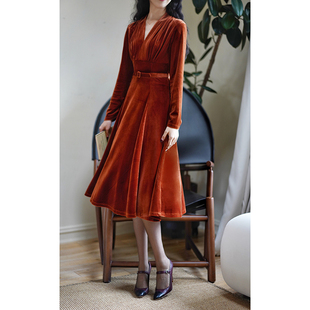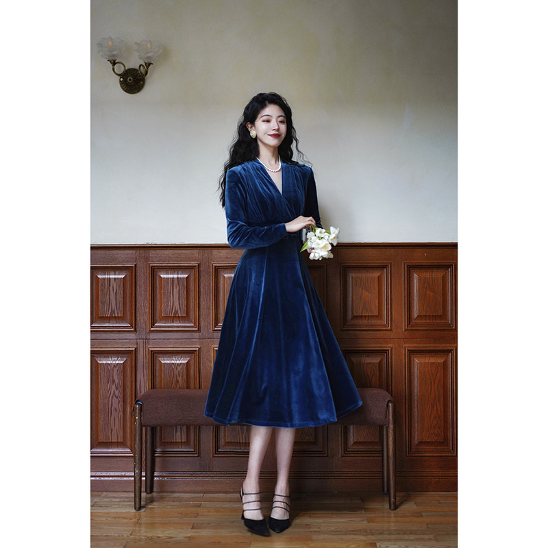 连衣裙礼服 收腰长袖 2025秋冬新款 藏蓝色千金风针织拼接塔夫绸修身