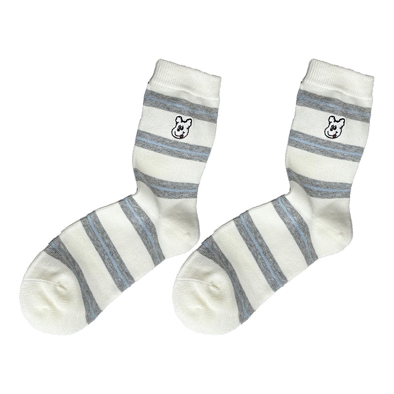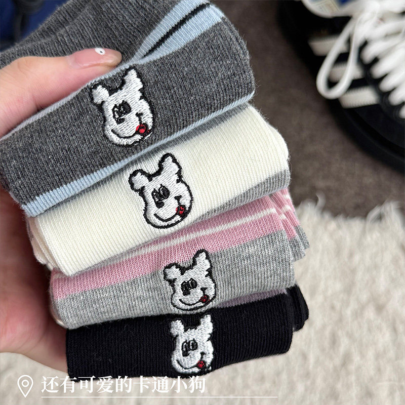 条纹袜子女中筒袜春秋灰色纯棉ins日系卡通可爱小狗无骨长袜韩系
