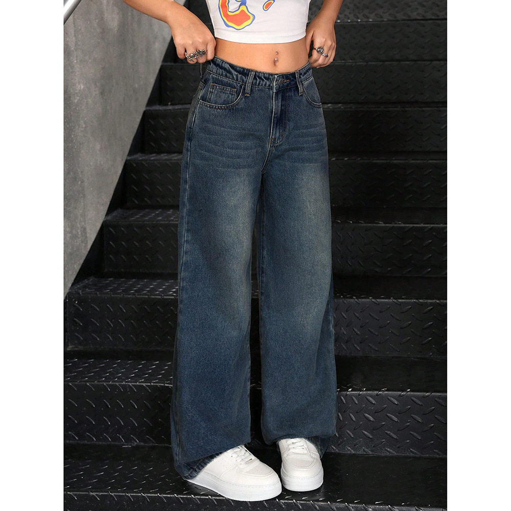 子 胖mm宽松高腰显瘦阔腿拖地裤 梨型身材复古加绒牛仔裤 女秋冬大码
