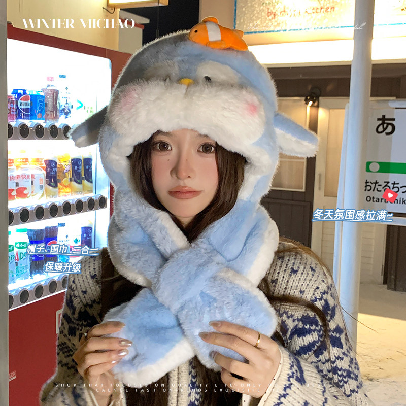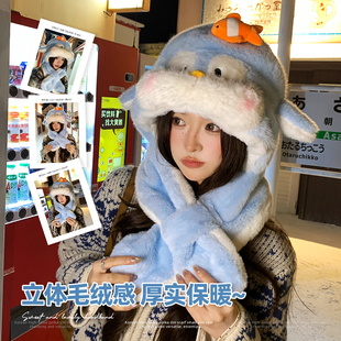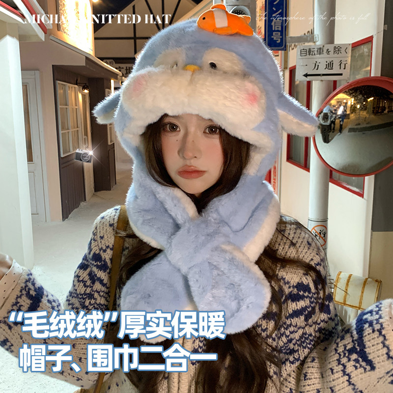 可爱企鹅毛绒帽女2025新款 冬耳朵会动帽子围巾一体保暖加厚雷锋帽