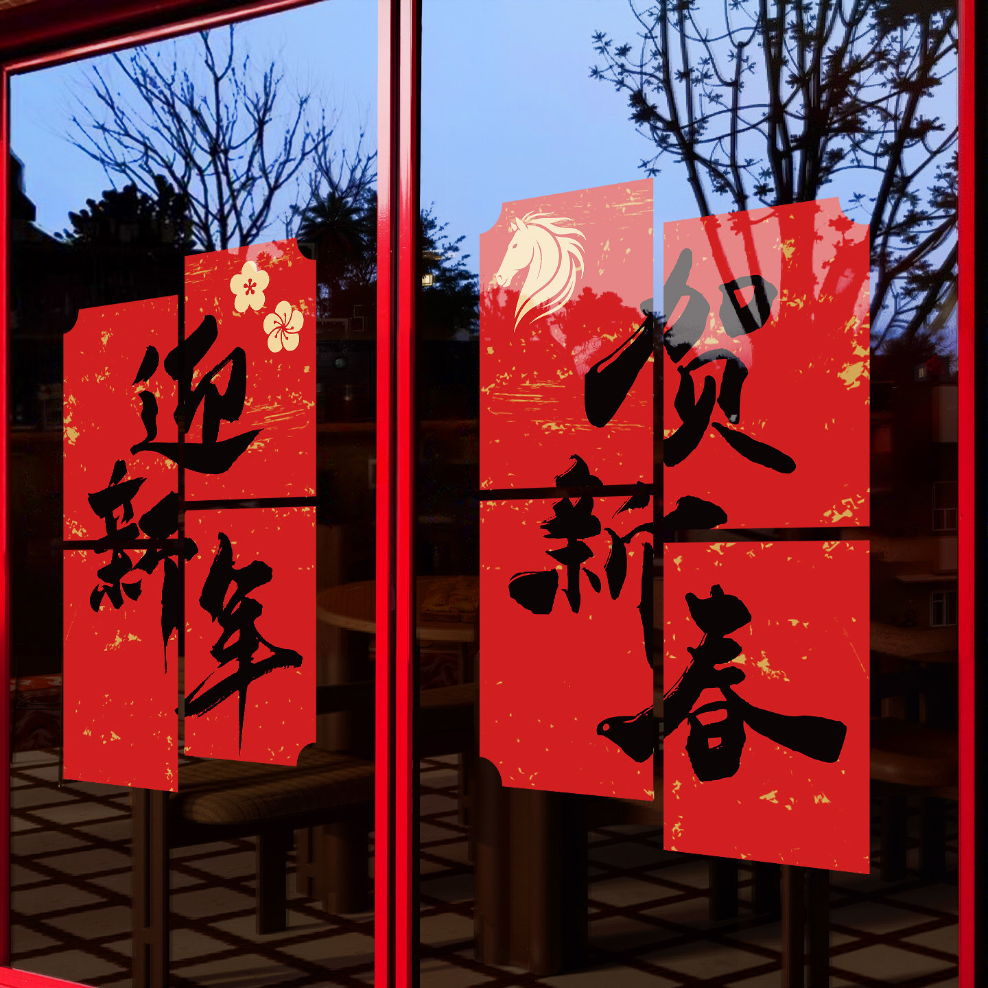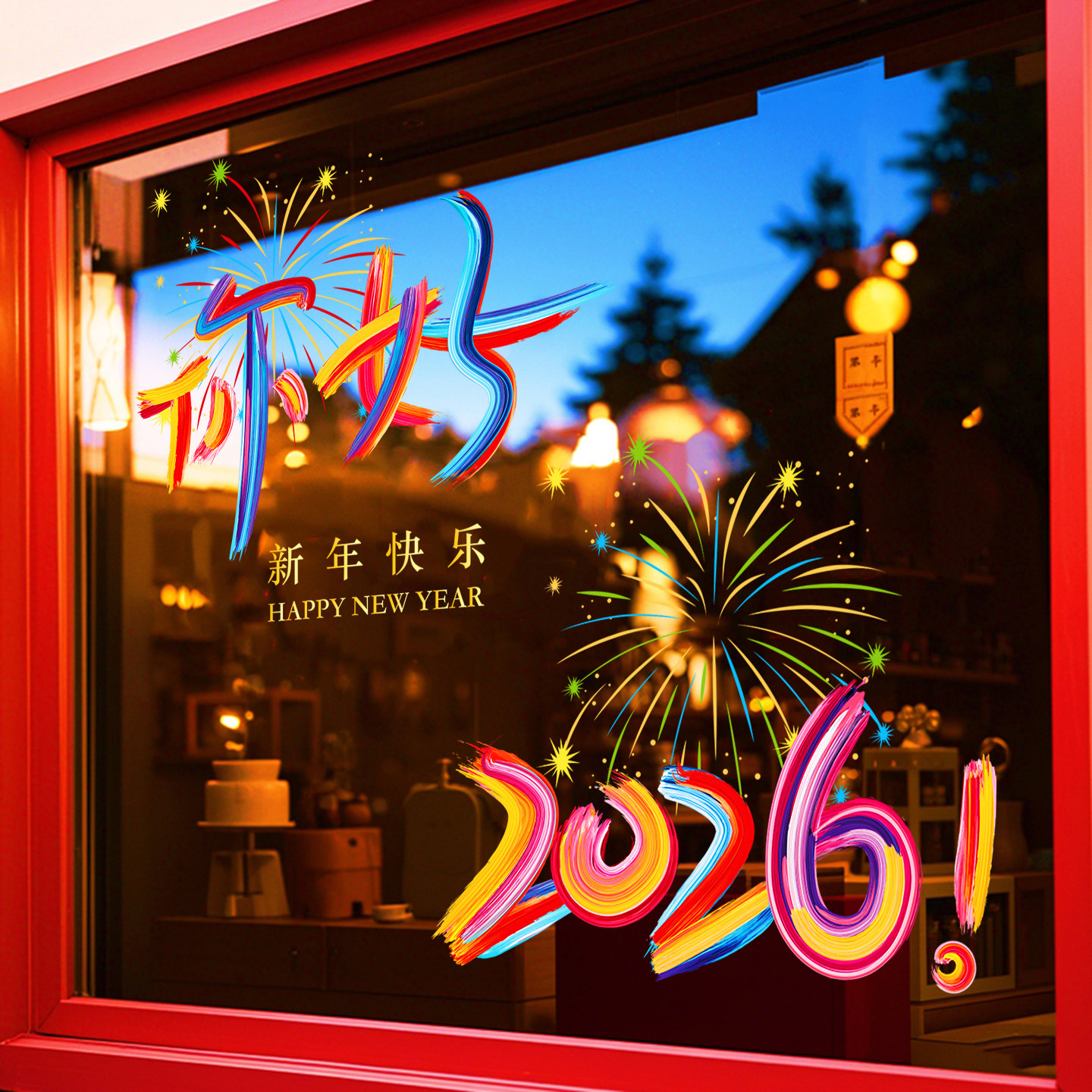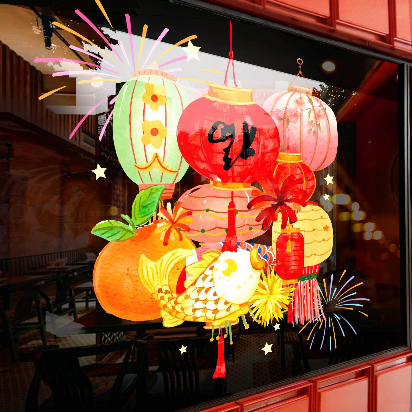 2026新年装 饰品玻璃门贴纸春节橱窗过年卡通福字灯笼静电窗花贴画