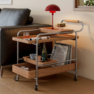 实木可移动边几中古收纳小推车客厅沙发储物置物架胡桃木色餐车