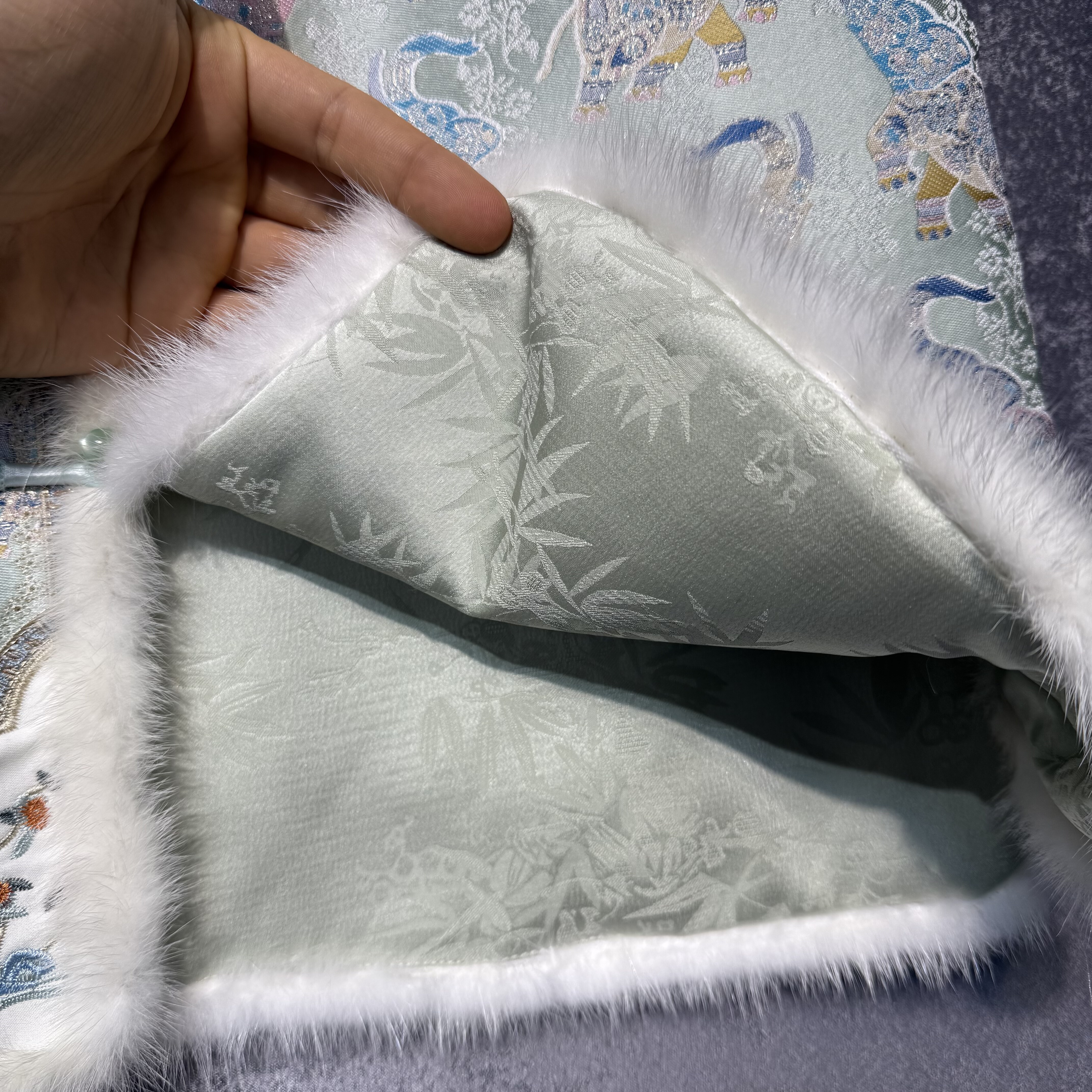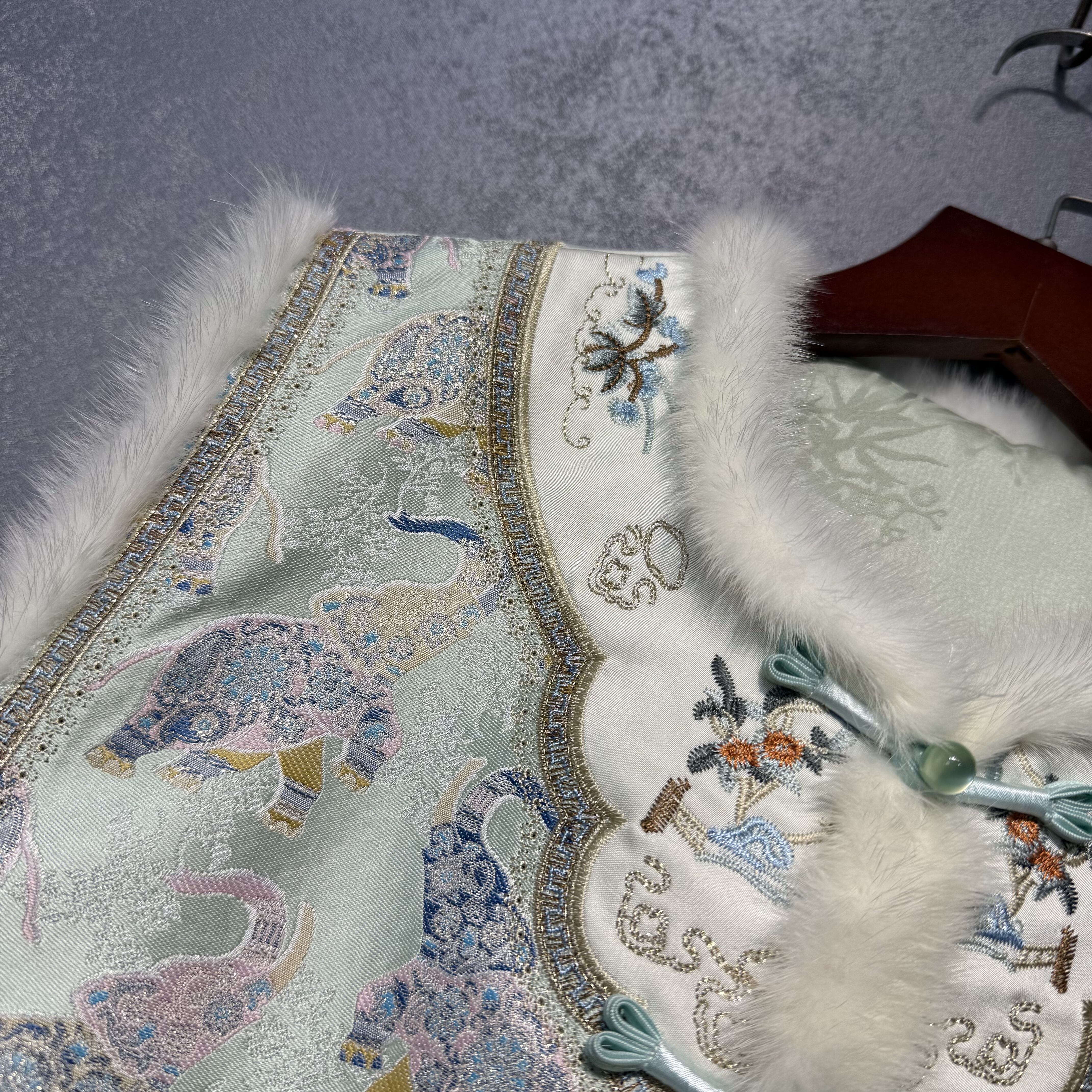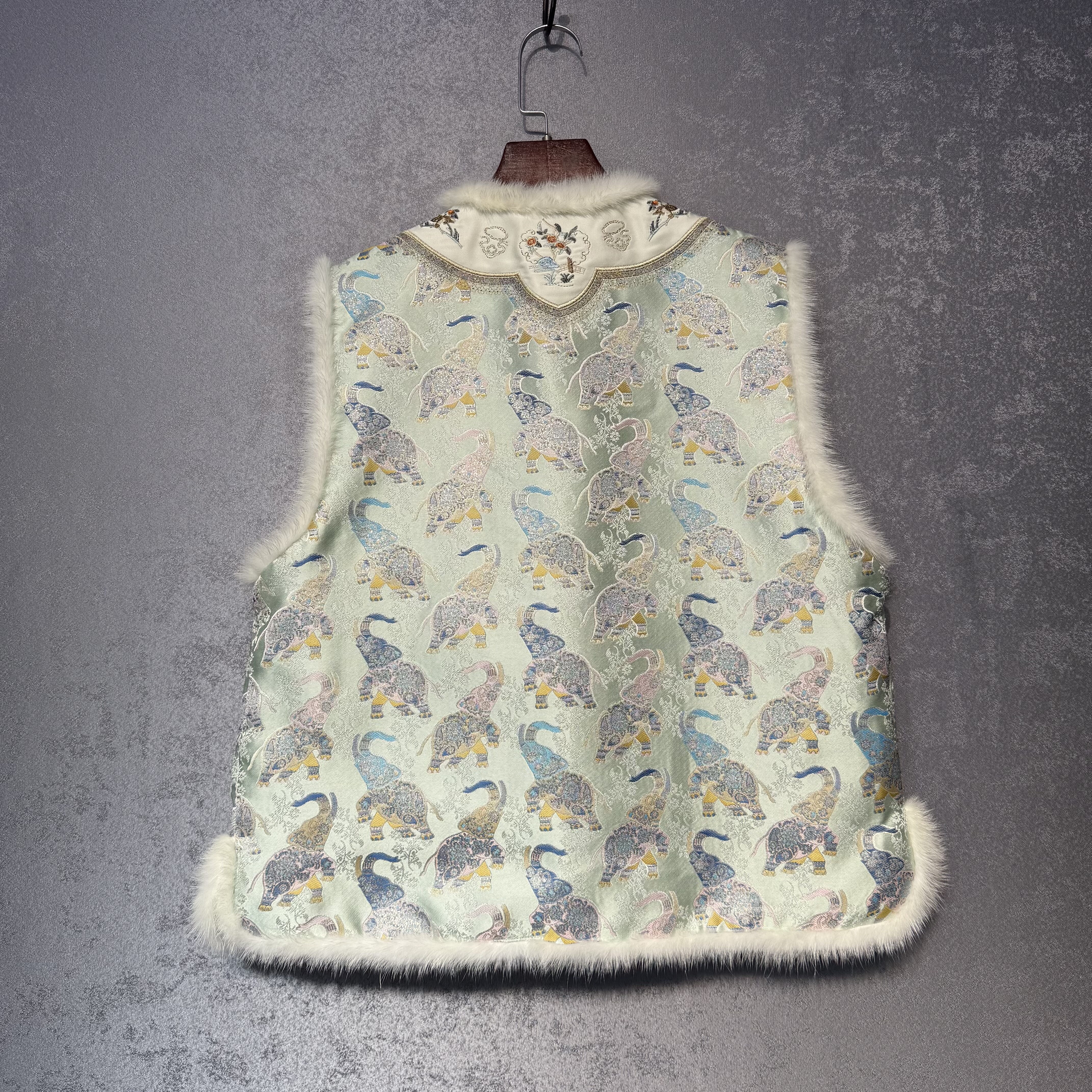 真丝貂毛新中式 新款 2025冬季 重工刺绣改良马甲外穿女 冰蓝小象